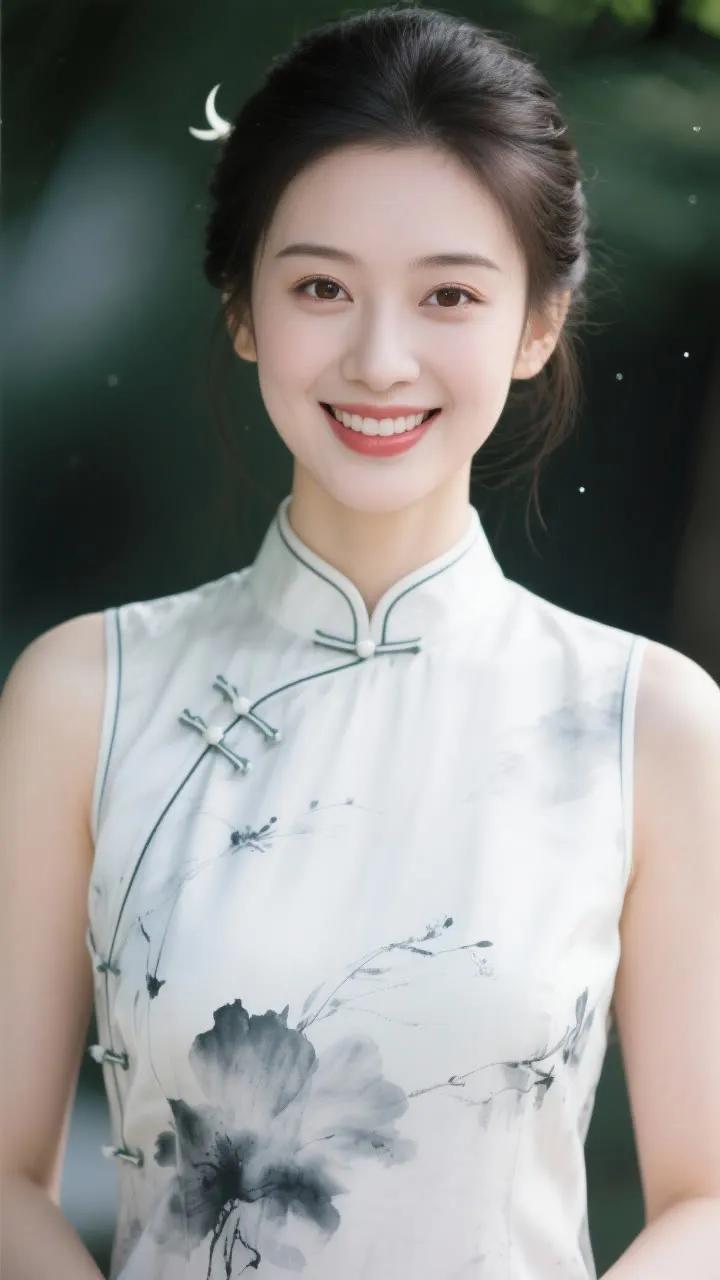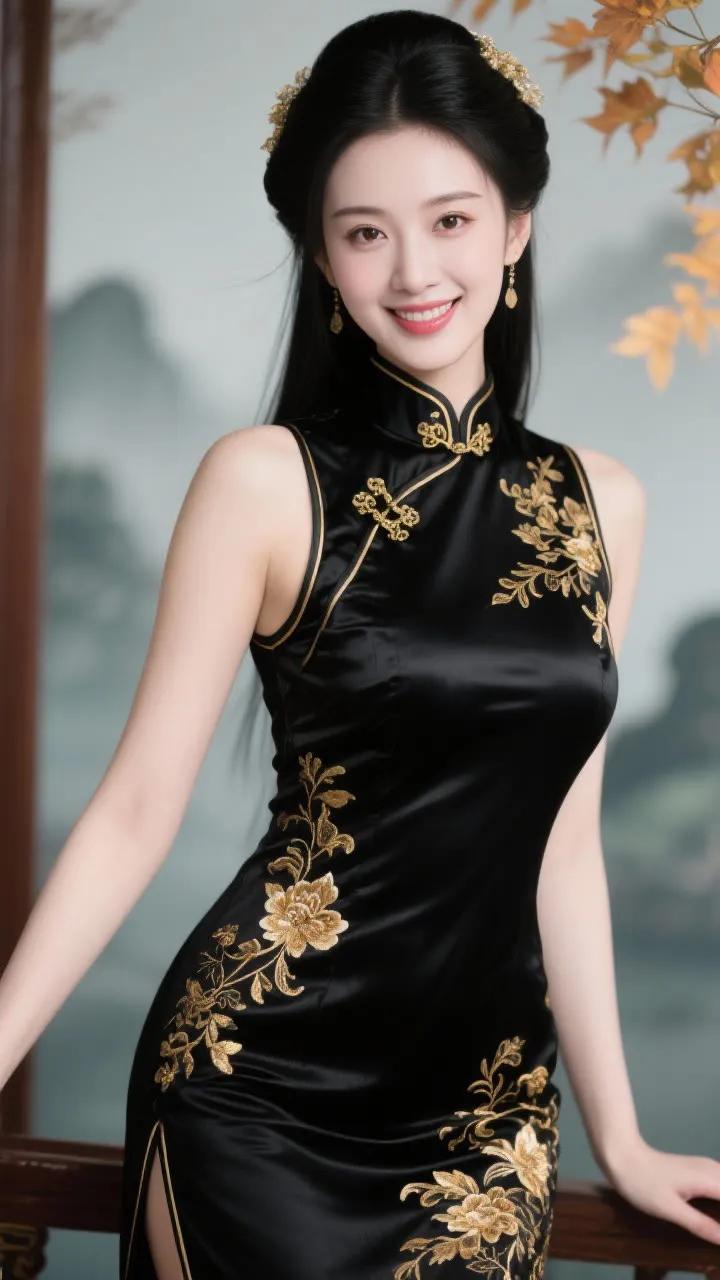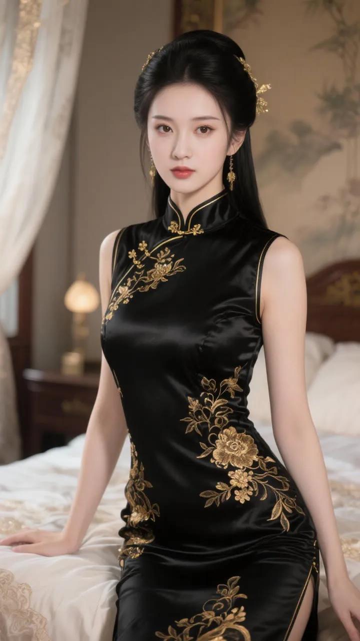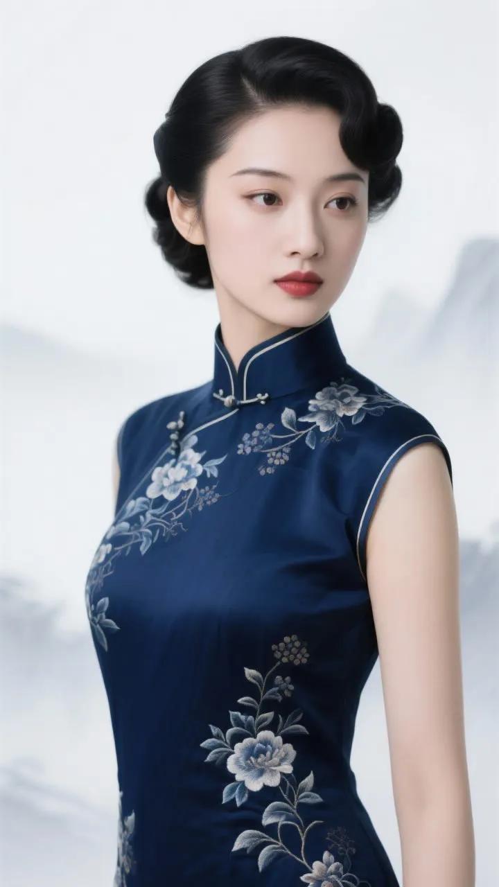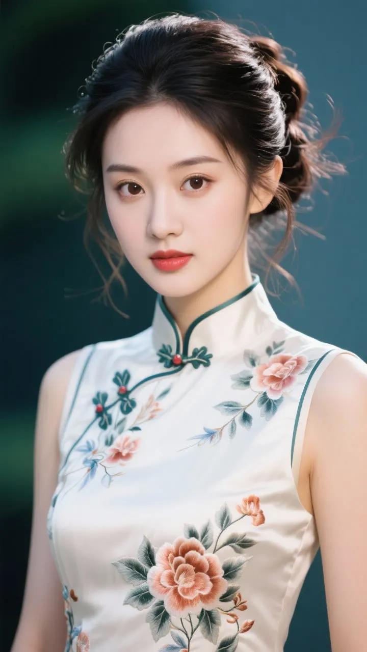 优雅旗袍少女,红唇与黑发相映成趣,古典韵味十足。
