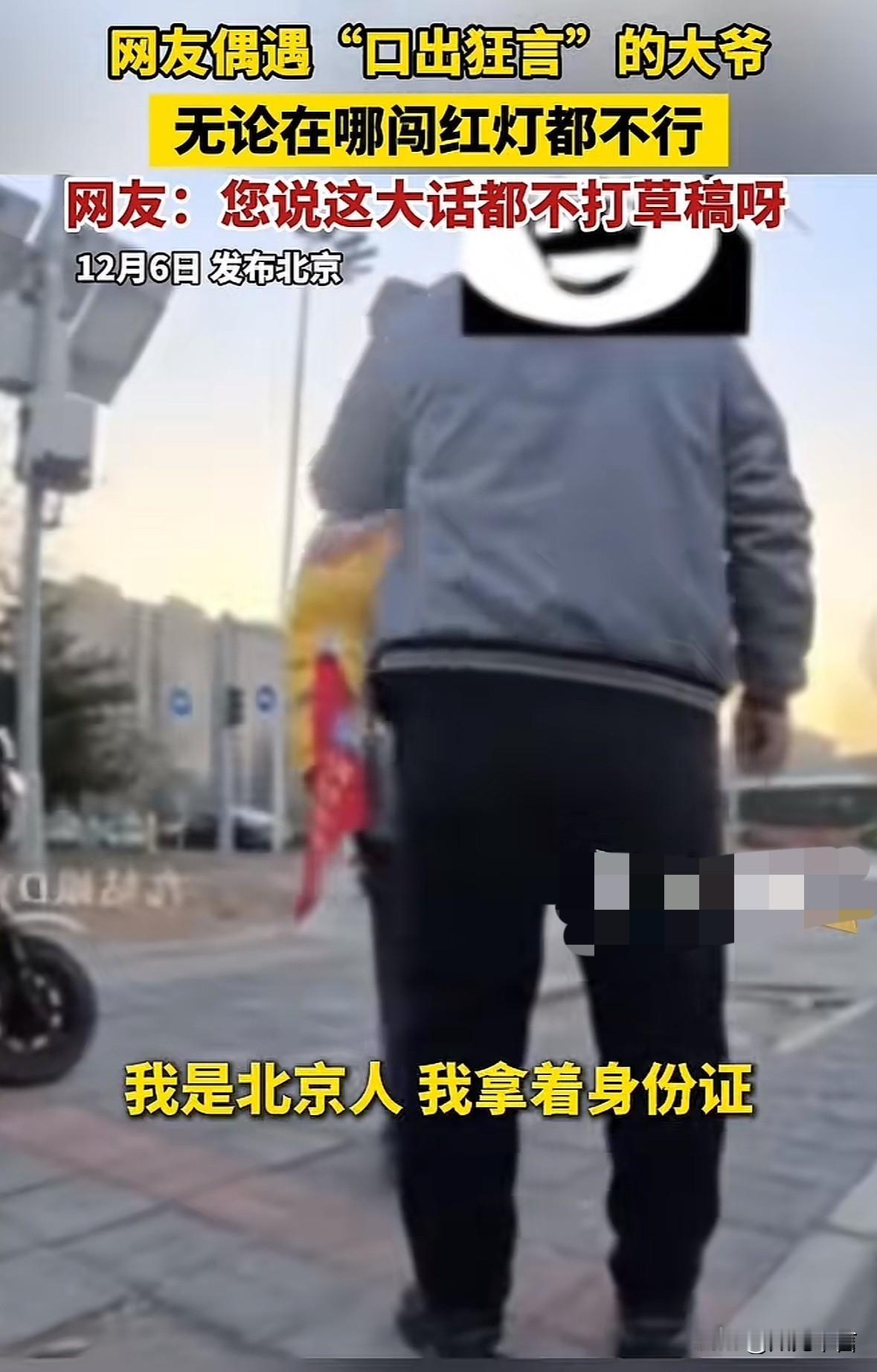这大爷太逗了,他问路边的文明劝导员,“自己是北京人,骑车闯红灯会不会被处罚” 劝导员说必须的,结果大爷来劲了、非说自己是北京人,交警见他都要让三分,就算犯了法派出所都不敢管他 大爷这番话把劝导员搞得都不会了,这大清都亡了一百多年了,怎么还有这种“八旗遗毒”在胡思乱想啊,以为自己是“八旗贵族”,可以目无王法吗 现实中真的会有这种人吗?