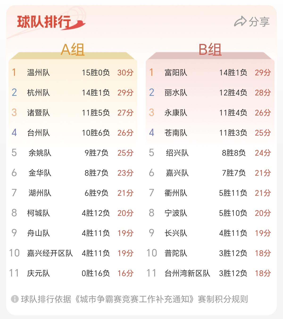 继昨晚温州队晋级8强之后,今晚的浙BA赛场上,富阳队以81:77衢州队的战绩,锁定小组赛8强出线。这样一来,A组和B组第一,均已经小组赛出线。 今晚另外两场比赛是,丽水队77:72永康队。绍兴队95:65普陀队。 在今晚的比赛过后,丽水队以12胜4负的战绩,积分排名上升至B组第二。永康队、苍南队紧随其后。 以目前的赛况来看,B组小组赛前四强,或许即将提前锁定。A组这边,第三名第四名,甚至第五名第六名,可能还存在变数。