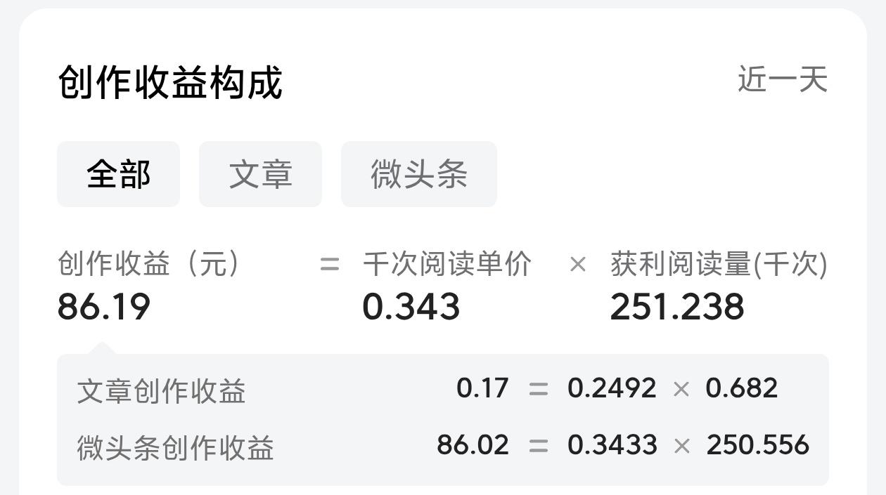 谁有提高单价的好方法,我快写自闭了, 这是昨天的阅读量,255000的阅读量,收益只有88,单价只有0.34元千次阅读。 相比上个月的单价,这简直就是折上折,我试着提高阅读时长,结果阅读时长提高了,单价反而降了,看着那些写家长里短的作者晒收益,千次都是5元左右,就算在有差别,也不至于快20倍吧,是不是我这个账号被下了什么“法咒”,百思不得其解了。 有人说我写这个国际题材没什么“实用价值”,但我认识一位同类型作者,所有数据都和我差不多,人家是2元千次阅读,我是3毛,差了7倍,这简直就是把我当牛马使啊,不甘心,不甘心[流泪][流泪][流泪][流泪][流泪]