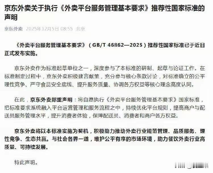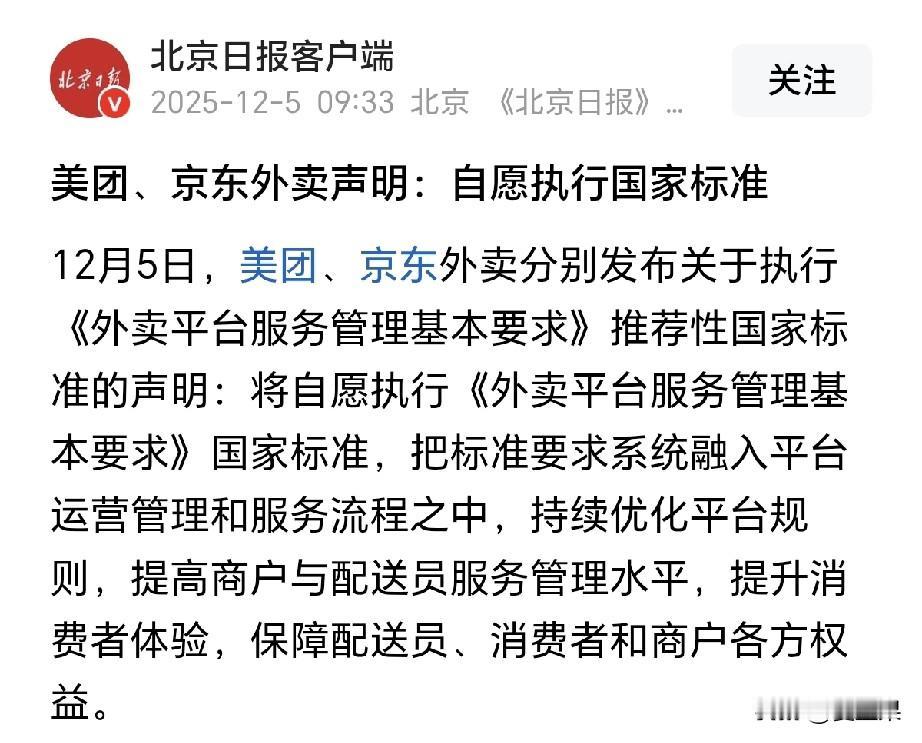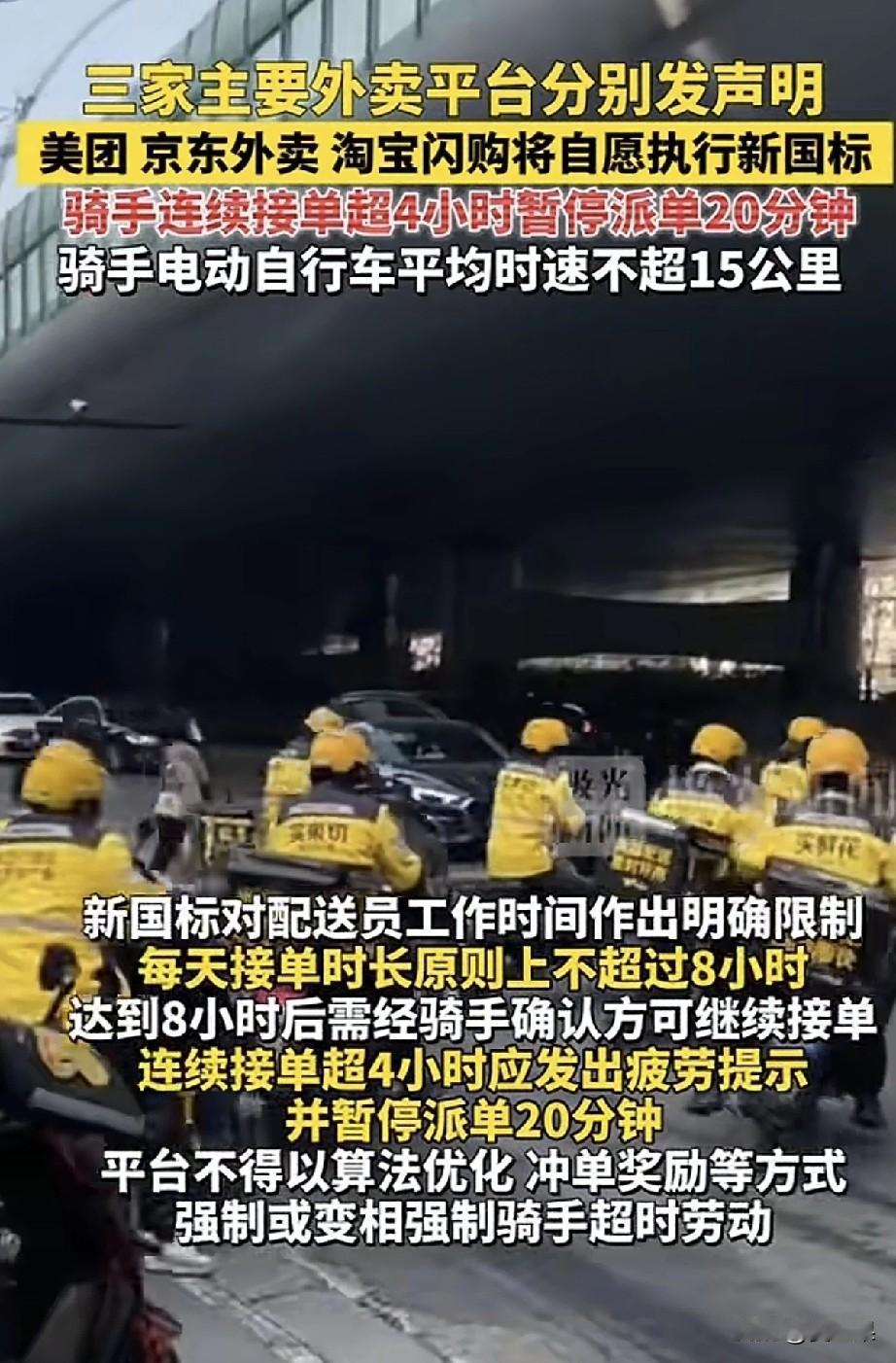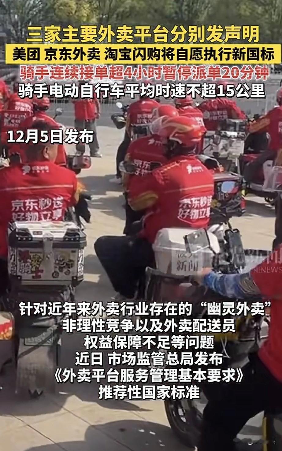 以后点外卖都耐心点儿吧, 不要随便给外卖小哥差评。 慢,可能不是他们的错, 而是新国标电车的车速在那摆着, 而且现在美团、淘宝闪购、京东等几大外卖平台,都不约而同发声, 支持新国标, 坚决贯彻执行新国标政策要求。 以后当然送外卖要求更规范, 以后外卖小哥也不好当了,挣钱也难了。