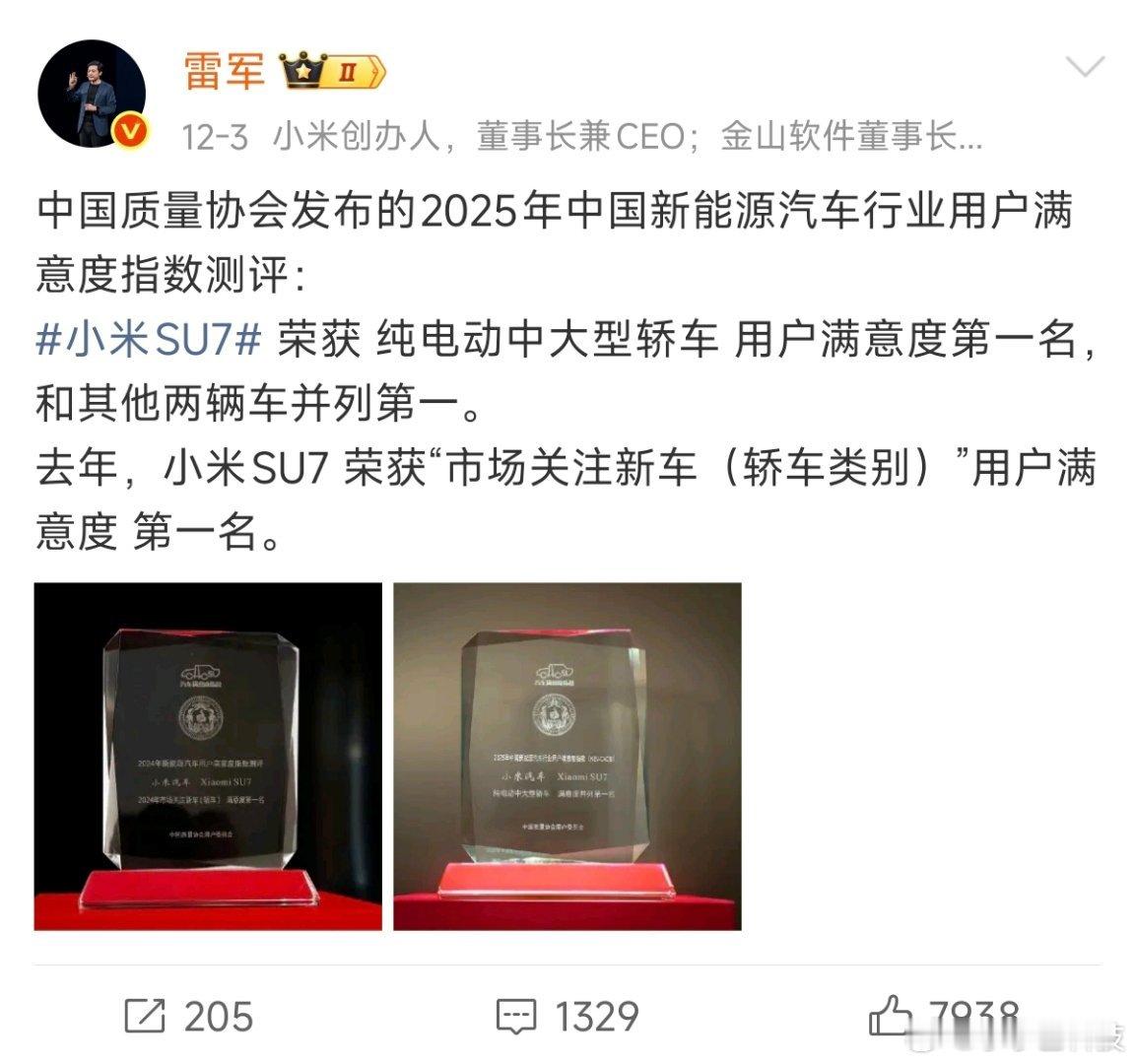两天前,雷军发了一条博文,内容是中国质量员协会公布了2025年中国新能源汽车行业用户满意度,小米SU7连续两年获得用户满意度第一。然后,有一波经常嘲讽小米群体把这质量协会说的很不堪,又说只有小米宣传,友商什么9也获奖了,又说雷军是副会长等等。就在今天,比亚迪高管也发布了质量协会的内容,比亚迪汉L 系列也获奖了。真不知道那群人的脑袋是怎么长的,明显的好事,为什么不能讲,你不讲也不允许别人讲,还说人家协会怎样怎样,真是狗拿耗子,多管闲事。
