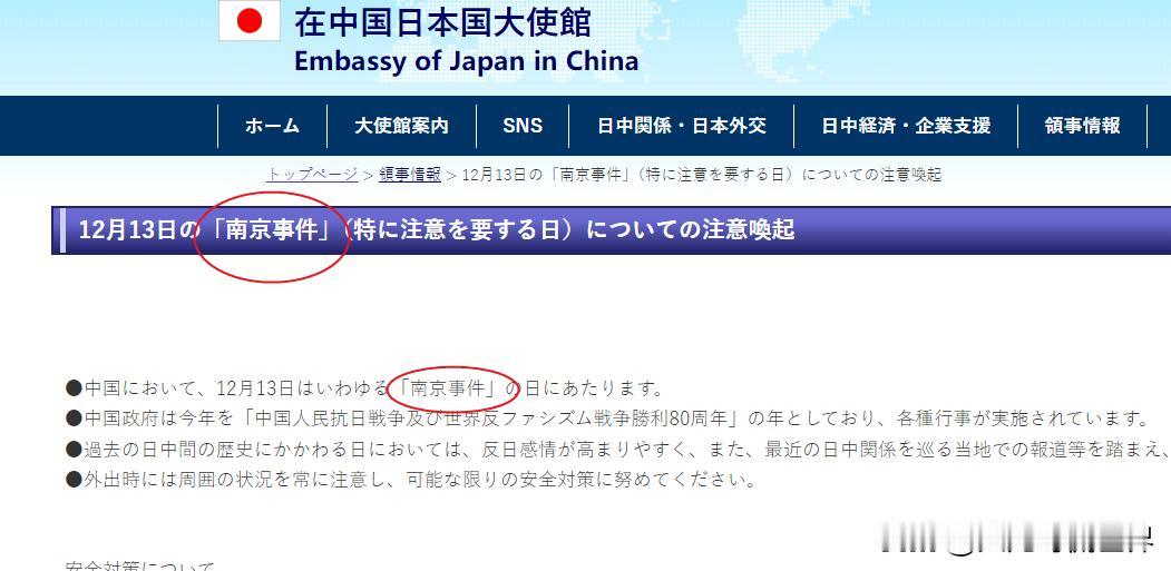 日本驻中国大使馆公然挑衅中国,在中国的南京大屠杀死难者国家公祭日(12月13日)前,在其日文版网站上发布了一个所谓的安全警示。   警示里不仅刻意把南京大屠杀改称“南京事件”,还宣称涉日历史问题相关节点中国反日情绪会上升,提醒在华日本人注意安全、避免暴露身份,而且这份警示压根没在中文网站发布。 这一切的背景是日本首相高市早苗此前就台湾问题大放厥词,粗暴干涉中国内政,直接导致中日关系陷入紧张,现在日本使馆却把关系恶化的锅甩给中国,说什么要警惕所谓反日情绪,明眼人都能看出这波操作藏着不少猫腻。 近三天不少网友热议这件事,有人直言日本使馆不敢发中文版就是心虚,也有人指出高市政府的涉台挑衅才是矛盾根源,这些声音恰恰戳中了事件的关键。 这份只给日本人看的安全警示,本身就是一场精心策划的舆论算计,日本使馆很清楚,日文版内容主要面向日本国内民众和在华日本人,这样的表述很容易在日本国内塑造出“中国是危险之地,反日情绪高涨”的片面印象,进而引导日本舆论把中日关系紧张的责任推到中国头上。 他们不敢在中文网站发布,就是怕在中国舆论场被当场拆穿,毕竟中国民众对南京大屠杀的历史记忆刻骨铭心,对日本右翼势力淡化历史、抹黑中国的行径早就保持高度警惕,一旦发布中文版,必然会遭到舆论的强烈驳斥,到时候日本使馆的舆论把戏就演不下去了。 这就像一个人在背后说别人坏话,却不敢当着对方的面开口,说到底就是心里有鬼,日本使馆这种内外有别的传播策略,本质上就是通过选择性发布信息,制造信息差,达到抹黑中国形象的目的,这种小伎俩在信息透明的今天根本行不通。 再看时间线,高市早苗政府在台湾问题上的挑衅言论余波未平,日本使馆就紧跟着发布安全警示,这绝对不是什么巧合,而是赤裸裸的政治联动。 台湾问题是中国的核心利益,是红线中的红线,高市早苗却公然触碰这条红线,发表涉台错误言论,这种干涉中国内政的行为,自然引发中国政府和民众的强烈不满,中日关系随之紧张也在情理之中。 高市政府眼看自己的挑衅行为遭到谴责,不想着反思纠错,反而让驻华使馆跳出来发布安全警示,这波操作就是想转移焦点。 他们试图把国际社会和日本国内的注意力,从高市政府干涉中国内政的错误行径上,转移到所谓的“中国反日情绪”上,把自己塑造成“受害者”,以此掩盖自身破坏中日关系的真实面目。 这种政治联动的套路并不新鲜,在国际政治舞台上,有些国家就喜欢用这种转移视线的手段,试图混淆是非,可惜的是,事实真相不会因为这种操作就被掩盖。 更让人无法接受的是,在南京大屠杀死难者国家公祭日临近的敏感节点,日本使馆发布这样的警示,是对历史记忆的漠视,更是对中国民众情感的二次伤害。 80多年前的南京大屠杀,30多万手无寸铁的中国平民和战俘惨遭屠戮,这是一段铁证如山的历史,是中华民族永远的伤痛,设立国家公祭日,就是为了缅怀遇难同胞,铭记历史,警示后人,防止历史悲剧重演。 日本使馆在这个特殊的时间点,把中国民众的历史情感歪曲成“反日情绪”,把缅怀先烈的庄严时刻说成需要“警惕”的节点,这是对30多万遇难同胞的亵渎,也是对历史事实的无视。 日本国内其实也有不少有识之士,他们正视历史,呼吁日本政府深刻反省战争罪责,比如冲绳等地的民间团体,就曾多次举办活动悼念战争遇难者,呼吁和平,对比之下,日本驻华使馆的做法显得更加荒谬和无礼。 中国民众铭记历史,从来不是为了宣扬仇恨,而是为了珍惜和平,日本使馆却把这种正常的历史记忆歪曲成“反日情绪”,无疑是在伤害两国人民之间的感情,也让中日关系的改善变得更加艰难。 中日关系的好坏,从来不是由所谓的“情绪”决定的,而是由双方的政策和行动决定的,高市早苗政府干涉中国内政,日本使馆发布片面警示抹黑中国,这些行为才是破坏中日关系的罪魁祸首。 中国始终致力于发展中日友好关系,前提是日本尊重中国的核心利益,正视历史事实,停止一切挑衅行为,任何试图通过抹黑中国、转移焦点来掩盖自身错误的做法,最终只会搬起石头砸自己的脚。 历史不容篡改,正义不容亵渎,日本政府如果真的想改善中日关系,就该拿出诚意,反思自己的行为,而不是耍这些小聪明。 你觉得日本驻华使馆的这波操作,会不会进一步影响中日关系的走向?你认为日本政府接下来该拿出怎样的实际行动,才能真正修复中日关系?   (本文信源:关于12月13日“南京大屠杀”(需特别注意之日)的提醒--日本驻华大使馆)