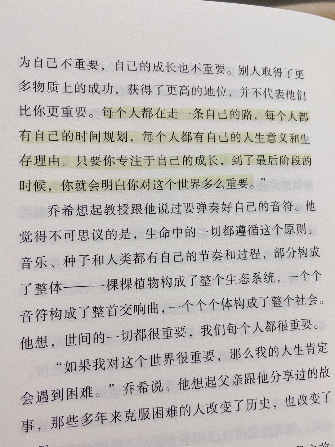 书里的主角乔希👨是公司的明日之星,在工作了几年之后,他失去了对工作的热情。上司给了他两周的时间,让他考虑是否换个工作,他动身去往乡间,在那里遇到一位很有智慧的农夫。给了他一颗种子。对他说只要找到合适的地方种下,你就会找到你的目标