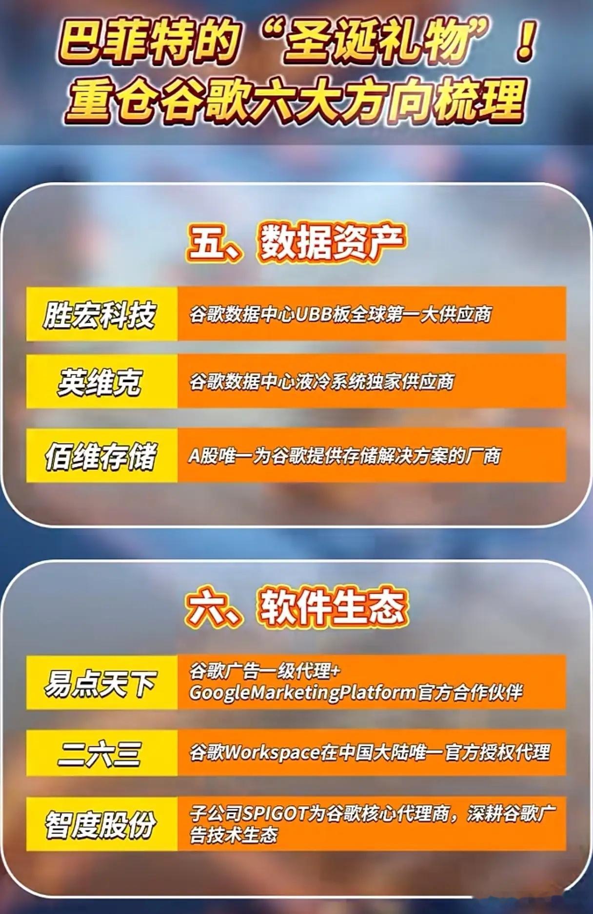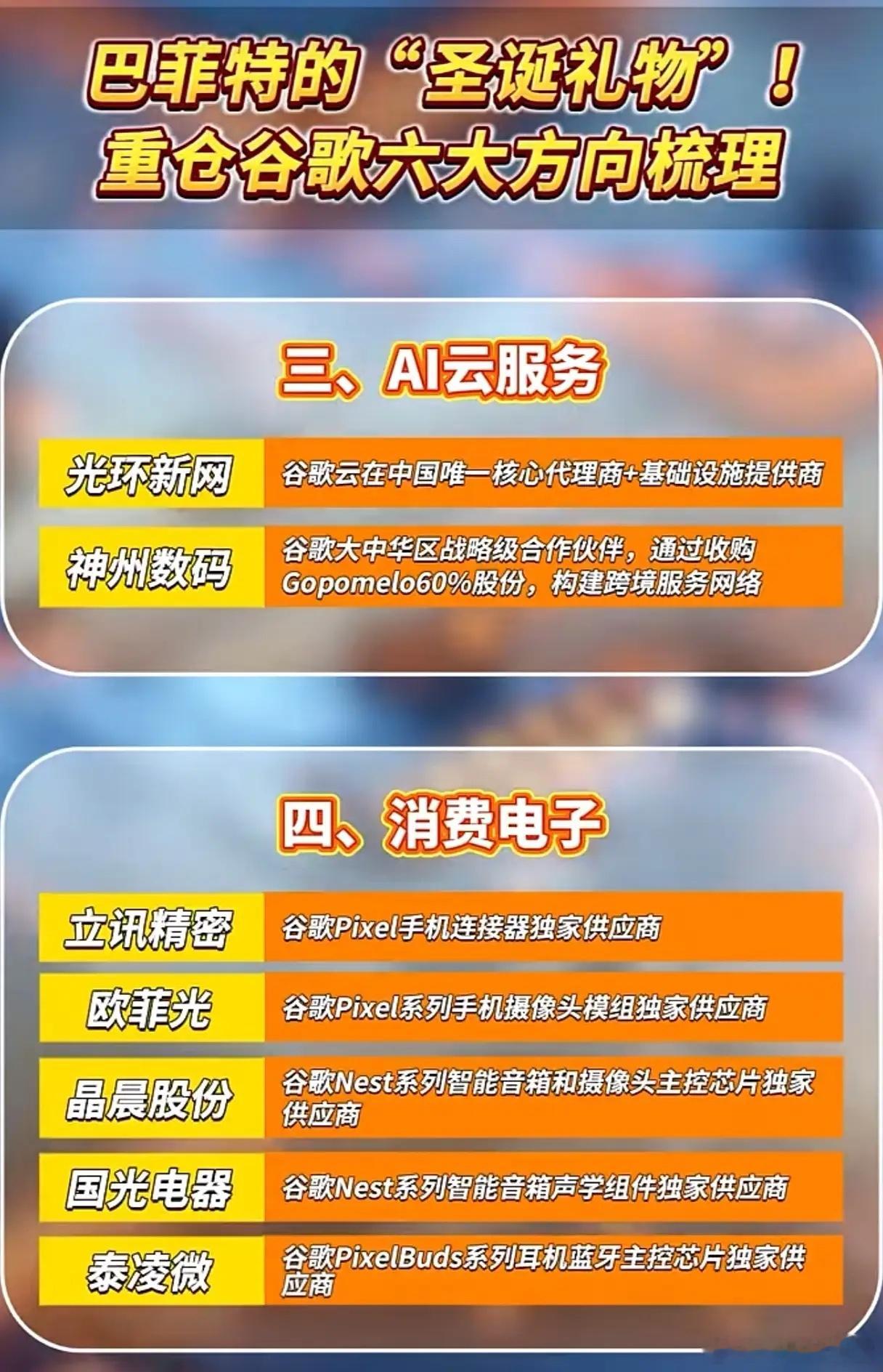 巴菲特重仓谷歌 这些中国企业竟成“隐形赢家”巴菲特重仓谷歌的布局,悄然让一批中国企业搭上巨头红利快车。从TPU芯片到软件生态,六大核心领域里,多家中国公司凭借独家供应商身份,成为谷歌产业链的刚需拼图。硬件端,中际旭创拿下谷歌1.6TDR8光模块、TPU V7高端PCB独家供应权;工业富联、长电科技分别斩获TPU全产业链制造、高端封装认证,堪称AI硬件落地的关键支撑。生态端,昆仑万维旗下Opera浏览器,是谷歌全球唯一整合Gemini全能力的中国伙伴;蓝色光标接入Gemini 3后广告制作成本直降90%;万兴科技Filmora更是谷歌开发者大会唯一展示的视频剪辑产品。消费电子与数据赛道同样亮眼,立讯精密、欧菲光垄断谷歌Pixel手机连接器、摄像头供应;胜宏科技、英维克则包揽谷歌数据中心UBB板、液冷系统独家订单。绑定巨头、卡位刚需,这些中国企业正将谷歌的增长红利,实实在在转化为自身业绩增量!
