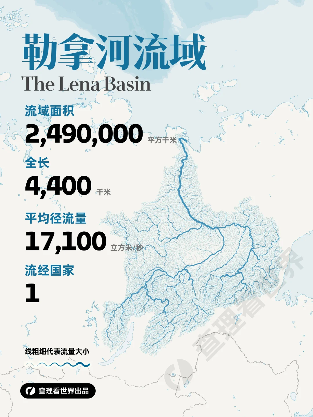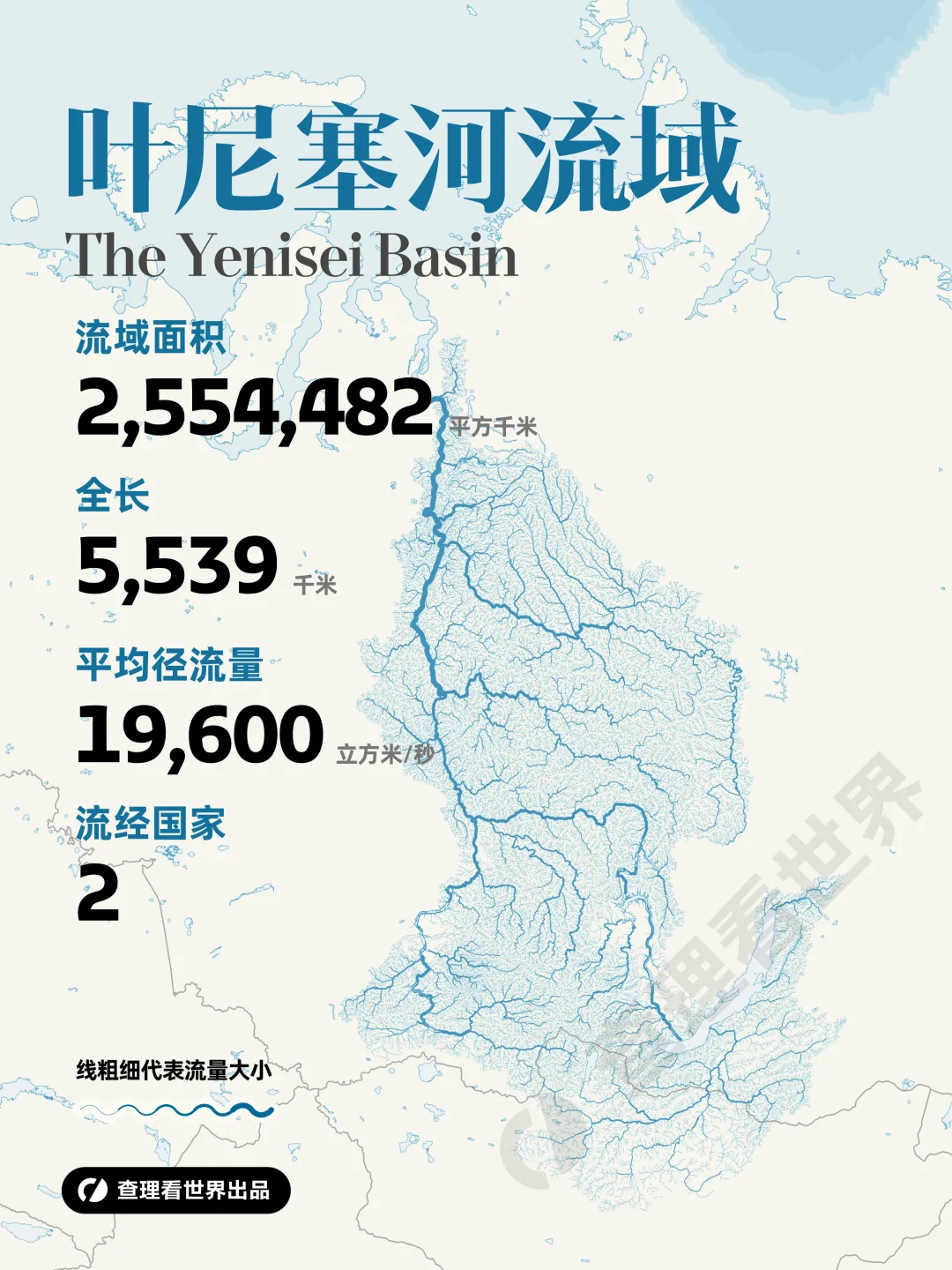 [七R]叶尼塞河(约 255 万 km²):俄罗斯水量最大河流,流经西伯利亚,流域内森林、矿产资源丰富,水力发电潜力巨大。