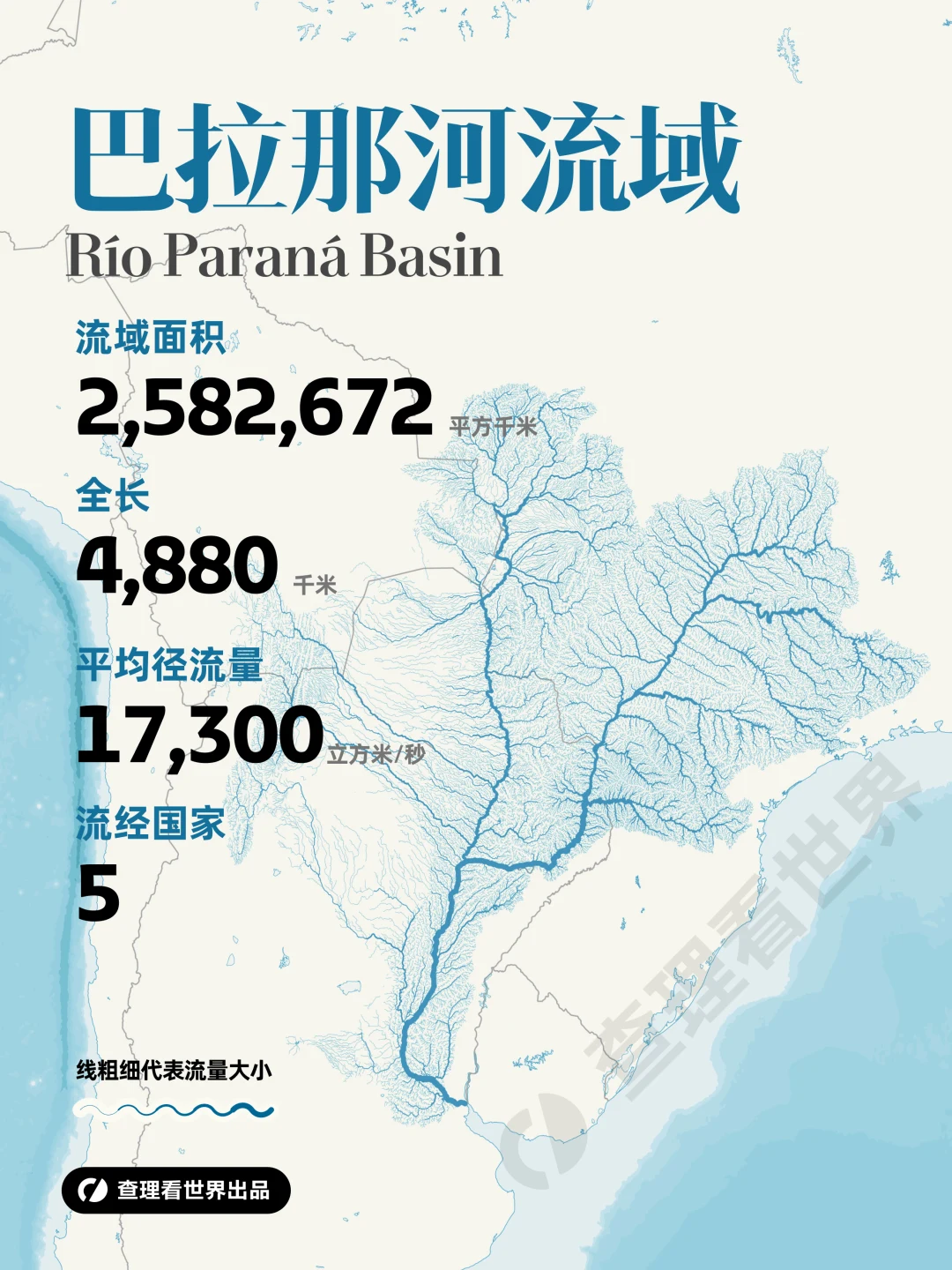 [六R]拉普拉塔河-巴拉那河(约 258 万 km²):南美第二大流域,流经巴西、阿根廷等国,流域内农业发达,河口地区人口密集,经济活跃。