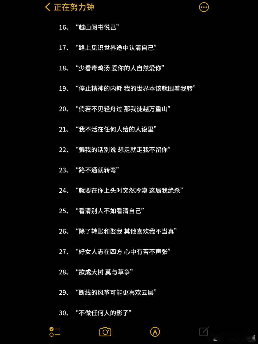 格局打开的大女主自由感文案 1、“做自己而不是解释自己” 2、“千人千面 我永远爱我的那一面” 3、“听风吧 听自由的风” 4、“万事无过不去 有的话睡一觉就好了” 5、“永远都秉持着看破不说破” 6、“于人于物 不必如此执着” 7、“目坐等春树 不做回头鸟” 8、“失之坦然得之淡然” 9、“天黑有灯 下雨有伞” 10、“爱与自由二八分” 11、“花开有期 花期不同” 12、“自由至上拒绝束缚” 13、“我焦虑什么 我如光那般耀眼” 14、“永远都没有必要在意那些复杂的人际关系” 15、“谁也不欠谁掉价的事少做” 16、“越山阅书悦己” 17、“路上见识世界途中认清自己” 18、“少看毒鸡汤 爱你的人自然爱你” 19、“停止精神的内耗 我的世界本该就围着我转” 20、“倘若不见轻舟过 那我徒越万重山” 21、“我不活在任何人给的人设里” 22、“骗我的话别说 想走就走我不留你” 23、“路不通就转弯” 24、“就要在你上头时突然冷漠 这局我绝杀” 25、“看清别人不如看清自己” 26、“除了转账和娶我 其他喜欢我不当真” 27、“好女人志在四方 心中有苦不声张” 28、“欲成大树 莫与草争” 29、“断线的风筝可能更喜欢云层” 30、“不做任何人的影子”