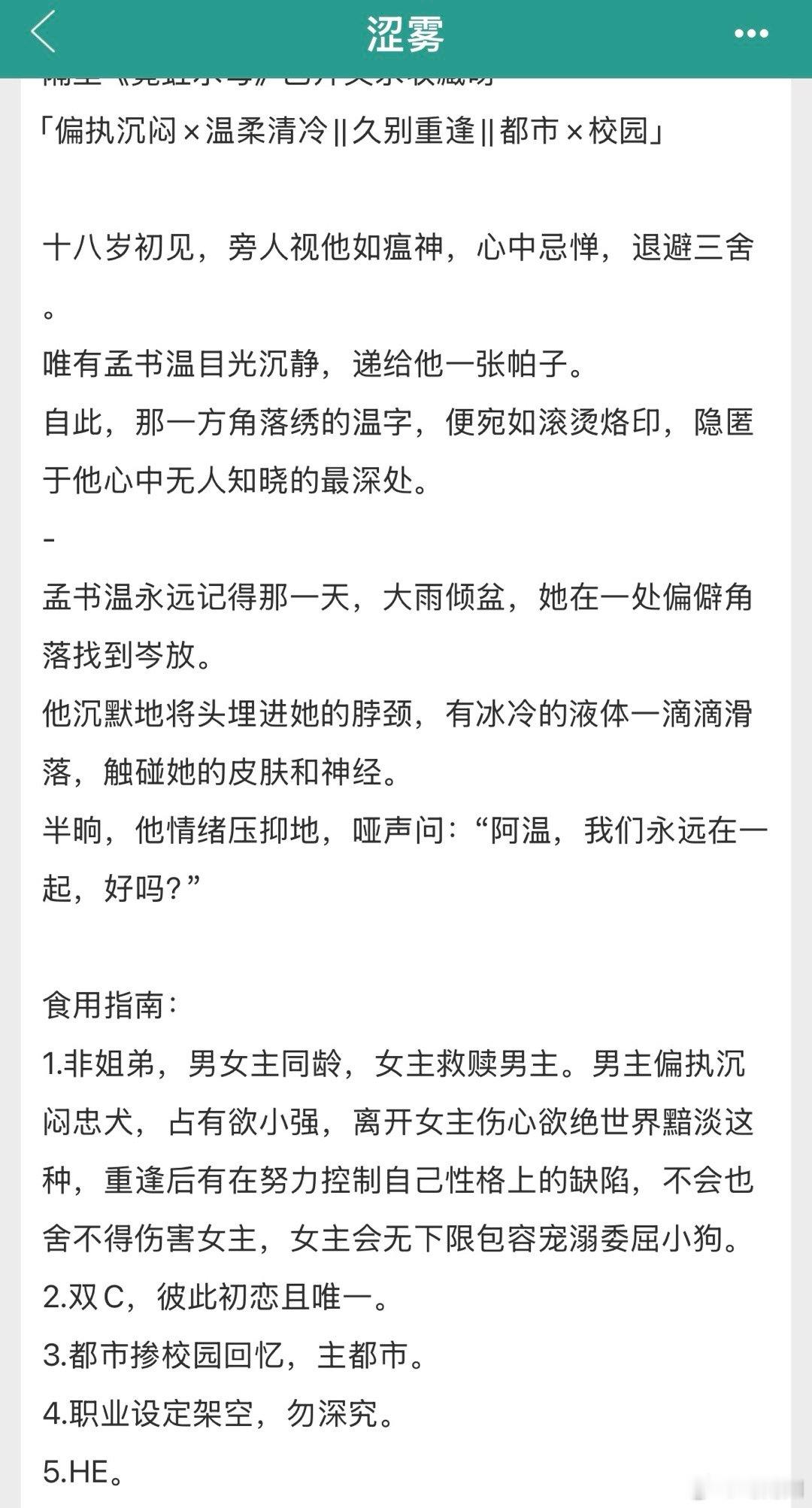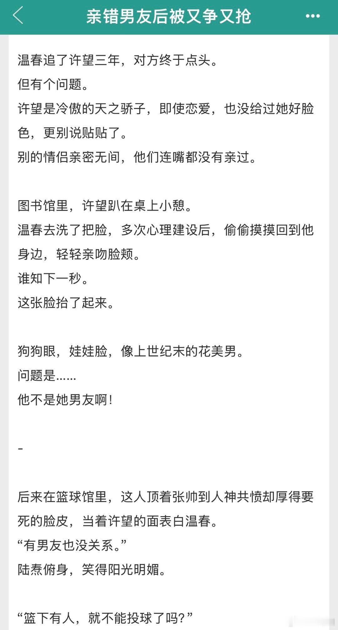 《春天和小狗》 大学校园 绿茶男主温春追许望三年,换来的恋情比水还淡。别人恋爱是蜜里调油,他们连初吻都还留着。 图书馆里,温春终于鼓起勇气偷吻男友脸颊——谁知下一秒,这张脸抬了起来。狗狗眼,娃娃脸,像上世纪末的花美男。问题是……他不是她男友啊! 后来篮球馆喧嚣鼎沸,陆焘当着许望的面,向温春表白。“有男友也没关系。”他俯身,笑得阳光明媚:“篮下有人,就不能投球了吗?” 《涩雾》校园暗恋开篇即重逢年少时过于炽烈的爱意将她推远,说出口的永远恍若戏言。但他依旧停在原地,在无数她看不见的日夜里独自成长,只等重逢的某一天告诉她,我终于也能保护你推文言情小说推荐