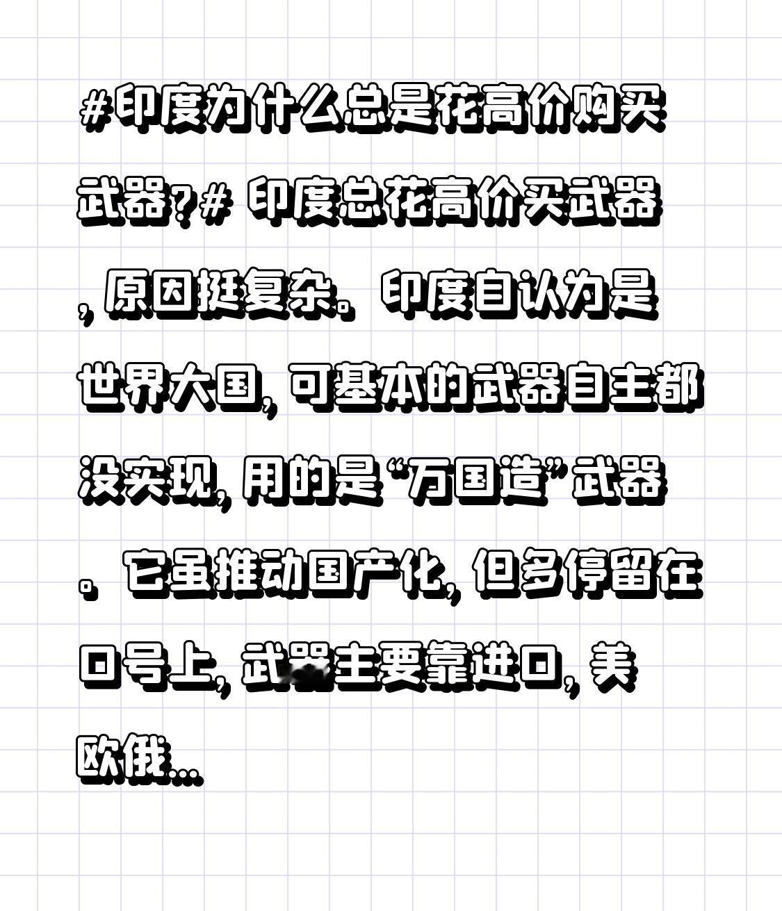 印度为什么总是花高价购买武器? 印度总花高价买武器,原因挺复杂。印度自认为是世界大国,可基本的武器自主都没实现,用的是“万国造”武器。它虽推动国产化,但多停留在口号上,武器主要靠进口,美欧俄是主要进口国。 比如“5·7”空战“大放异彩”的阵风战机,印度从法国高价采购,还号称能击败歼 - 20。“5·7”空战后,印度豪掷 74 亿美元订 97 架国产“光辉”战机,还花约 200 亿美元增购 114 架法国阵风。买阵风一是因印美关系破裂买不到 F - 35;二是它能和苏 - 57 搭配;三是阵风降价,从 2.2 亿降到 1.75 亿美元。