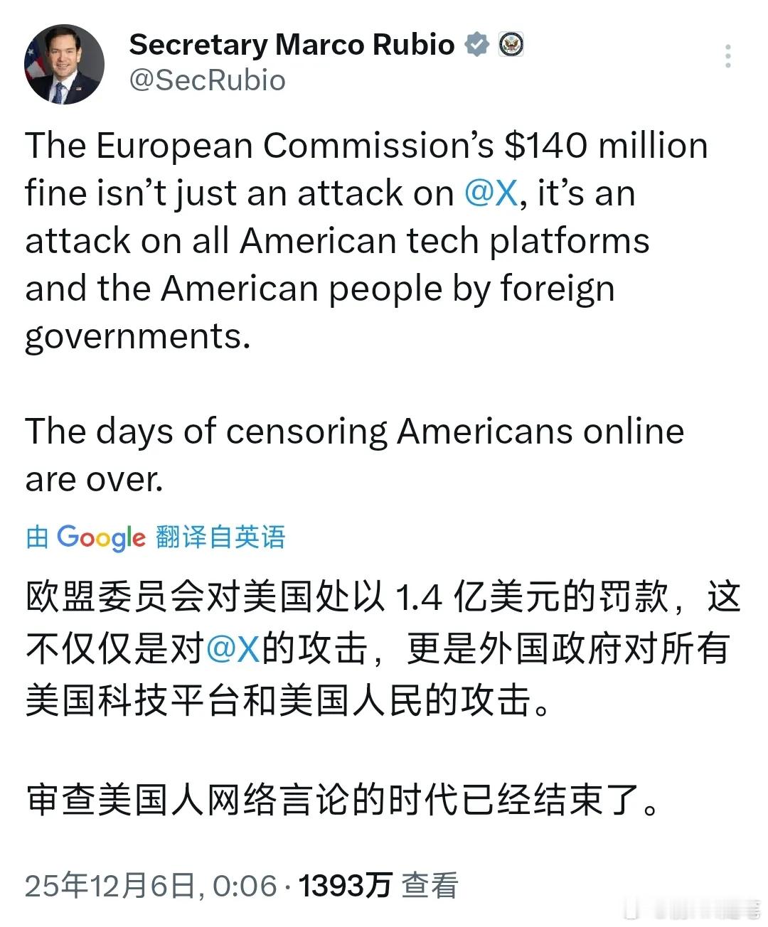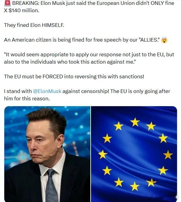 欧盟罚X平台、美国放狠话报复,欧美内斗是好事!12月5日,欧盟依据《数字服务法案》对马斯克旗下X平台开出1.2亿欧元罚单,说X的蓝标认证误导、广告资料库不透明等违规行为。面对这一处罚,马斯克怒批罚款“疯狂荒谬”,直言既针对平台更针对个人。北京时间12月6日,美国国务卿鲁比奥更是将其定性为“外国政府对美国科技平台与民众的攻击”,美国副总统同步放出报复狠话,一场欧美互联网领域的正面对垒正式升级。这场跨大西洋的科技博弈看似是双方监管与霸权的碰撞,实则为中国带来多重战略利好,成为观察全球格局调整与中国发展机遇的重要窗口。1、欧洲互联网领域的“殖民困境”早已是公开事实,此次对垒更将这一短板彻底暴露。当前欧洲互联网市场已被美国科技巨头全面渗透,从社交、搜索到电商,美国平台几乎占据垄断地位,欧洲本土互联网企业难以形成抗衡之力,所谓的数字主权诉求沦为被动反击的空壳。更关键的是,美国早已将互联网作为干预欧洲政治生态的工具,通过平台算法倾斜、信息操纵等方式影响欧洲舆论走向,甚至助推各类政治分歧发酵,而欧洲既缺乏打破垄断的产业基础,又无摆脱干预的有效手段,陷入无解的战略被动。2、欧洲对美博弈的弱势,本质是自身战略威慑力的全面缺失,此前冯德莱恩主导签订的不平等贸易条约便是明证。面对美国在贸易、科技领域的霸权施压,欧洲始终难以拿出有力反制手段,即便此次以监管名义对X平台罚款,也仅是表层的姿态性反抗,无法触及美国核心利益。反观美国,动辄以关税威胁、技术封锁施压,欧盟此前虽表态不会在科技监管上妥协,却始终不敢突破美国设定的底线,这种“敢怒难敢言”的处境,早已注定其博弈中的弱势地位,因为根本没有啥杀手锏还被驻军威慑。3、如今美国对欧洲的控制已从隐性渗透转向实际行动,欧洲的战略自主沦为“体面挣扎”。不仅仅安全领域的捆绑,而且经济科技领域压制厉害,美国通过一系列手段牢牢掌控欧洲发展走向,而欧洲在实力差距下,逐渐放弃实质反抗,仅追求表面上的尊重与体面。此次对X平台罚款,看似是欧洲捍卫数字主权的尝试,实则更像是一场“姿态秀”,既想向外界证明自身存在,警告马斯克不要高调干预欧洲政坛,又不敢真正触碰美国核心利益,最终只会进一步加剧双方裂痕,却无法改变被控制的本质。4、值得关注的是,美国在此次事件中展现出的“护犊子”态度,更值得中国借鉴。面对海外势力对本土科技企业的打压,美国从企业到政府形成一致反击态势,政府第一时间站台发声、亮明立场,这种对本土核心产业的坚定保护,正是维护产业安全、巩固发展根基的关键。中国科技产业正处于高质量发展与国际竞争并行的阶段,这种“抱团护企”的意识与行动力,能为本土科技企业抵御外部风险、拓展发展空间提供重要支撑。欧美互联网对垒的升级,本质是美国科技霸权扩张与欧洲被动维权的矛盾总爆发,更是全球多极化格局调整的生动缩影。对中国而言,这场内斗不仅分散了欧美对全球科技领域的注意力,弱化了其联合遏制中国科技发展的可能;也许是中国互联网企业出海的一个契机。