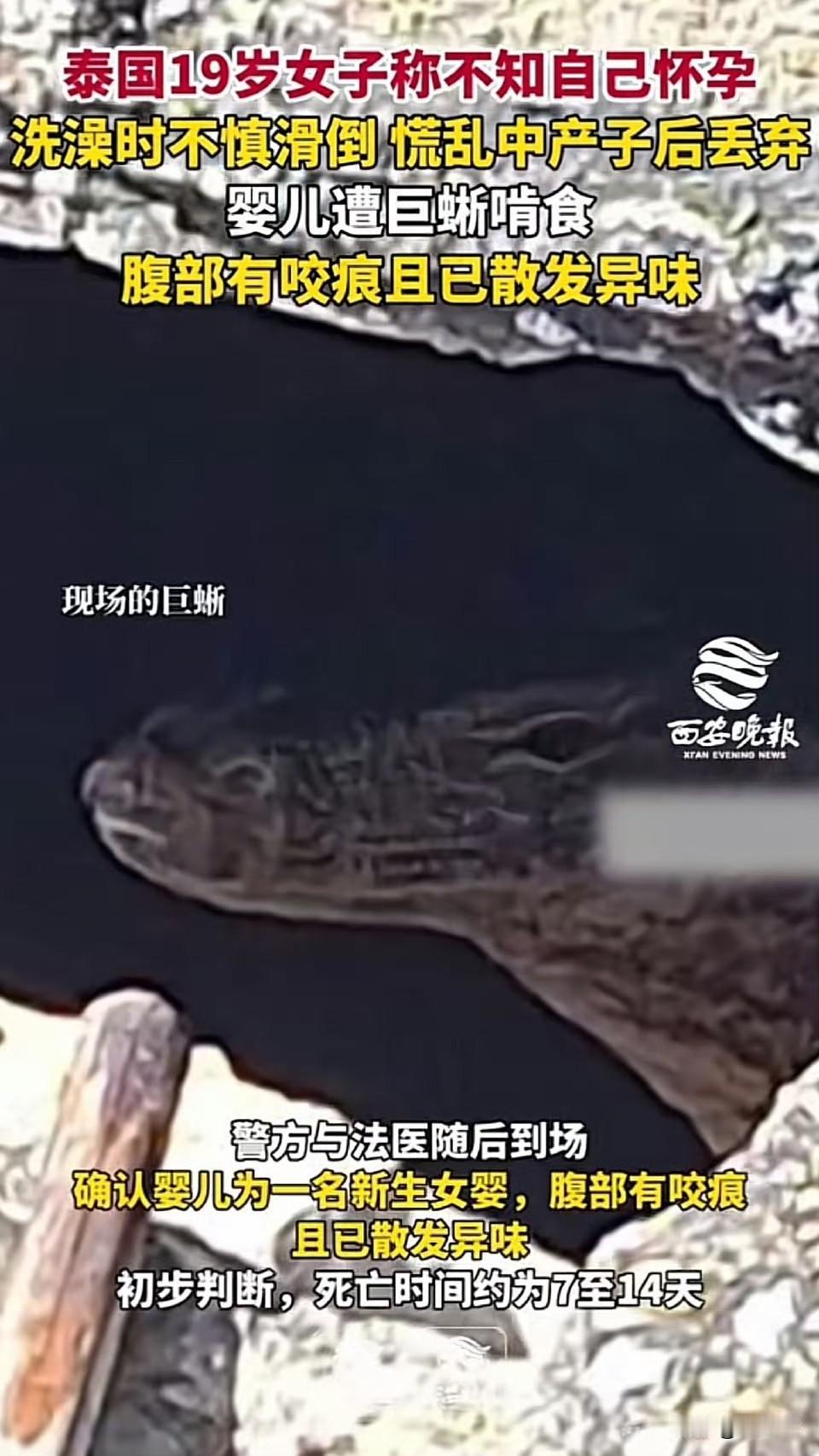 泰国北榄府邦普里区某村庄外约500米处,一名村民当街撞见巨蜥拖行一具婴儿尸体,且有啃食痕迹。当地居民合力驱赶巨蜥并报警,随后警方找到婴儿的生母,一名19岁女子,她称自己“不知道怀孕”,分娩后将婴儿遗弃。