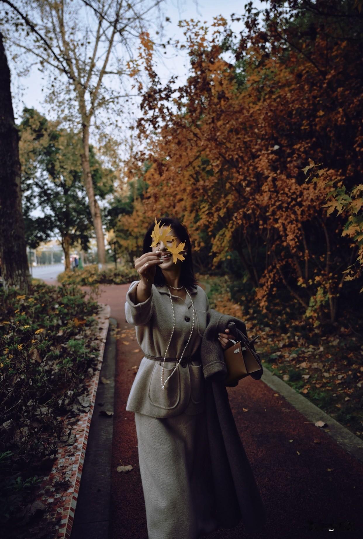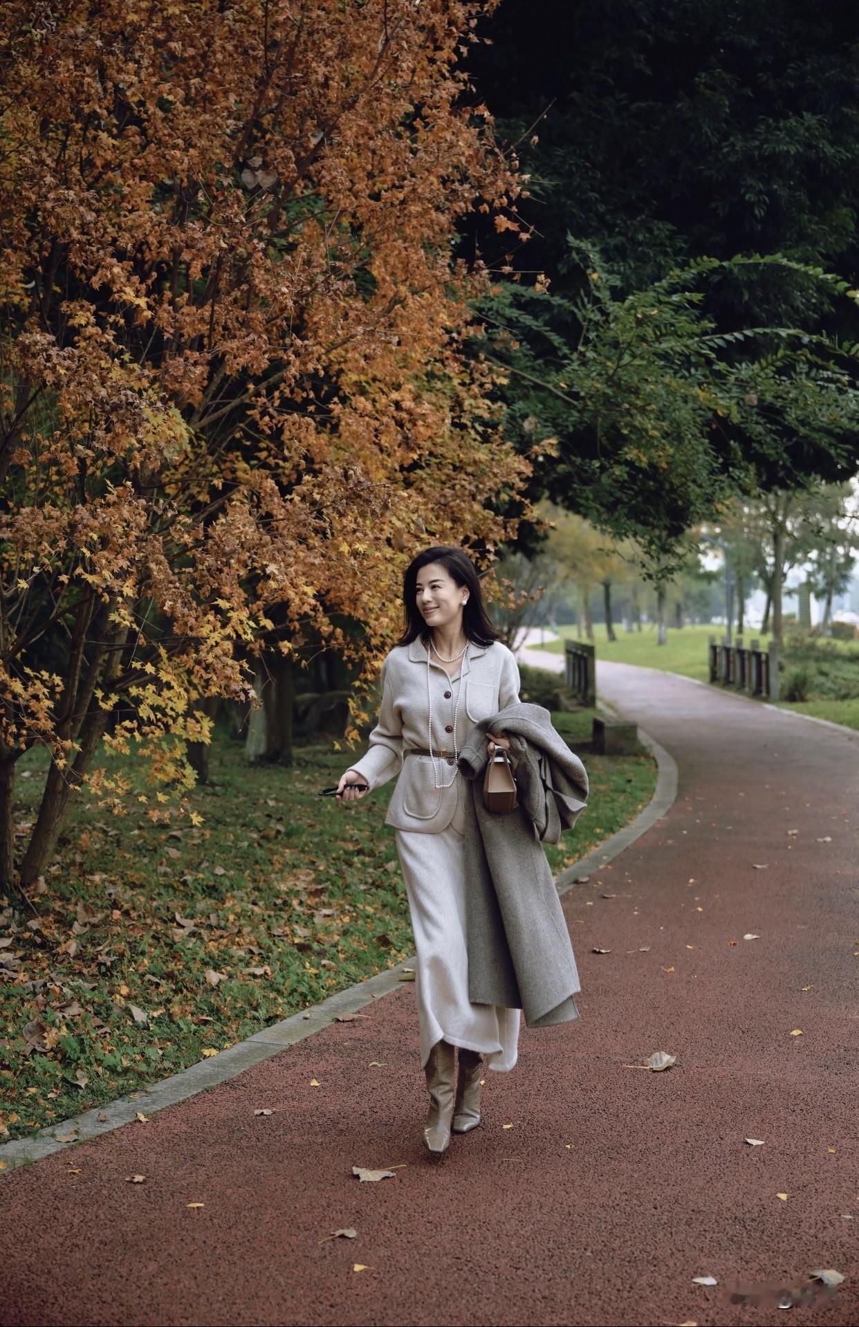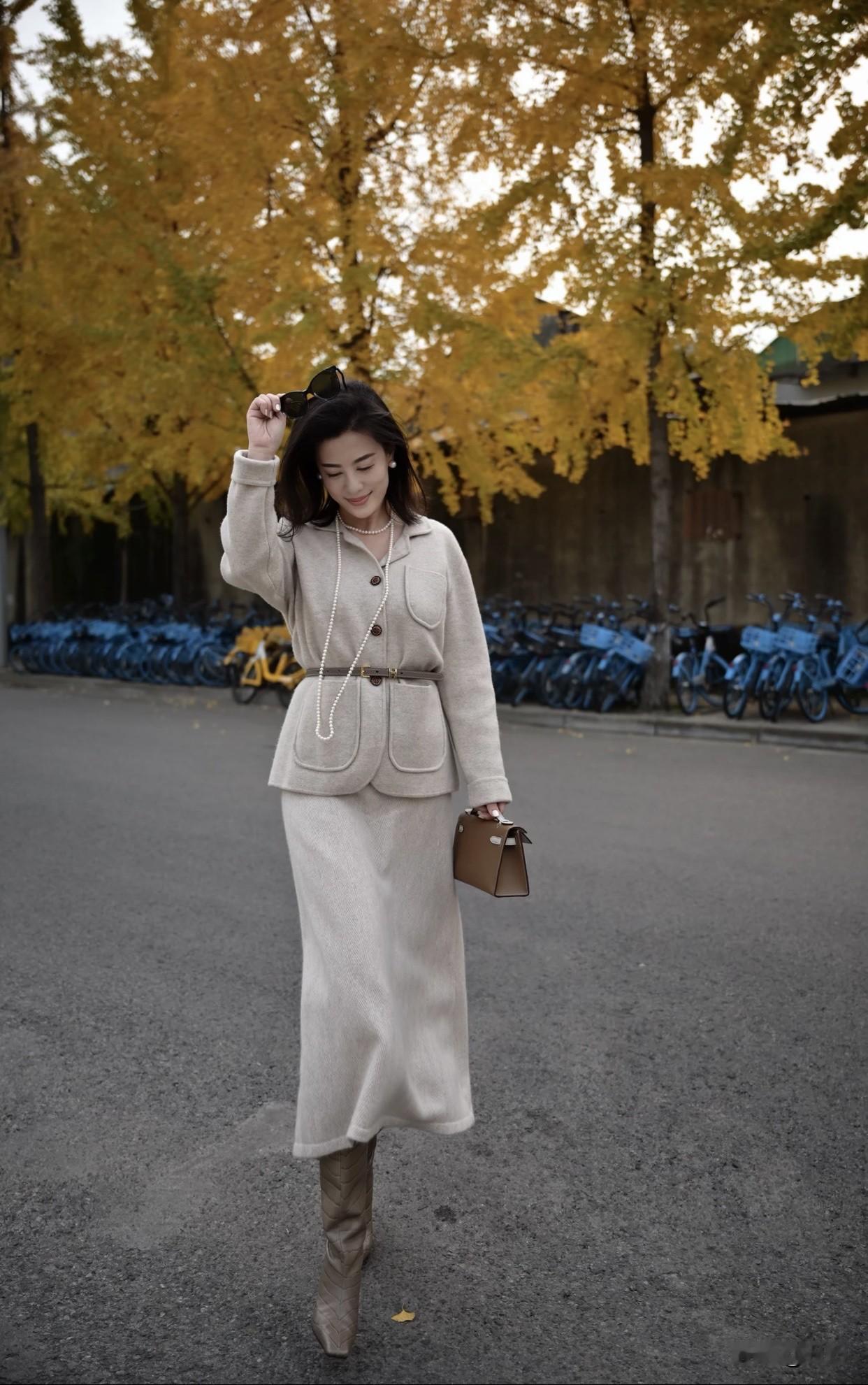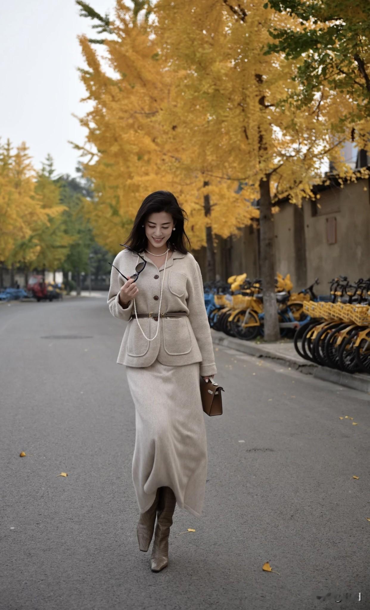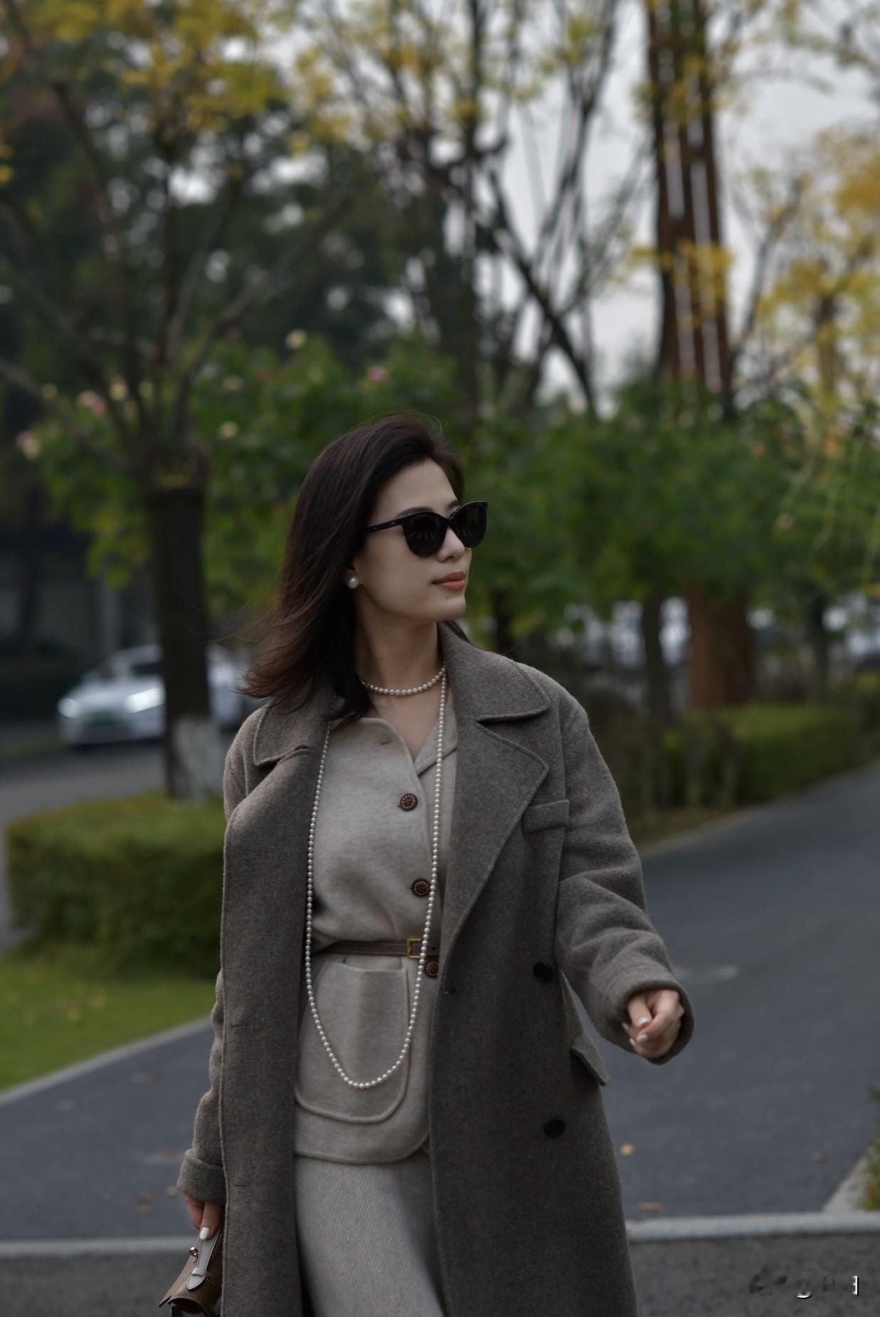 怎样穿搭能显示出温柔的女生气质?优雅秋日穿搭,灰色大衣配珍珠项链,尽显都市女性魅力。