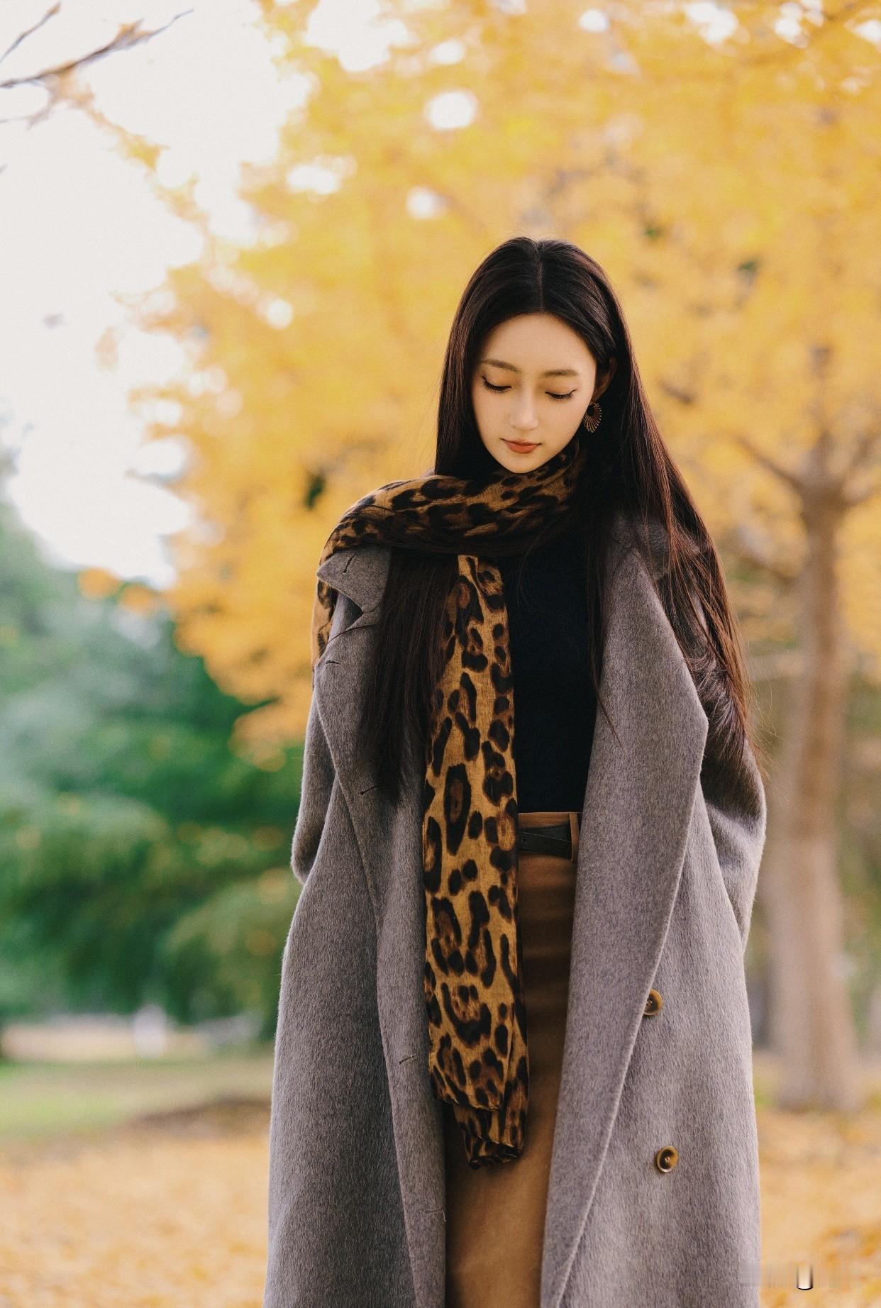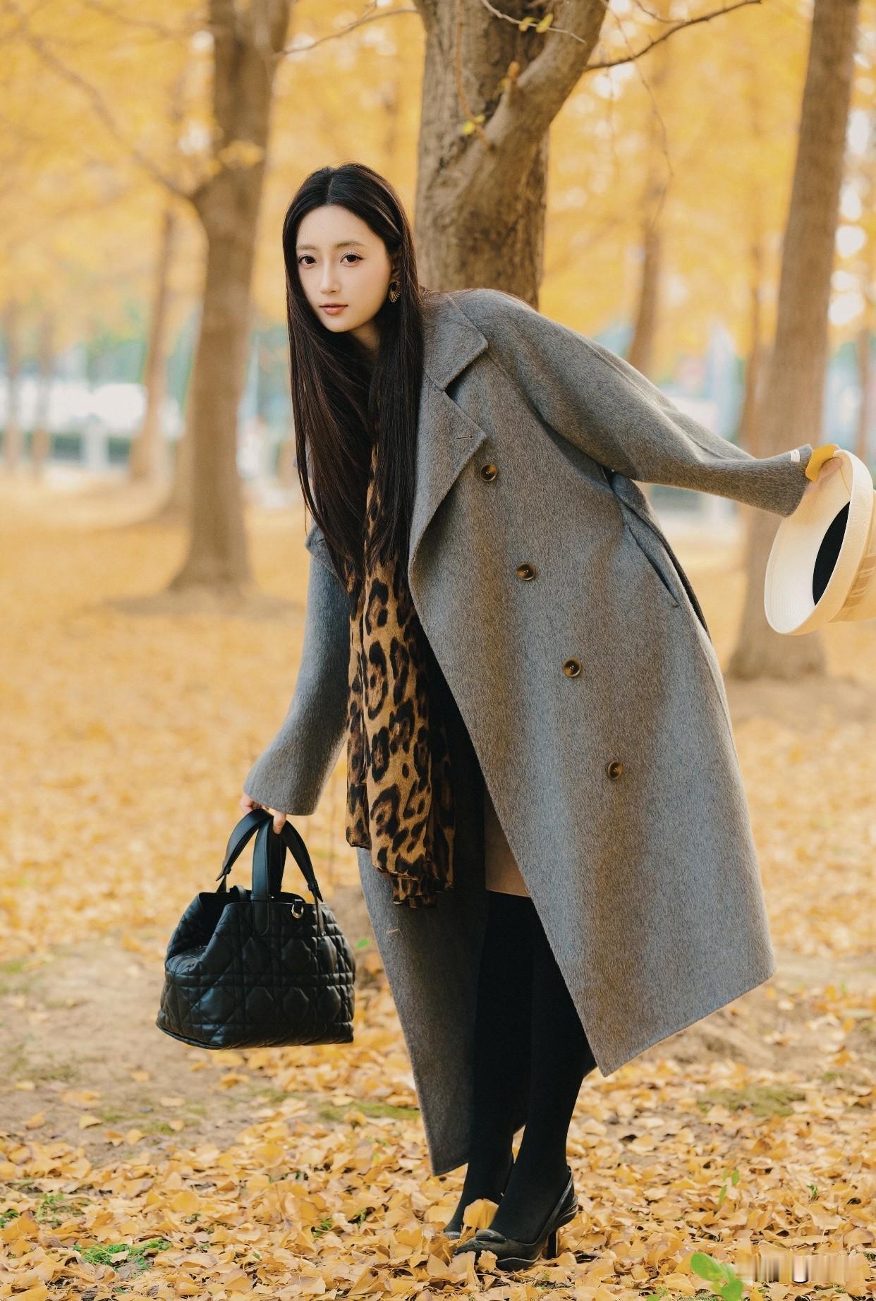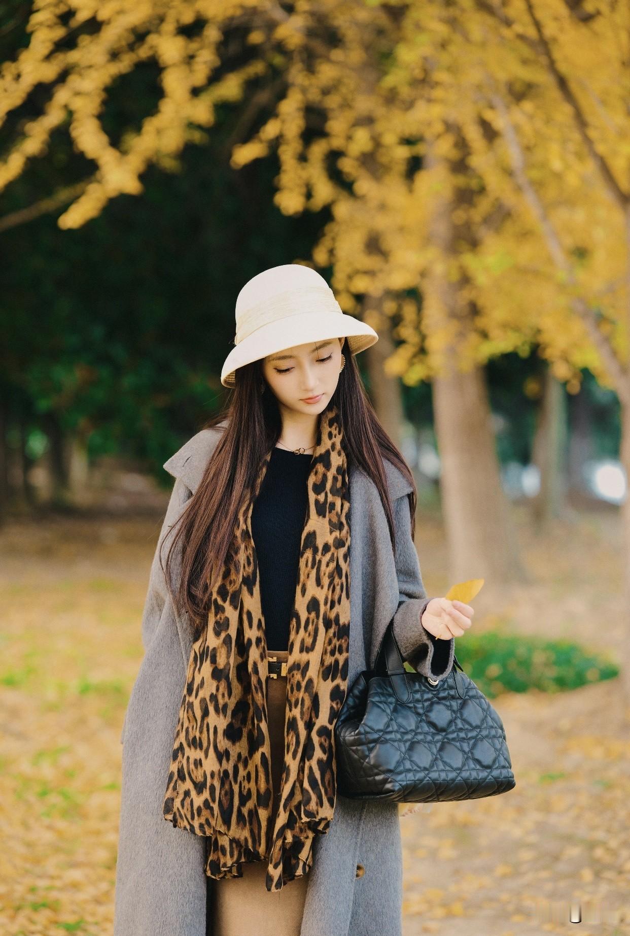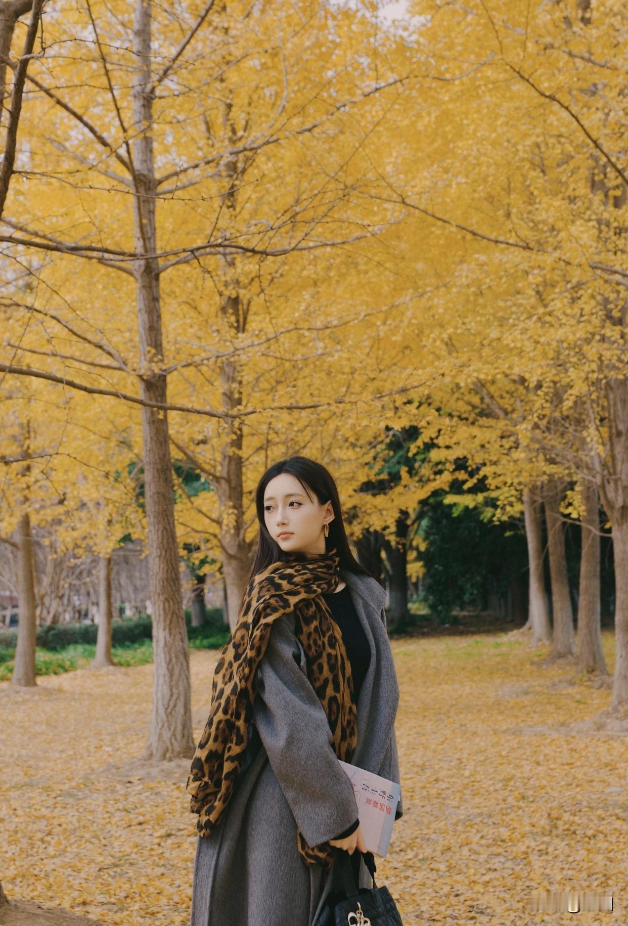 看过哪些惊艳时光的美女?秋日漫步,优雅黑裙,微笑相伴。