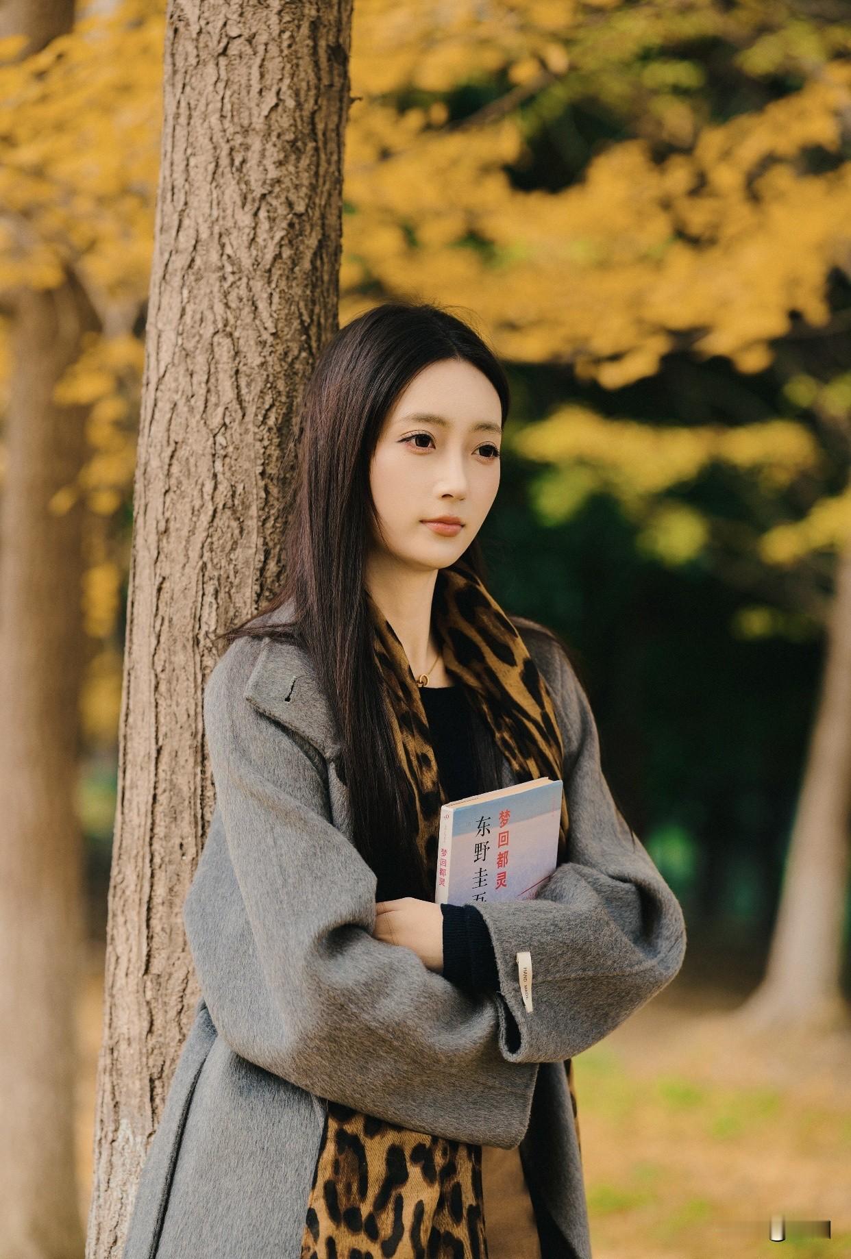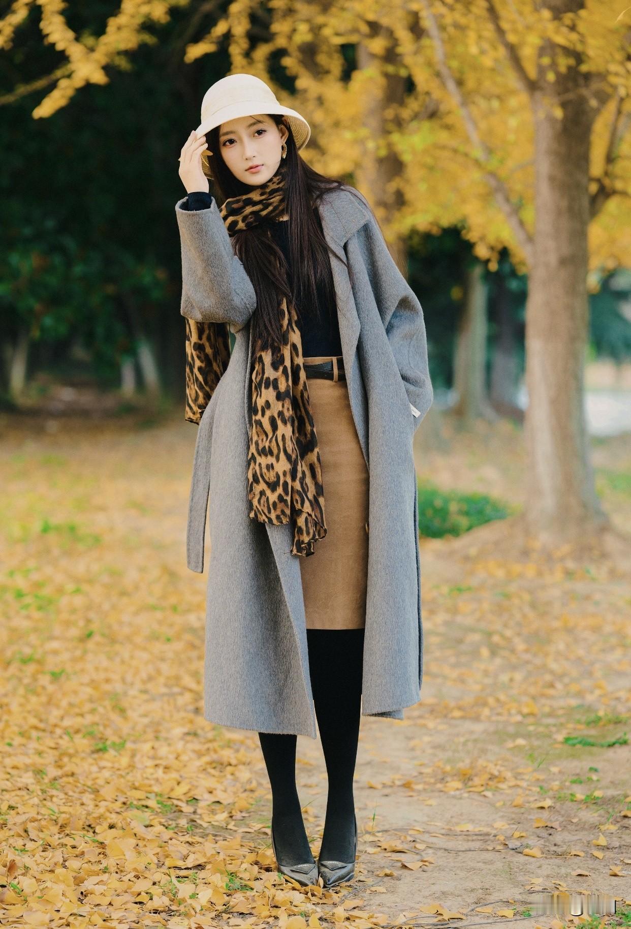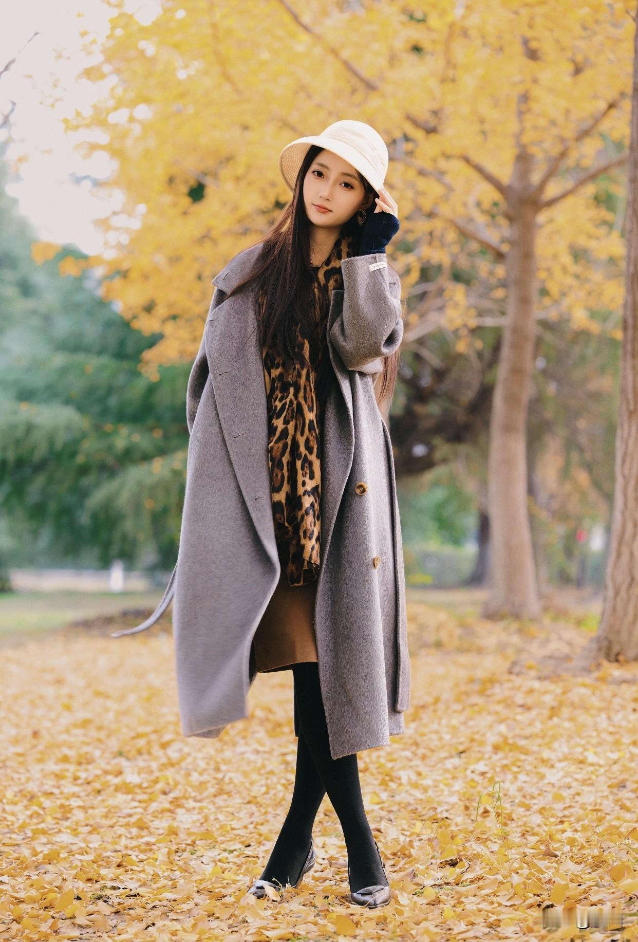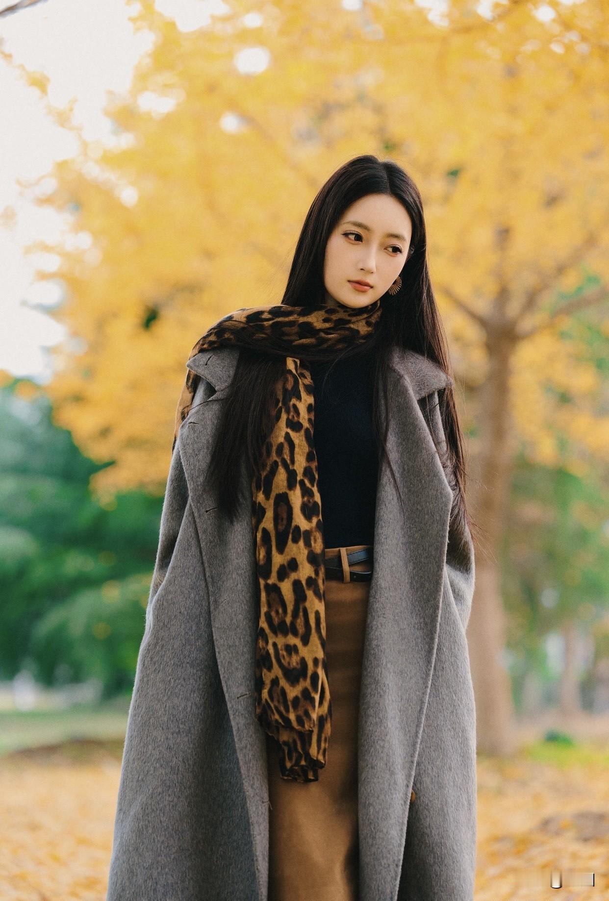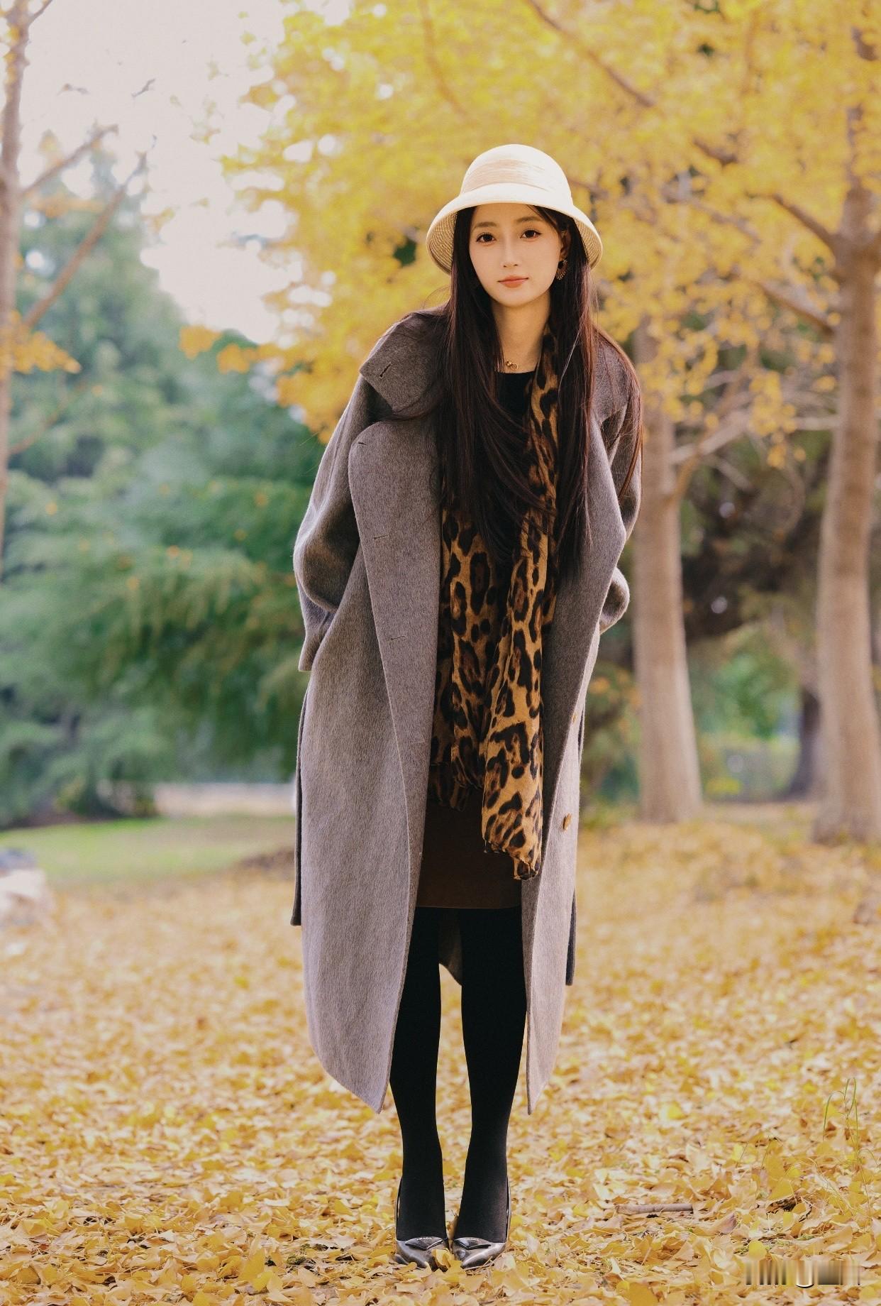 看过哪些惊艳时光的美女?秋日漫步,优雅黑裙,微笑相伴。