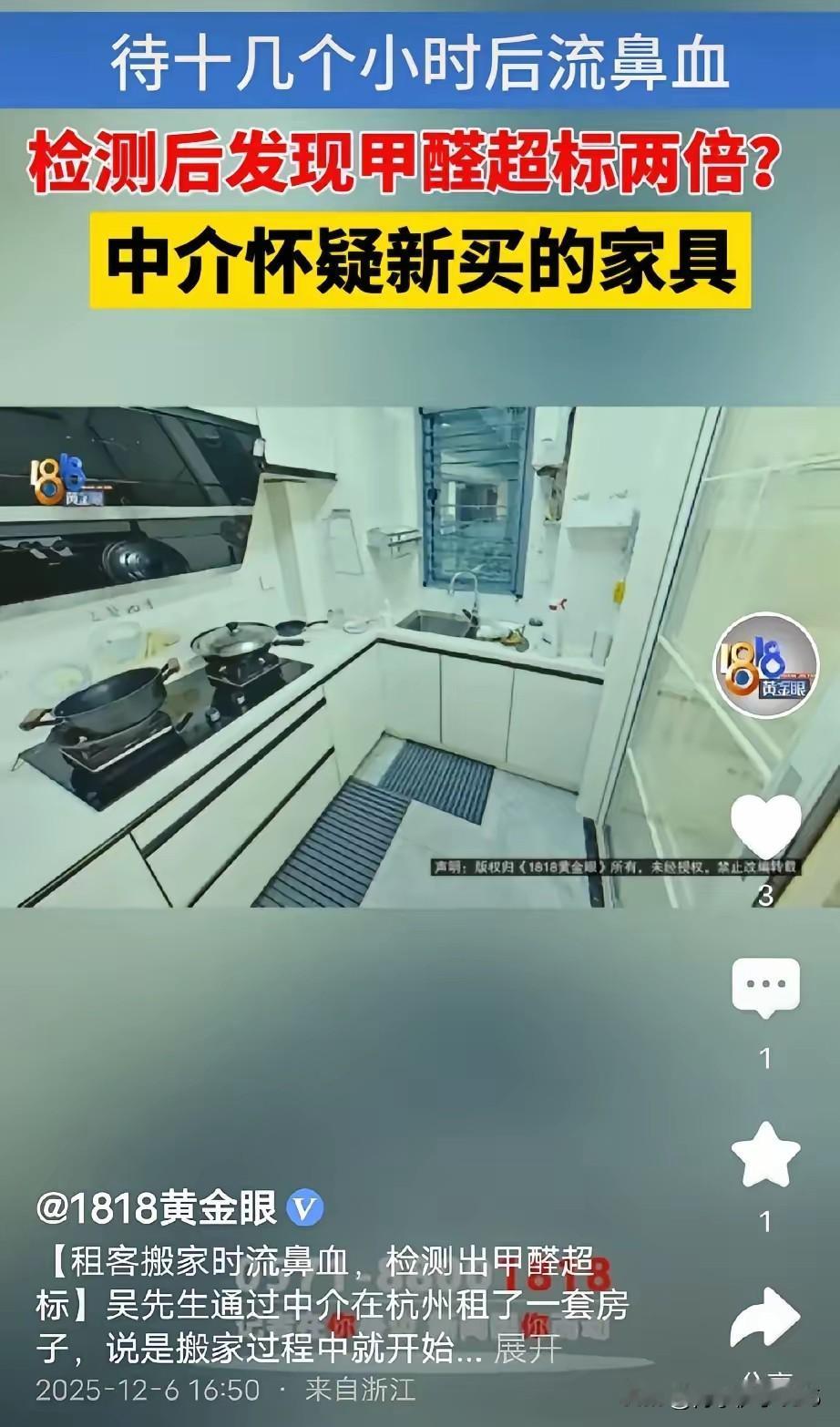 甲醛超标不是小事,租到这样的房子,谁不糟心?杭州的吴先生就遇到了这样的事。他刚搬进新租的房子,当天就流鼻血不止,医院检查发现血常规异常。一测甲醛,竟超标两倍! 吴先生要求退租,并索赔检测费、医疗费、搬家费等共计8000元。房东却觉得委屈,认为钱没赚到还要赔钱,拒绝赔偿。双方调解无果,吴先生决定“较真到底”。 从法律上看,房东的责任很明确。根据《民法典》,房东必须提供安全、适宜的居住环境。甲醛超标已危害租客健康,属于根本违约,吴先生完全有权解除合同,并要求赔偿相关损失。这些费用都是实际产生的,并非无理要求。 这件事也给所有房东提了个醒:出租房屋不能只看装修美观,环保安全才是底线。使用不合格家具建材,看似省了钱,一旦出事,赔得更多,还伤了信誉。而对租客来说,如果遇到类似问题,保留好医疗、检测等证据,依法维权,才是真正保护自己。 租房事小,健康事大。无论是出租还是租房,都多一份谨慎,少一份纠纷。甲醛标准范围 家用甲醛 装修甲醛致癌 甲醛等级 全屋甲醛超标