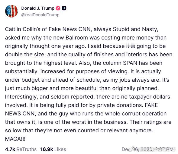 【黄金时代】川普称,白宫新宴会厅没有超出预算,而且工期也提前了,没花纳税人一分钱川普:假新闻CNN的凯特琳·柯林斯,总是那么愚蠢又恶毒,一年前问我为什么新宴会厅的造价比最初预估的要高。我说,因为它的面积要扩大一倍,而且装修和内饰的品质都达到了最高水平。此外,为了更好的观景效果,柱子的跨度也大幅增加。实际上,它不仅没有超出预算,而且工期也提前了,就像我以往的项目一样。它只是比最初计划的更大更漂亮而已。有趣的是,很少有人报道,这个项目没有动用纳税人的钱。它完全是由私人捐款支付的。假新闻CNN,以及掌控着整个腐败运营的那个人,是业内最差劲的媒体之一。他们的收视率低到根本没人看,也没什么影响力了。让美国再次伟大!!!美国和欧洲当代史川普主义研究热点现场海外新鲜事