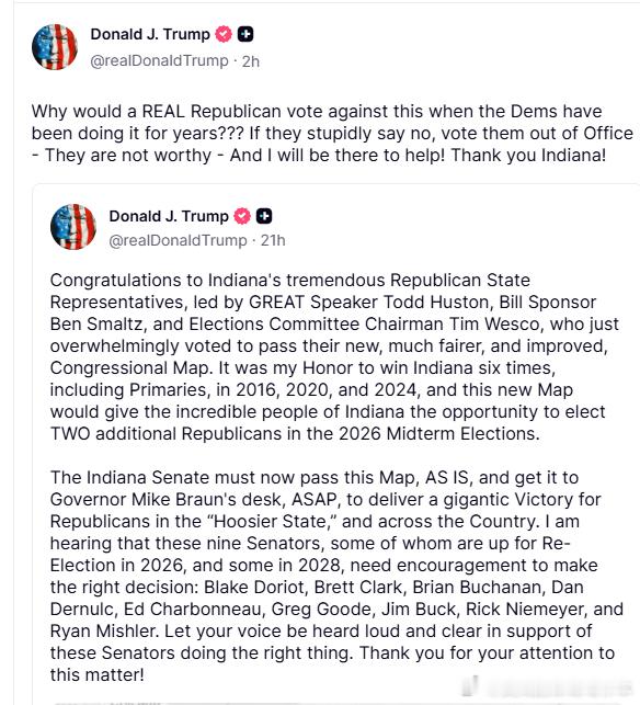 【黄金时代】川普誓言,共和党谁反对印第安纳选区划分,就把他赶下去!川普:真正的共和党人怎么会反对这项提案呢?民主党人可是已经这么做了好几年了!如果他们愚蠢地投反对票,那就把他们赶下台——他们不配!我会全力支持他们!谢谢你,印第安纳!美国和欧洲当代史川普主义研究热点现场海外新鲜事