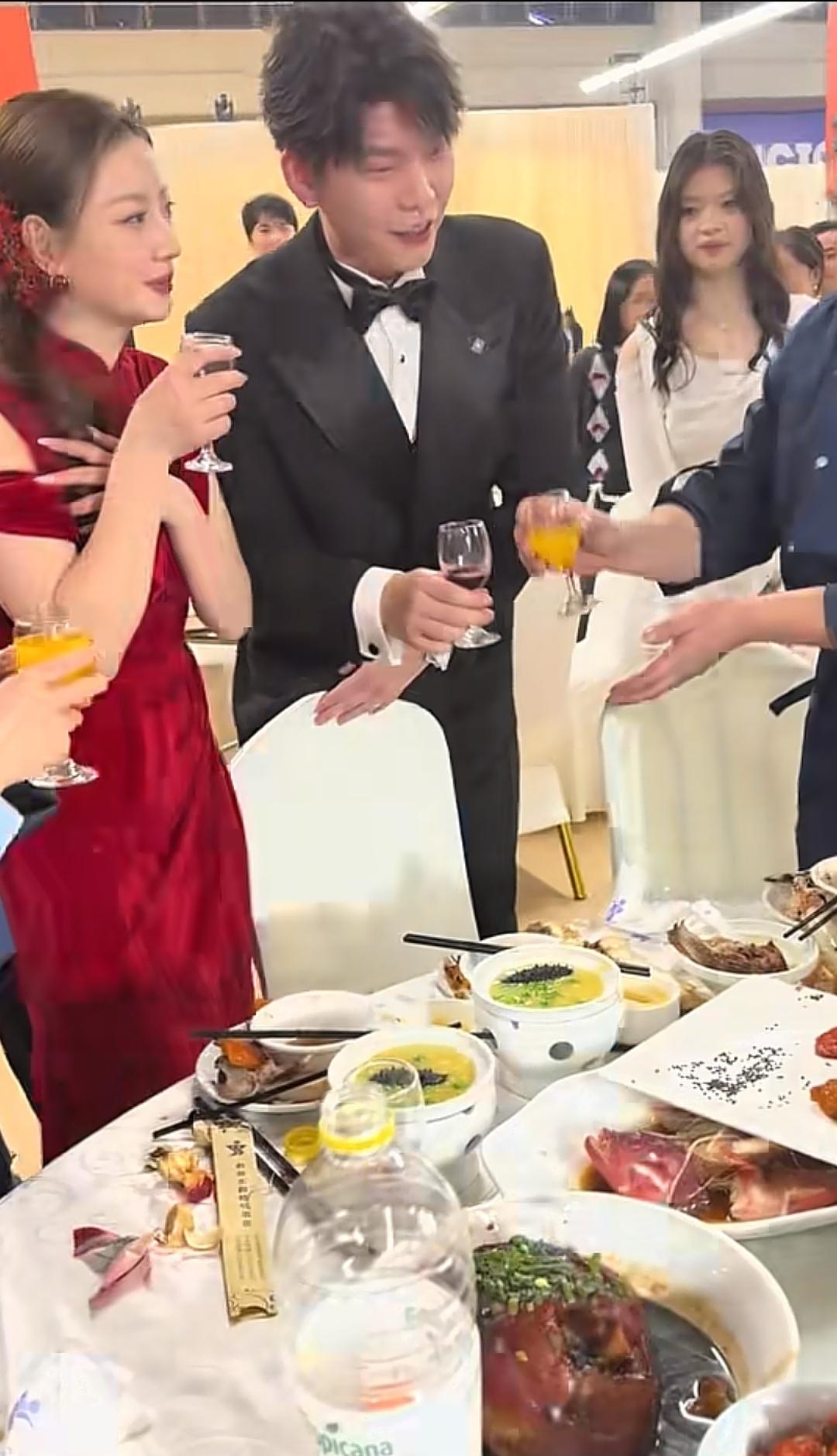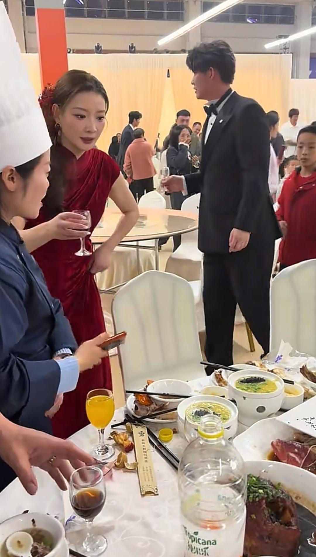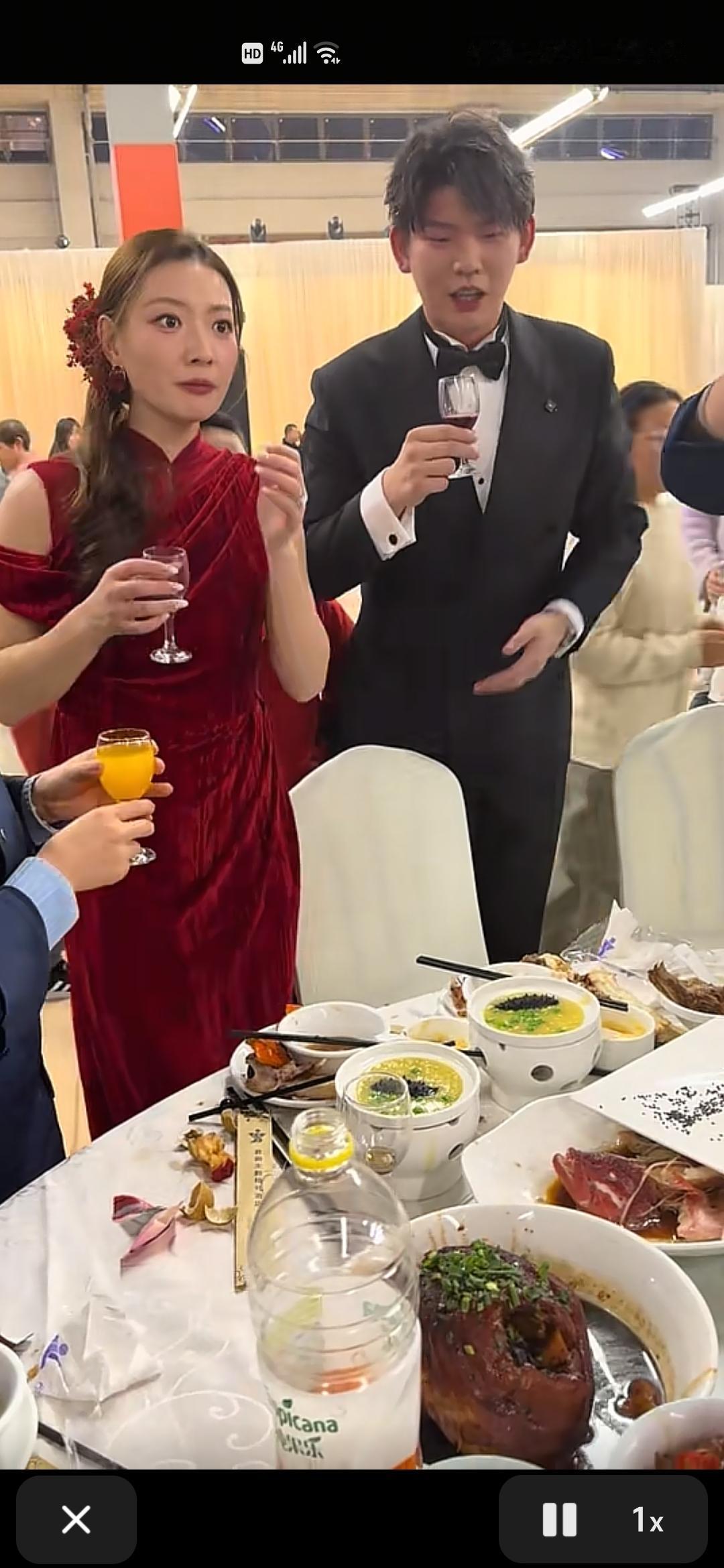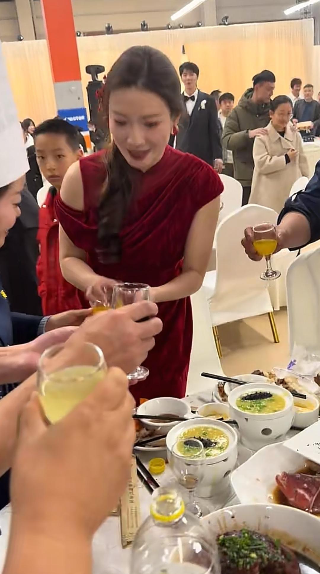 12月6日,黄雅琼、刘雨辰回到浙江衢州举办婚礼百桌宴请,两个人作为新婚燕尔,答谢前来的亲朋好友。 黄雅琼作为新娘,穿的很喜庆,红色裙子礼服,佩戴红色耳环,头发发卡也是红色,戴着钻戒。新郎刘雨辰穿着黑色西装,白色衬衫,看起来很帅气。 两人的婚宴地点选择在了雅琼运动馆羽毛球馆,很有意义,最后还在专门举杯答谢厨师们,落落大方,并进行合影。