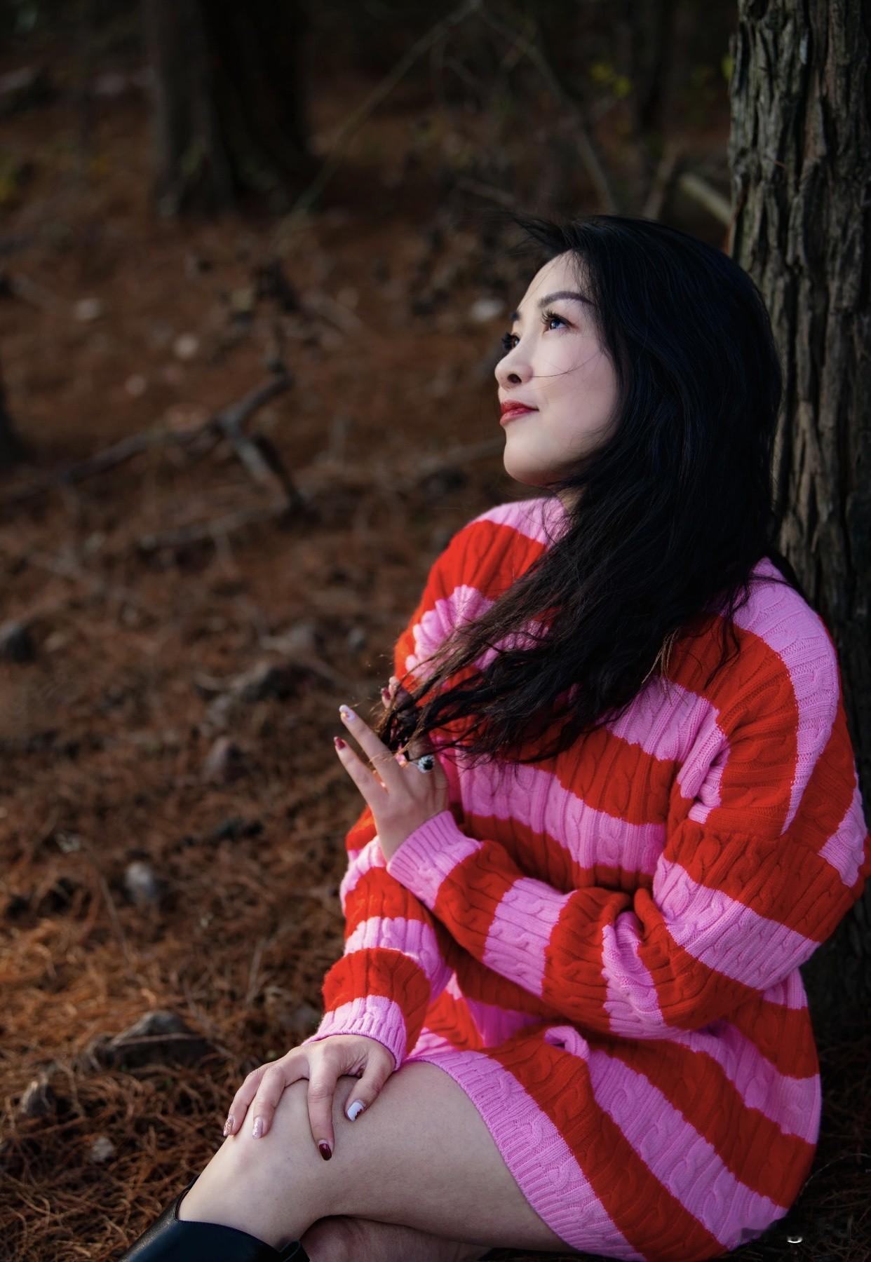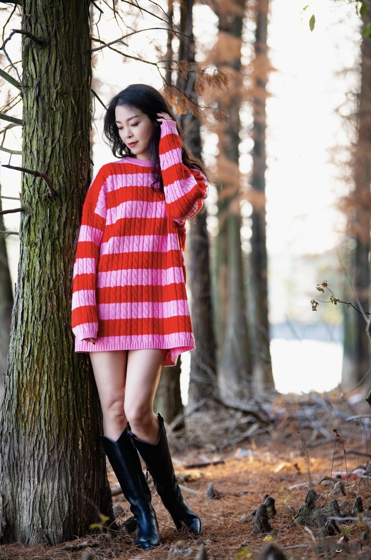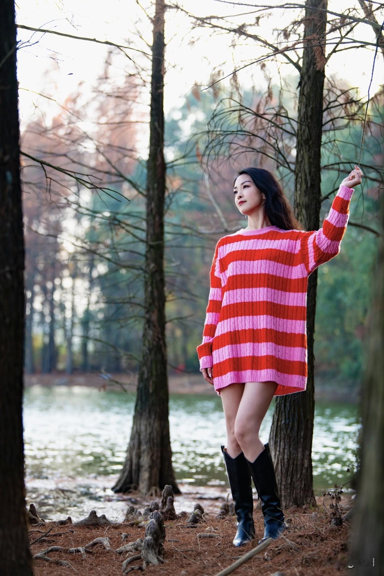 如何穿搭显得淑女一点秋日森林里的少女,红白条纹毛衣搭配黑色长靴,自然与时尚的完美融合。