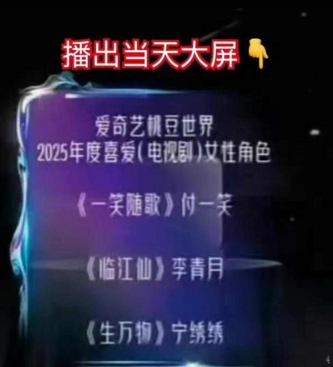 爱奇艺道歉爱奇艺颁奖失误 昨晚爱奇艺尖叫之夜颁奖失误,原本名单是刘诗诗在《淮水竹亭》饰演的东方淮竹,颁成了白鹿在《临江仙》饰演的李青月。随后,爱奇艺发文道歉,称因工作疏忽导致信息有误,“我们对此事带来的影响郑重致歉,后续工作将更加严谨。”