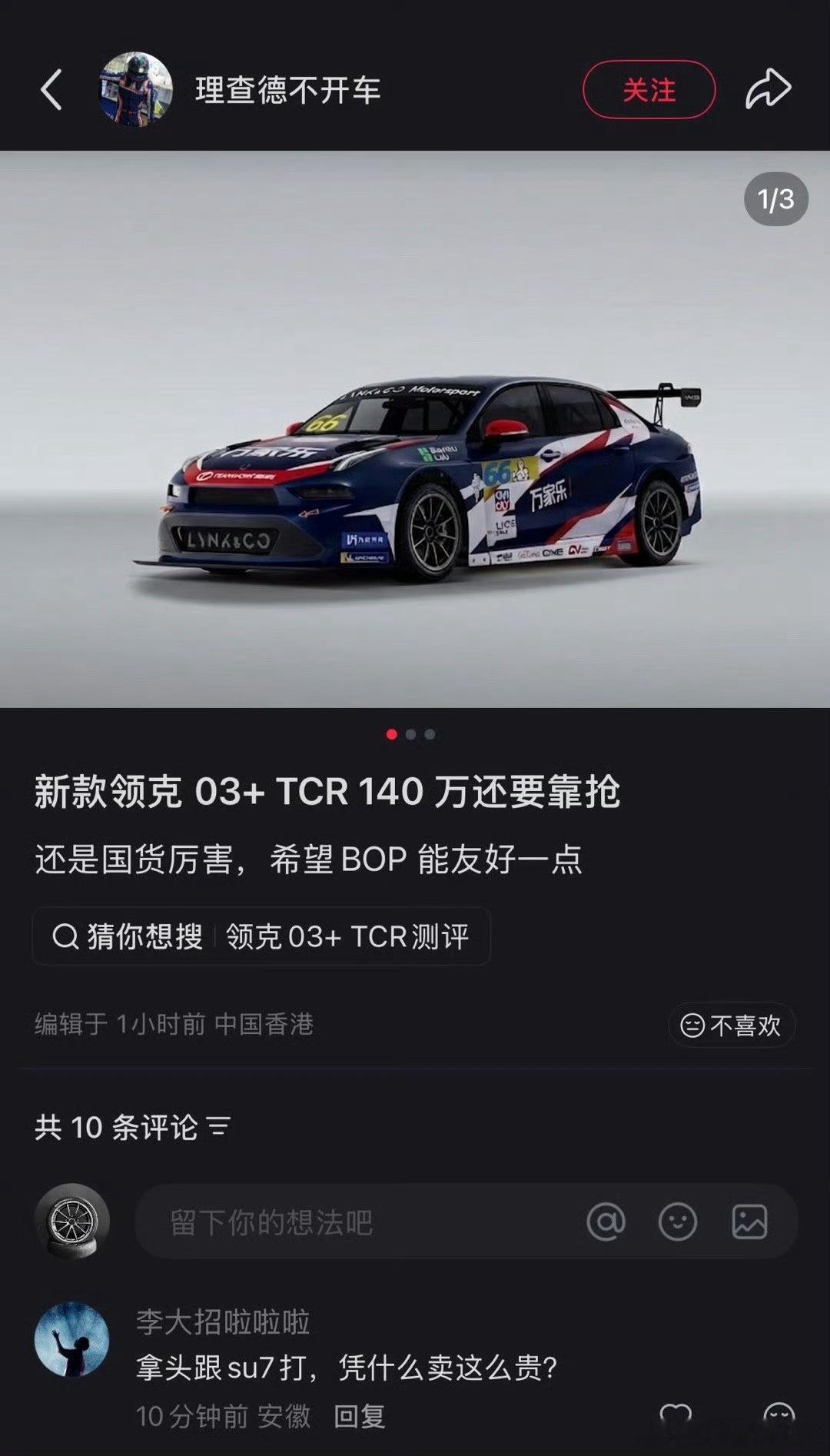 一边是领克03TCR赛车首批产能售罄另一边是有网友:拿头跟SU7打,凭什么卖这么贵给大家解释一下,量产赛车和SU7的区别吧,领克03TCR赛车能持续快,因为赛事时长一般会30分钟以上,赛车就需要稳定的快而SU7U跑一圈纽北,电量就消耗了大约50%,也就意味着SU7U在赛道上连15分钟都撑不下来,就没电了。更不用说可能刹车都撑不到纽北的第2圈。纯电SU7U的这点赛道续航,怎么能跟领克03TCR赛车这种稳定持久的快来对比呢所以SU7U和领克03TCR是两种快,一种是单圈战神,另一种是一直快。
