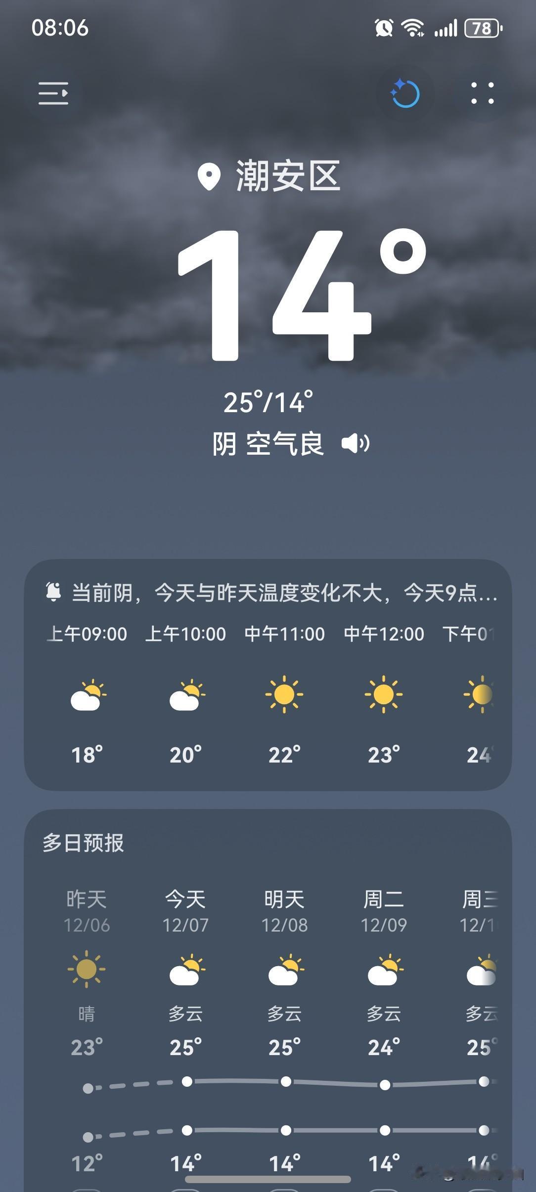 今日大雪!冷空气继续影响我国北方地区,南北温差较大。周末广东天气晴朗,继续升温中。 未来几天,广东大部多云为主,气温缓慢回升,日较差逐渐增大,早晚寒凉,需要注意根据温度增减衣物。 10日至13日,另一股强冷空气将影响我国大部地区,将带来大风、降温和大范围雨雪天气。 之前的冷空气从北方到南方,再到广东,强度不断减弱。网友纷纷调侃:“冷空气来到广东只剩下空气了”! 但下周的冷空气强度较大,给广东带来明显降温,而且还是带了礼物——雨水。冷空气叠加雨水带来的降温,效果很明显,酸爽得不要不要的。 今天(7日),潮州喜提多云天气,气温14~25℃,此刻气温14℃,体感温度11℃。 虽说今天的全天最高气温有25℃,但是早上阴天,外面的风也有点大,体感只有11℃,感觉还是蛮冷的。 不是说“早起的鸟儿有虫吃”吗?怎么到我这就成了“早起的鸟儿有得冻”? 不管怎样,早起的人儿还是需要穿多件衣服的,别让感冒病毒有机可乘了! 今天的天气,除了早上有点冷,其它的还是挺好的。五星好评就给不了了,但好评还是必须有的。 如此天气!元芳,你怎么看? [我想静静][捂脸][笑哭][我想静静][捂脸][强][笑哭][我想静静]