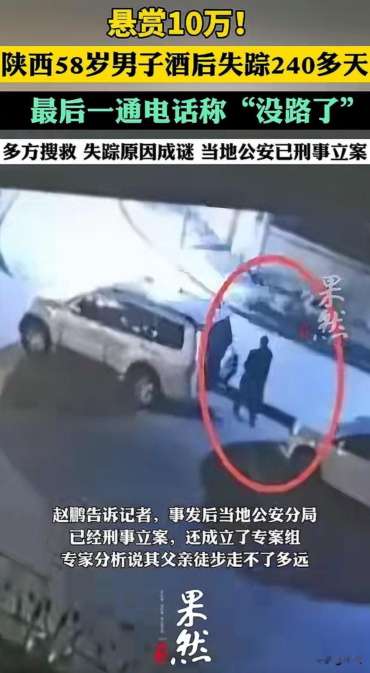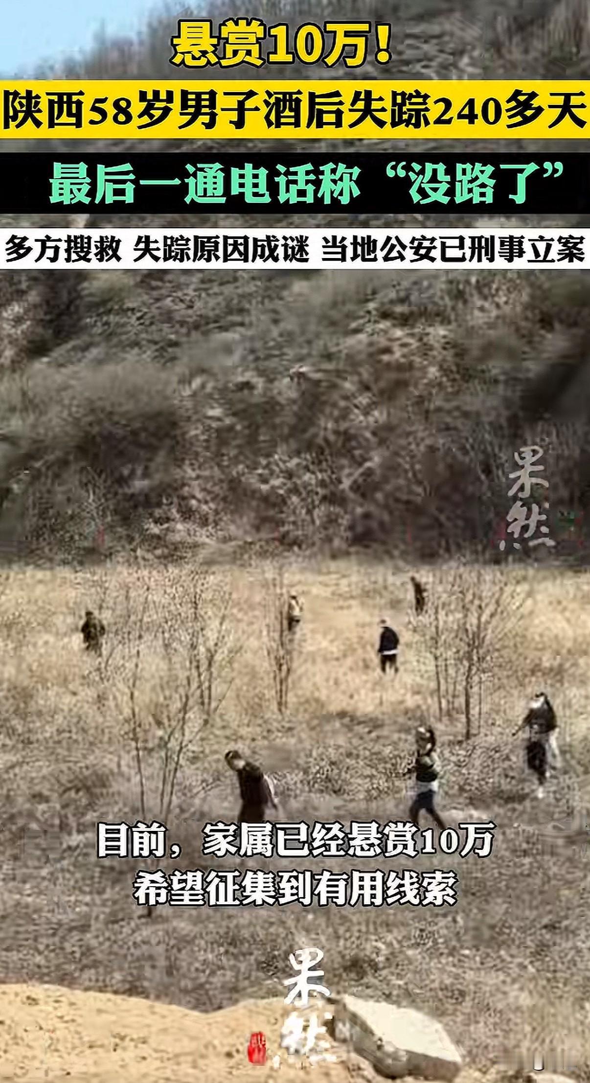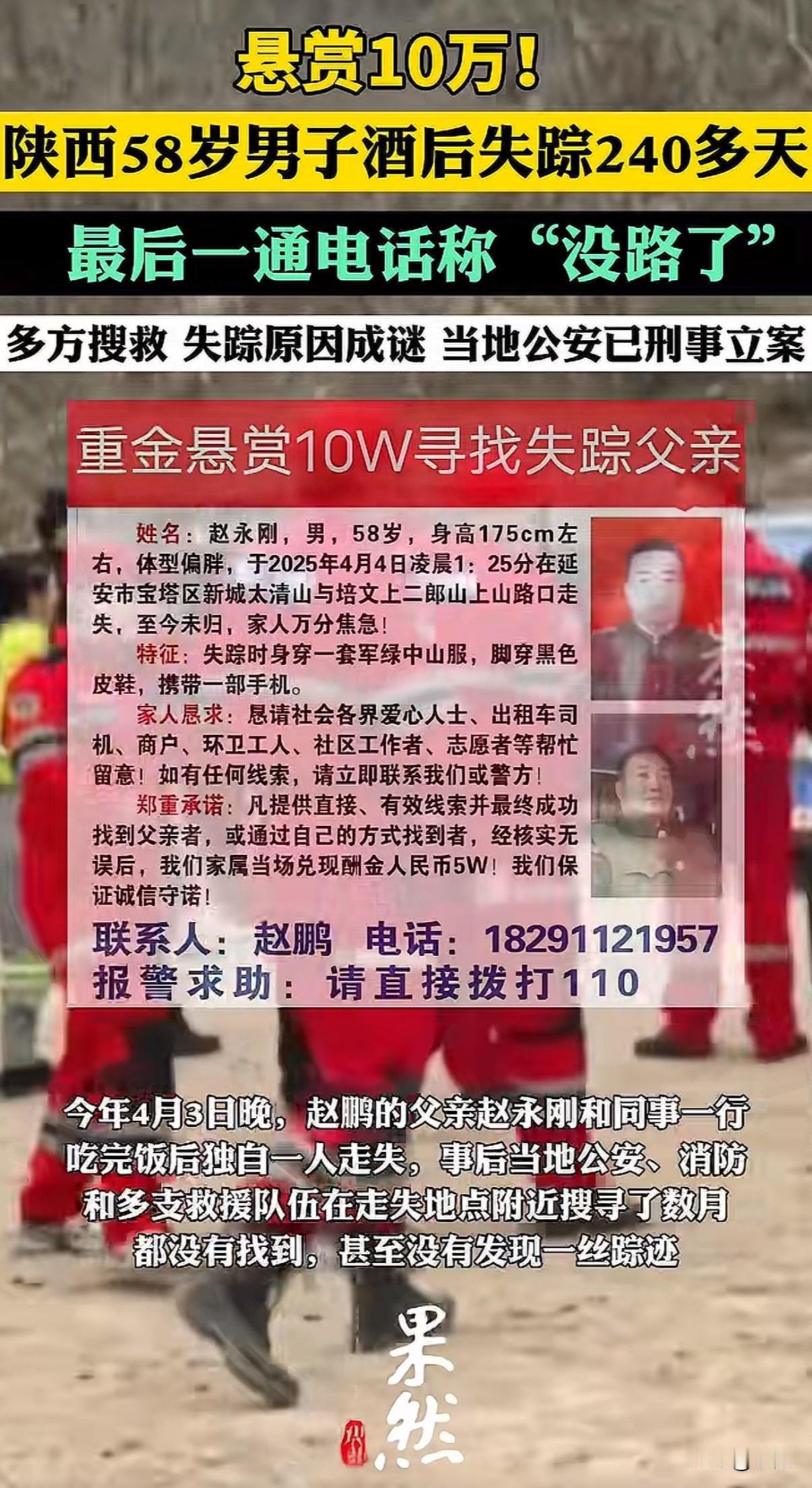 悬赏十万寻人!陕西58岁男子饭后离奇消失,240天音讯全无,最后通话一句“没路了”成谜 跟朋友吃顿饭的功夫,一个大活人消失了。不是几分钟,不是几天,是整整240多天。生不见人,死不见尸。这是最近发生在陕西延安,一件让人揪心又费解的真事。 失踪的人叫赵永刚,58岁,延安本地人,是个校车司机,也是小区业委会主任。家里人说他性格开朗,热心肠。 事情发生在今年4月3号晚上。老赵和几位业委会同事、物业经理,在人民公园旁边一家餐馆聚餐。晚上十点五十左右,饭局散了。一个朋友说开车送他,转身去上厕所。就这几分钟,等在门口的老赵不见了。 家人开始打电话。电话通,没人接。一直打到凌晨2点01分,儿子赵鹏才打通。 电话那头,老赵的声音断断续续传过来:“往回走了……没路了……”然后,通话就断了。这是老赵留下的最后一句话。凌晨三点左右,手机彻底关机。 人到底去哪了?监控拍下了一条令人困惑的路线。 从餐馆出来后,老赵没有往家走,而是步行了起来。监控里,他脚步有点晃,像是喝了酒。儿子赵鹏说,父亲酒量不错,那天喝了半斤左右,按理不该醉成这样。 他先是走了约3公里,到山脚下一所学校,又走了约2公里到宝塔区第四中学,最后绕了一大圈,又回到了山脚下——太清山与培文上二郎山的上山路口。全程大约8公里。 4月4号凌晨1点25分,在这个上山路口,监控镜头记录下他最后的身影,随后,他走进了夜色笼罩的山路,再无踪迹。 一个细节让家人觉得反常:老赵平时不抽烟,但那晚,一起吃饭的人说,他抽了5根烟。 早上五点,天还没完全亮,家属就报了警。一场大规模的搜寻立刻展开。 警方刑事立案,还成立了专案组。派出所民警、刑警、特警、消防队全上了。专业的救援队也一批批赶来,陕西省秦岭救援队、延河救援队、红十字会、蓝天救援队……都加入了。 山上地形复杂,沟壑纵横。热成像无人机在天上飞,搜救犬在地上找。为了搜寻,甚至动用了专门训练过的搜尸犬。从4月到8月,几千人次把附近的大小山头,像梳头一样过了很多遍。 结果却令人绝望。没有找到人,没有找到手机,连一只鞋、一片衣服碎片都没发现。整个人,仿佛被那片山林无声地吞没了。 警方后来的回应也提到了搜寻的难点:当地山林环境太复杂了。 专业队伍撤了后,家里人没放弃。儿子赵鹏在网上买各种寻人工具,一有空就自己上山找,涵洞、山沟都不放过。他说,自己已经没心思上班了。 时间一天天过去,希望越来越渺茫。家属把悬赏从最初的5万,提高到了10万。承诺只要提供直接线索并最终找到人,当场兑现。 一个好端端的人,一次普通的聚餐,怎么就走到这一步? 是意外迷路失足吗?那句“没路了”,和他踉跄的步伐,让这种可能性显得很大。复杂的地形里,是否还有人力未曾触及的角落? 是自杀?但所有家人朋友都强调,他之前情绪稳定,生活没听说有大变故。那5根烟,成了唯一反常却无法解读的信号。 还是存在其他不可预知的可能性?警方以刑事案件立案侦查,本身就保留了各种可能。但目前,没有任何公开信息支持这种猜测。 每一种推测都似乎有点影子,但每一种都缺乏确凿的证据。这正是整件事最让人无力又好奇的地方。 现在,赵鹏还在网上持续发布寻人信息。那件军绿色的中山装,依旧没有主人。一个开朗热心的普通人,他的消失,像一块石头投入深潭,涟漪过后,只剩下一圈沉重的问号。 (如果您有相关线索,请务必联系当地警方或家属。愿每一个走失的人,都能找到回家的路。)