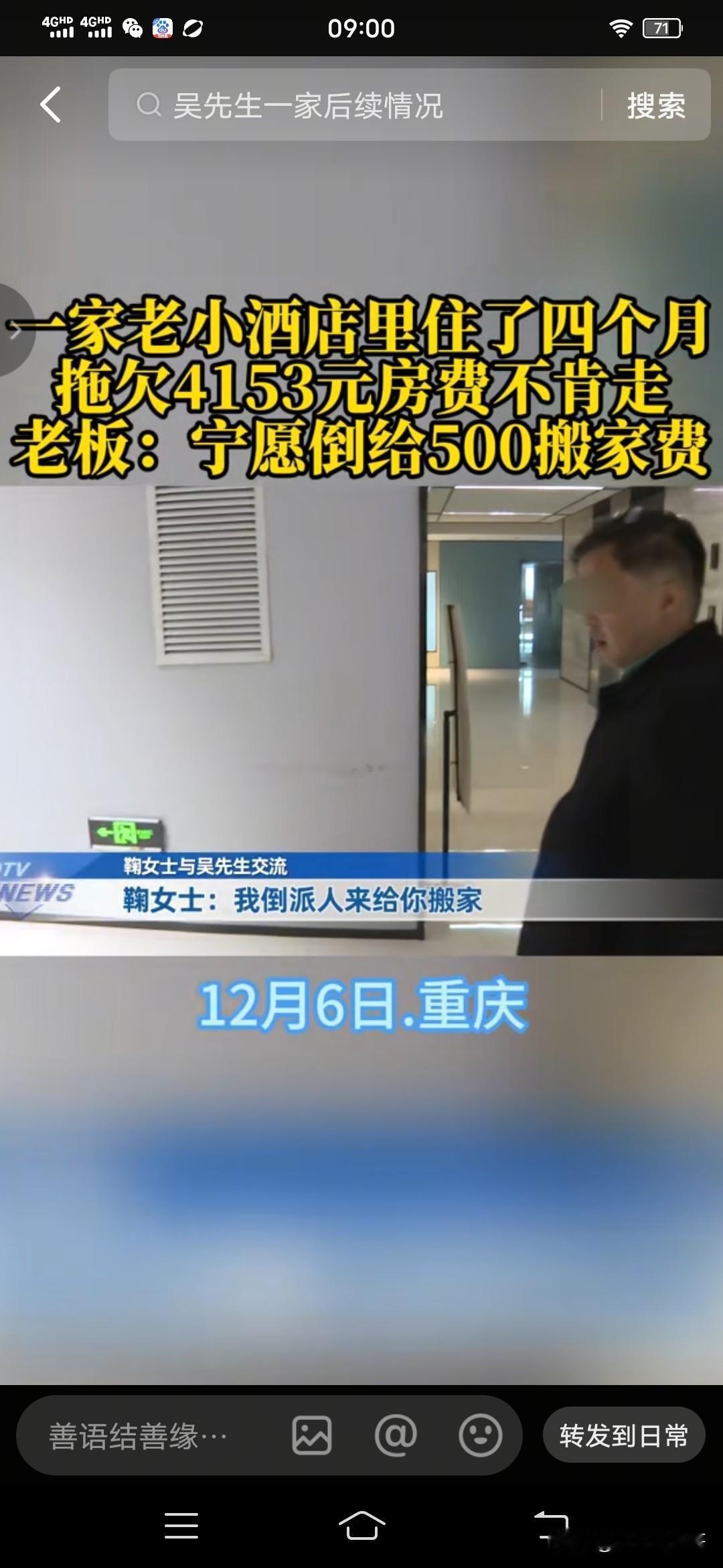 太奇葩 , 一家人0元住酒店,老板劝其搬离不要房费还被骂,你算哪根葱 ? 据天天630报道 , 吴先生带着10岁儿子和他年近80岁的母亲入住重庆一家酒店。 最先交房费还很正常,但自从11月8号起至今却1分房费都不交 。 累计欠下酒店房费4000多元 。 酒店老板多次催缴,吴先生都说没钱,要再等等。 不得已酒店老板求助天天630记者,希望能从中调解 。 老板对记者说, 她可以不要吴先生欠下的4000多元房费,只要他能帮走就可以啦 ,并且还愿意补他500块。 记者问老板为什么他欠房费这么久还让他住。 老板苦恼的说他不搬啊 , 他有老人小孩,我又不忍强制搬离 。 他的房间从来不缺人,不是他的老妈妈,就是他的小儿子在里面,我们又不能把门锁起来 。 每次向他要房费他就说没钱 。 记者等候了一阵,吴先生回来了。 吴先生承认他是欠了房费, 他不是不交,现在确实没钱,之所以住这个酒店,是因为离法院近,他跟别人打官司 跑法院比较方便,别人欠他10多万还没要到 , 要到了就付房费 。 酒店老板就跟他讲道理,说我等不起呀, 你现在搬出去,我不要你欠的房费,我还补你500块,并且我请人帮你搬东西 。 没想到吴先生很生气 ,说你算哪根葱叫我搬走?我们是经济纠纷, 你觉得你有道理,你就去法院起诉 。 说完进入房间把门反锁。 记者听了都无语了 。 酒店老板表示,她打算用法律武器保护合法权益,向法院起诉这个吴先生。 支持酒店老板起诉这个吴先生 , 不能让他无休止的白嫖下去 , 既然走到了起诉这一步,那就不用免除他欠下的房费,还应让他支付房费滞纳金!虽然诉讼这条路漫长也不好走,但是目前要解决的方案也只能这样了。 怎么让吴先生尽快搬出去是酒店老板的 诉求, 除了诉讼这条路,还有没有其他好的办法?欢迎发表你的见解 。