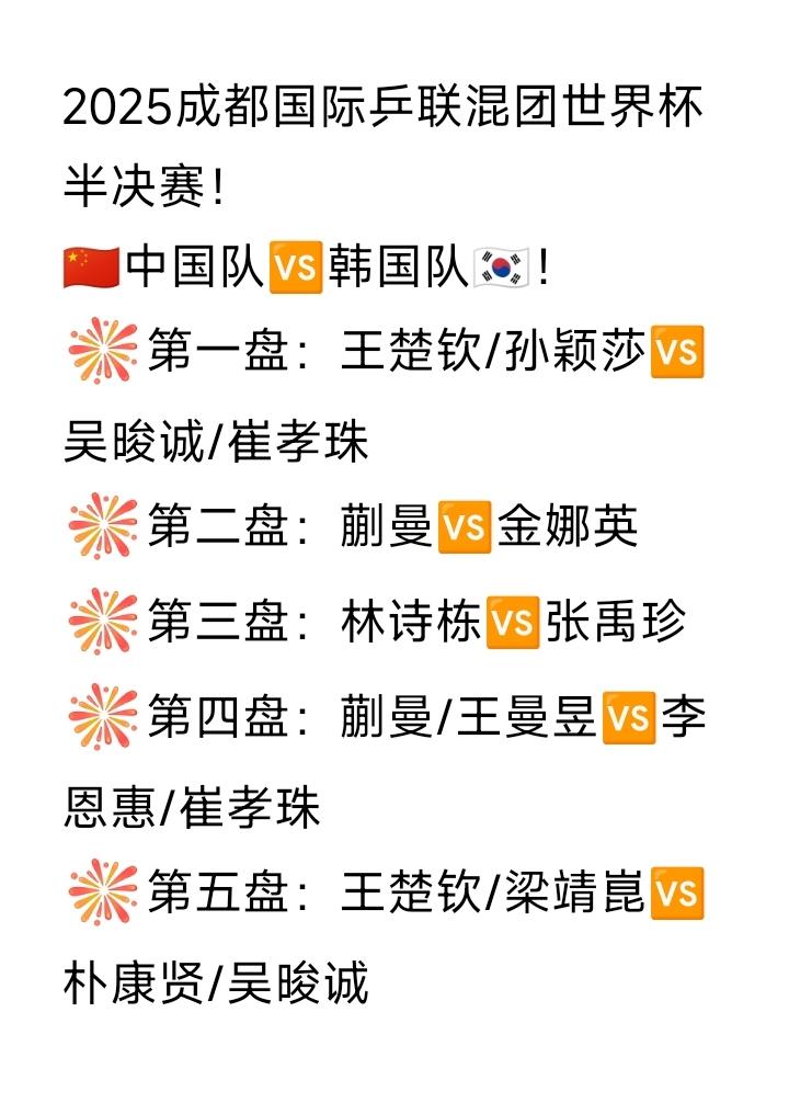 韩国队赌对了! 中韩对阵阵容发布! 2025成都国际乒联混团世界杯半决赛,🇨🇳中国队🆚韩国队🇰🇷,双方排兵布阵如图所示。 虽然是半决赛,中国队依旧是全主力出战,莎头出战混双,石头和蒯曼出战单打。 但是不久前蒯曼曾经输给过金娜英,林诗栋曾经输过张禹珍! 这韩国队真是赌对了,守着个申裕斌却不用,用了金娜英。 林诗栋、蒯曼加油[奋斗]!