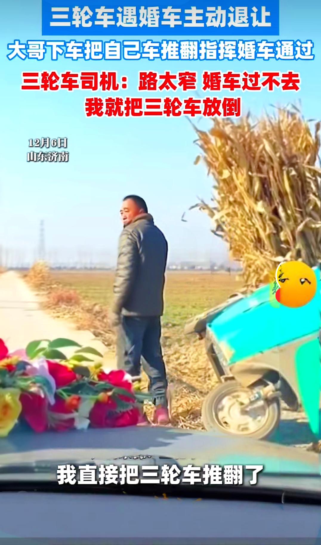 三轮车遇婚车主动退让,大哥下车把自己车推翻指挥婚车通过。 三轮车司机:路太窄婚