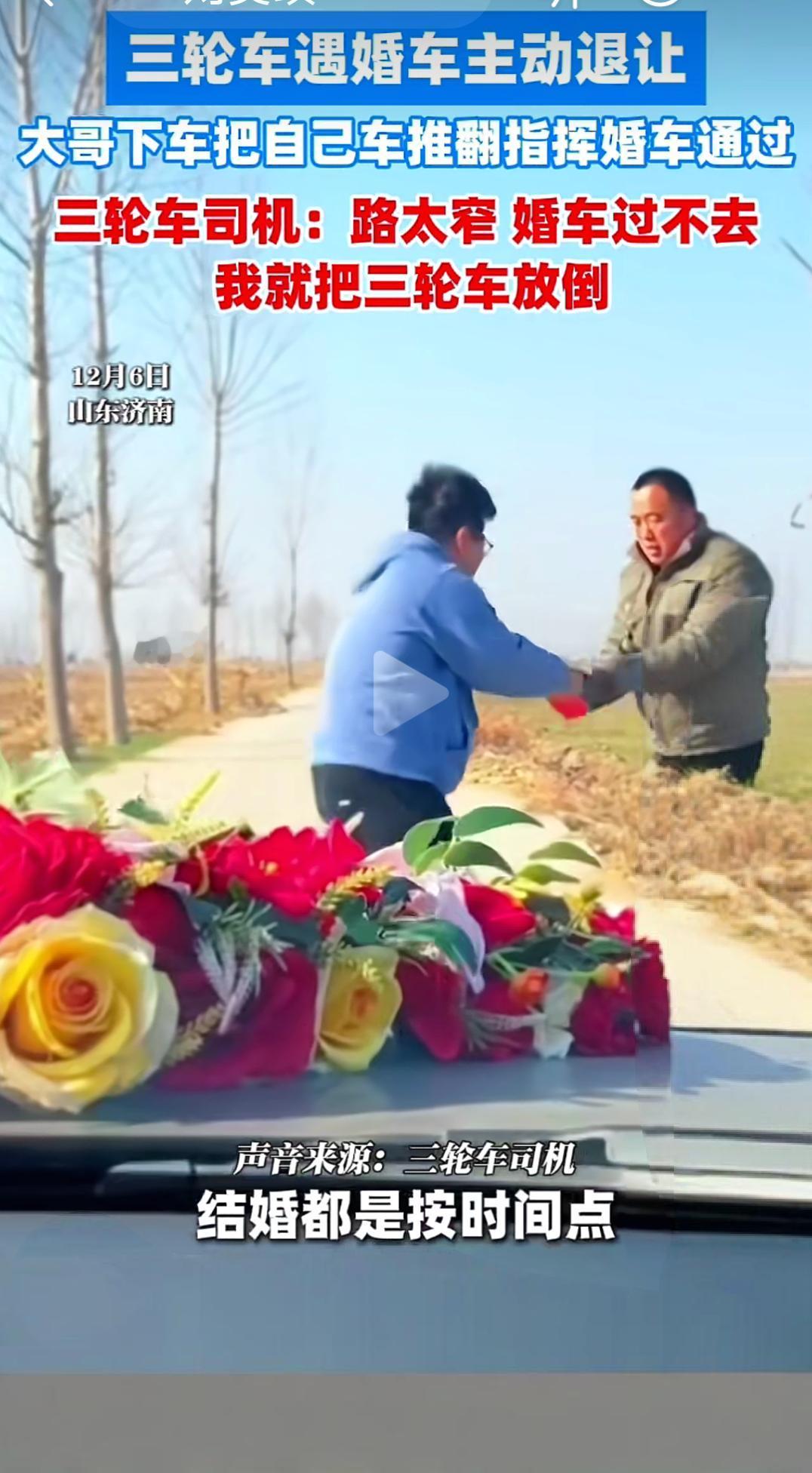 三轮车遇婚车主动退让,大哥下车把自己车推翻指挥婚车通过。 三轮车司机:路太窄 婚车过不去,我就把三轮车放倒。 ​这是一幕发生在城市角落的温暖瞬间,却让无数路人心头一暖。也许你会觉得,三轮车和婚车本就不在一个“等级”,他们的故事也不应该被放在一起讲,但正是这样的小细节,折射出人性中最真、最善良的一面。 那天,繁忙的街道上,一辆豪华的婚车缓缓驶来,车队中的喜庆气氛让人感受到新生活的希望与甜蜜。然而,前方的路变得狭窄,婚车在狭窄的街巷中踟蹰不前。就在此时,一辆不起眼的三轮车出现在了视线里。 面对婚车的阻碍,三轮车司机没有选择抱怨或退让,而是主动做出了让步。只见他稳稳地下车,用力推倒了自己那辆微不足道的三轮车,挡在了路中间,指挥着婚车安全通过。这一幕,令人动容。 有人或许会觉得,司机这是“赔了自己”的行为,但实际上,他用行动告诉我们:善意和责任感,不分身份和地位。那一刻,他没有多想,只是本能地想让别人顺利,也让这个城市的角落多了一份温暖。 “路太窄,婚车过不去,我就把三轮车放倒。”简单的一句话,却饱含着大爱。或许在很多人眼中,这只是个普通的交通场景,但它背后,却隐藏着对生活的理解和对他人的关心。 这件事让我们反思:在这个快节奏的社会中,是否还留有那份“愿意为他人让一步”的善良?是不是每个人都能在自己的岗位上,像这个三轮车司机一样,用一份责任感去温暖这个城市? 或许,我们每个人都可以从中汲取力量。生活不总是一帆风顺,但只要我们心怀善意,主动退让,哪怕是微不足道的一次让步,也能成为这个社会最美的风景线。 这个故事,提醒我们:善良不分身份,责任感无关地位。它在平凡中闪耀,在细节中彰显人性之美。或许,下次遇到类似的场景,我们也能多一份理解与包容,让这个社会变得更加温暖。 你是否也曾在生活中遇到过类似的“让一步”?你又会如何选择?留言告诉我,让我们一起用行动,传递这份温暖与善意!婚车挡路