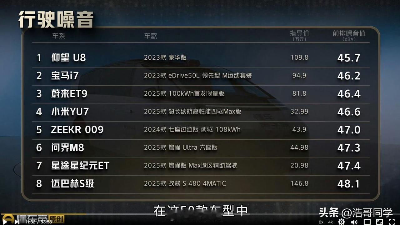 如果我丢出这两张对比图,阁下应该如何应对呢?懂车帝原创近期对市面上众多车型做了一个关于音响效果、隔音能力、行驶噪音等方面的测试,结果让人出乎意料。小米YU7 Max版本的静态隔音能力居然优于尊界S800,如果单从价格来说,尊界>小米,可能小米在隔音配置堆料方面舍得下功夫,隔音棉等材料堆的全车到处都是,为的就是驾驶员驾驶时的舒适感。在行驶噪音测试环节,小米YU7居然优于百万豪车迈巴赫S级,所以,隔音这件事,并不是你车越贵就越好,还得看车企对隔音这件事是否舍得堆料,我个人认为,小米YU7是一台六边形战士,各方面的表现都很不错,尤其是在舒适性方面尤为出色!汽车噪音测评