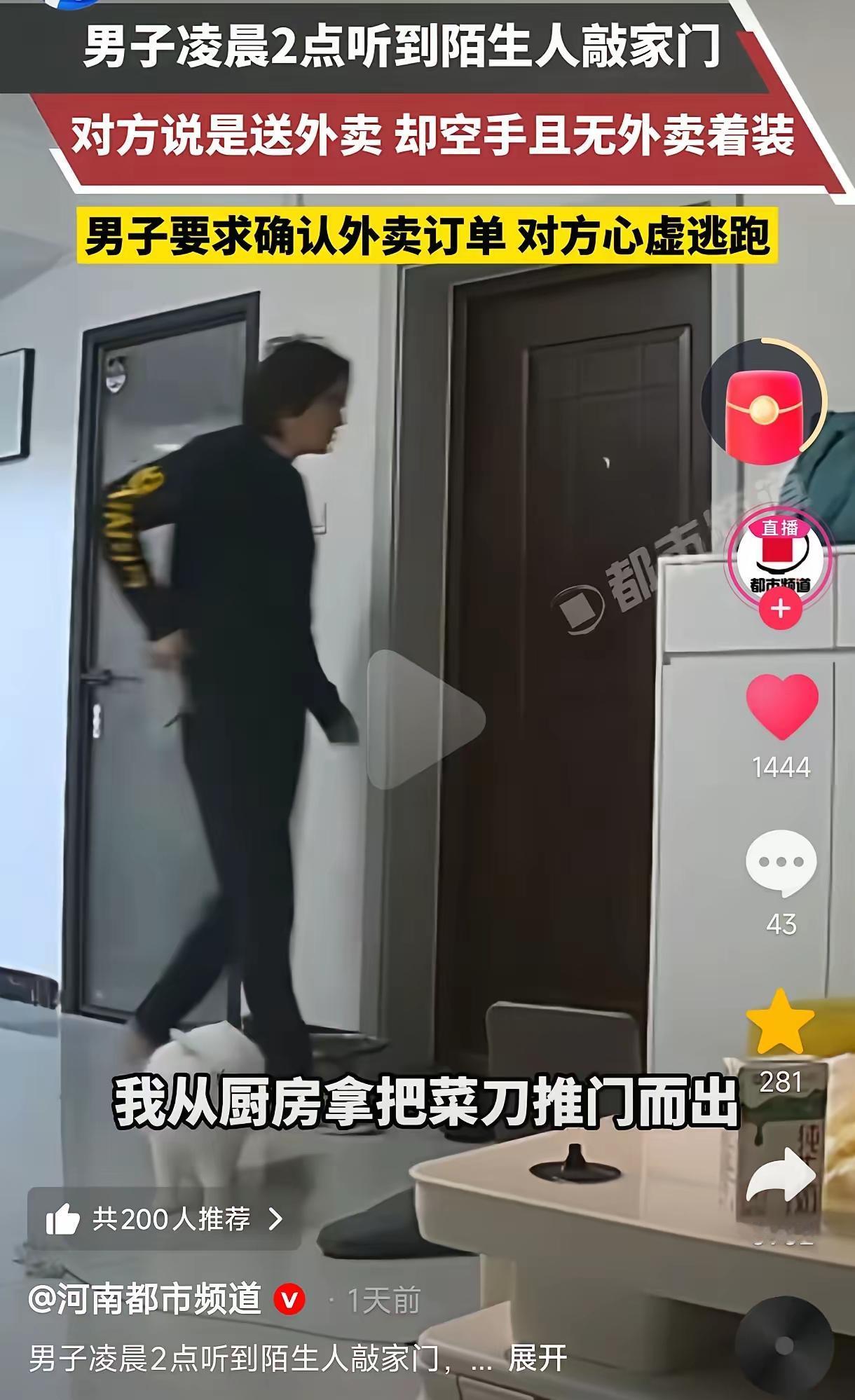 “警惕!”河南,男子凌晨2点听到陌生人敲门,感觉不对劲,就拿了把菜刀开门询问,