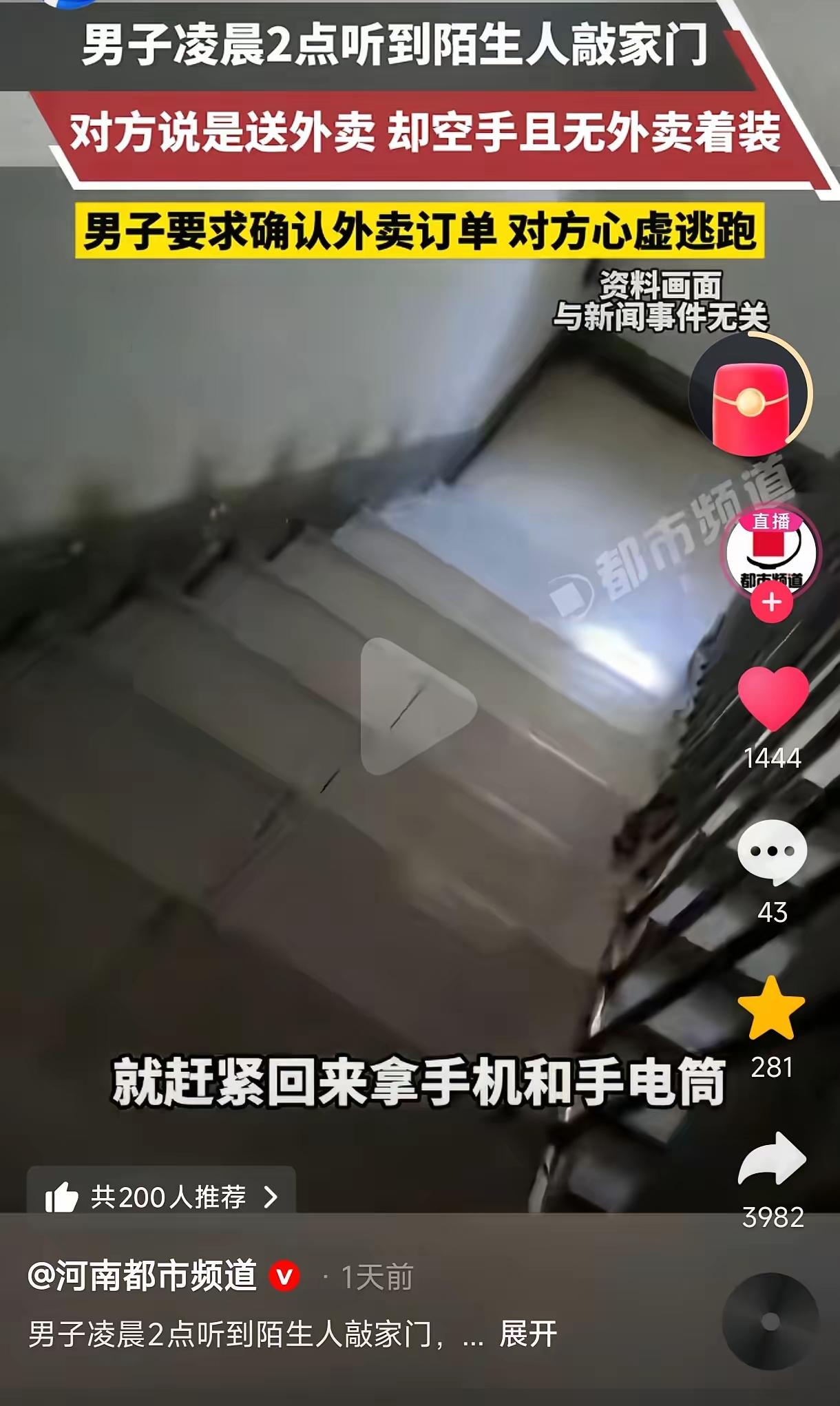 “警惕!” 河南,男子凌晨2点听到陌生人敲门,感觉不对劲,就拿了把菜刀开门询问,对方自称是送外卖的,男子却发现他手上没外卖还没有穿外卖服,肯定在说谎,就让他出示外卖订单号,对方见谎言被戳穿,赶紧一溜烟往楼下逃跑,男子跟着追去想拍下对方的样子却发现没带手机,只得返回。 这起凌晨的“遇险记”,让我们再次意识到:安全无小事,防范要到位。河南男子的敏锐反应,为我们敲响了一记警钟。深夜时分,陌生人的敲门声本应让人警惕,但在这个信息爆炸、骗子层出不穷的时代,单凭直觉还远远不够。男子凭借一份冷静和警觉,成功识破了“送外卖”的谎言,避免了一场可能的危险。 你是否也曾在深夜听到奇怪的声音?你是否也会在第一时间选择开门,还是会像他一样犹豫、警惕?这场看似普通的遭遇,实则折射出我们每个人面对突发情况时的反应。有人可能会觉得“没事,可能是真的送外卖”,有人则会像男子一样,反应迅速,保持怀疑。这种区分,正体现了人性中最宝贵的部分——警觉与理智。 但更值得深思的是:在这样一场“真假外卖”的游戏背后,隐藏着的是社会安全的隐忧。骗子的伎俩不断翻新,手段越来越隐蔽,甚至利用我们对陌生人的信任或疏忽,趁虚而入。而我们每个人,都在这场看不见的战斗中,既是受害者,也应成为守护者。 男子追逃的场景,也引发了我们的共鸣。谁都希望自己能第一时间捉到“坏人”,但现实中,手机丢了、没有带钱包、或是没有及时报警,都会成为行动的“障碍”。这提醒我们:在黄金时间内,安全意识不可或缺。家门口的警惕、手机的随身携带、紧急联系方式的备份,都是我们守护自己和家人的第一道防线。 这件事情还折射出一个更深层次的社会问题——我们每个人都应成为“安全守望者”。不是每次危机都能靠他人来救援,主动防范、提高警觉,才是真正的“自我保护”。社会的安全,不仅仅是公安部门的责任,更是每个公民共同的责任。当我们都能像这位男子一样,保持一份敏锐和警觉,也许下一次的“危机”就能避免。 而且,这也提醒我们:在现代社会,科技的力量可以帮我们一臂之力。安装安全监控、使用报警APP、设立家庭安全方案……这些都是让我们更有底气面对突发事件的“护身符”。主动防范,不仅是对自己负责,更是对家人、对社会的负责。 最后,我想说:每一次的危机都是一次警醒。只要我们保持警觉、善用科技、增强安全意识,就能在潜在的危险面前,立于不败之地。安全,从来都不是偶然,而是每个人用心守护的结果。让我们从这起事件中汲取教训,警惕于未然,用行动守护平安。因为,只有人人都成为安全的守望者,社会才能更和谐、更有温度。突发意外风险 安全事故记录