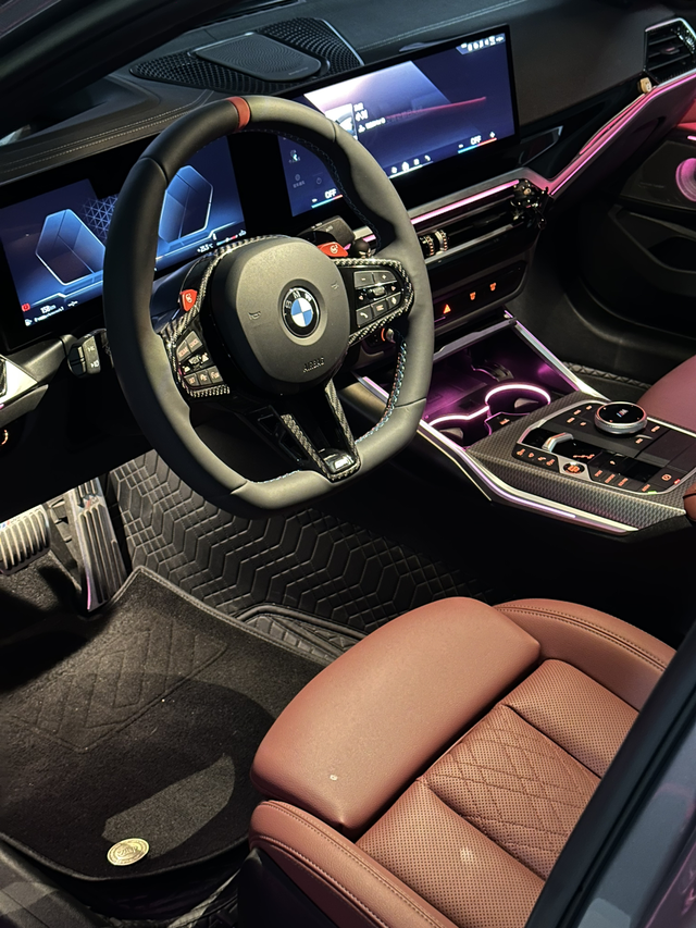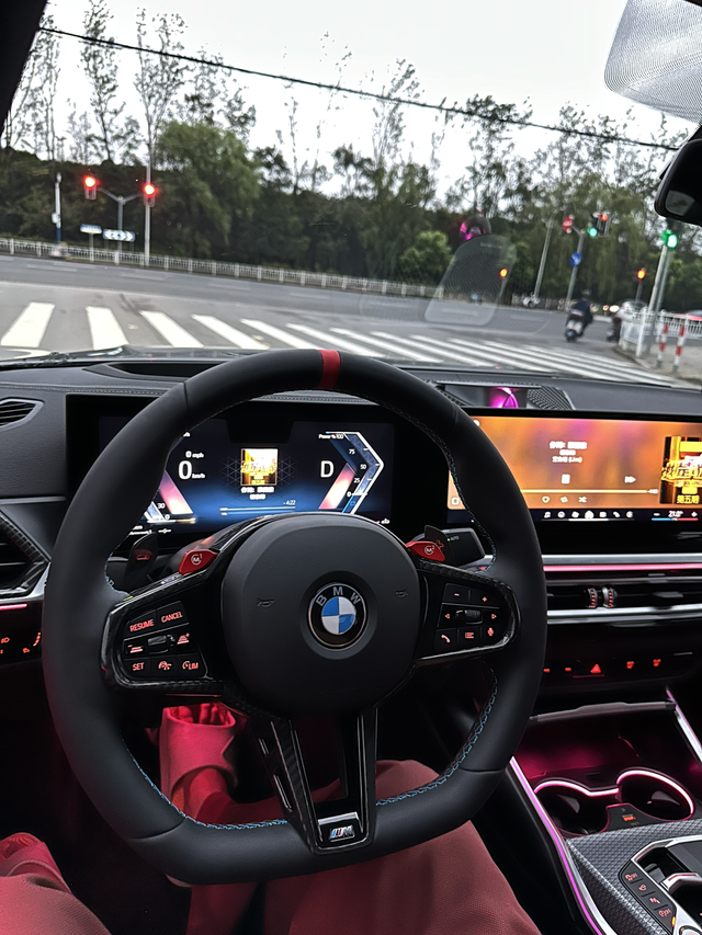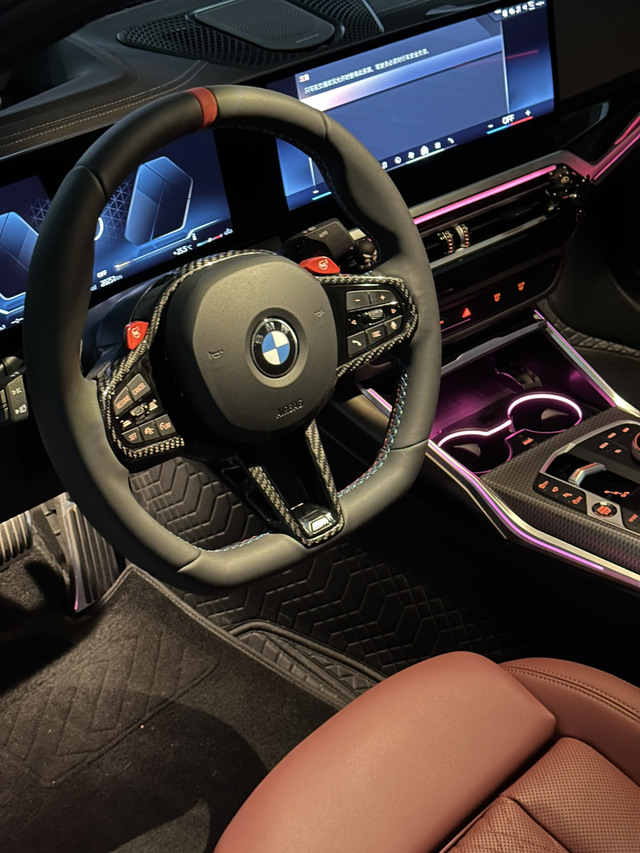 悦人不如悦己3系方向盘改装 原车真皮方向盘手感挺好的,盘体粗握感粗壮也没用多久也没包浆,但视觉上太笨重,银色盖板很廉价,前些天无意间看到这款CS赛道方向盘,立马就换了一套了,红色回正标加上方向盘底是平的视觉上运动好多不会笨重,盘体相比原车的细一点点,同样真皮的手感跟原车一样好,而且细节处的缝线是3色缝线。 最讨厌的原车银色盖板变成了碳纤维的,是真碳!下方碳纤维镂空设计超斩男。原车银色塑料换挡拨片变成加长的碳纤维拨片,同样是真碳! 购入的是副厂的,原厂的太贵了,价格差四五倍个人觉得一个方向盘没必要,方向盘按键模块、气囊模块等都是原车方向盘移植过去的,原车黑色按量配黑色碳纤维盖板竟然意外的好看好搭,因为配原车银色盖板都显得很丑很廉价。