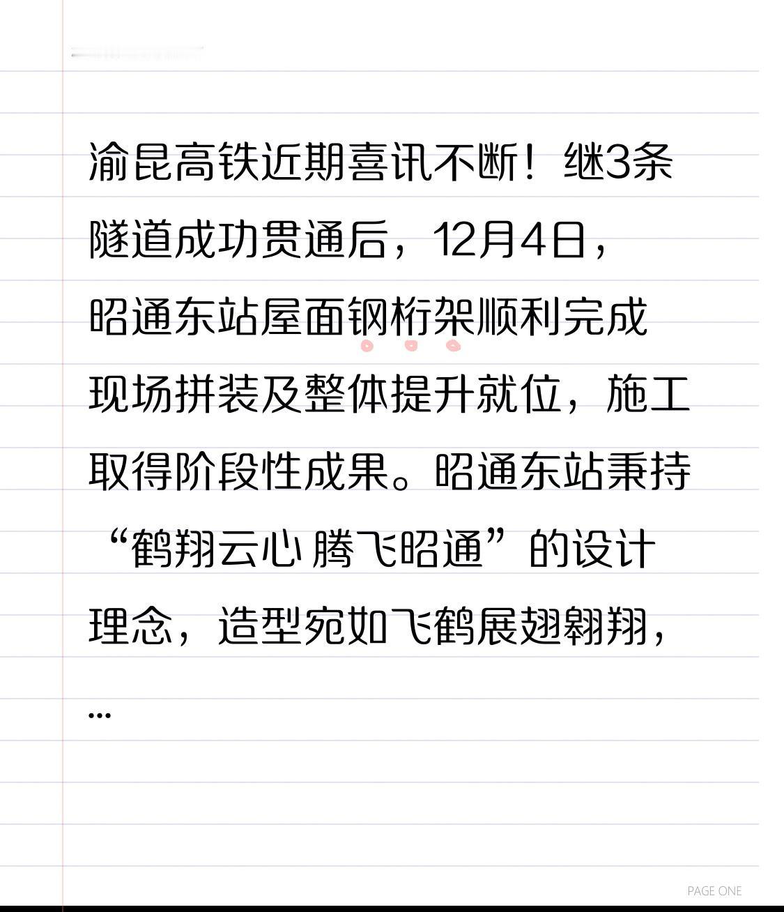 [烟花][给力][烟花][加一]渝昆高铁近期喜讯频传!继3条隧道成功贯通后,12月4日,昭通东站屋面钢桁架顺利完成现场拼装及整体提升就位,施工取得阶段性成果。 昭通东站秉持“鹤翔云心 腾飞昭通”的设计理念,造型仿若飞鹤展翅高飞,建筑面积达2.2万平方米。建设者们采用“分区拼装+整体提升”方案,搭建专业胎架,结合不同拼装方式,还借助计算机同步控制系统调控误差,实现了大跨度空间结构提升。 此次提升的钢桁架总长82米,总宽114米,最大跨度63米,属于大跨度钢桁架。这既验证了工艺的可行性,也为后续建设积累了宝贵经验。期待昭通东站早日建成! 渝昆高铁渝宜段 昆明重庆高铁 渝滇高铁 云南高铁南站 昆渝高铁 昆明到昭通高铁