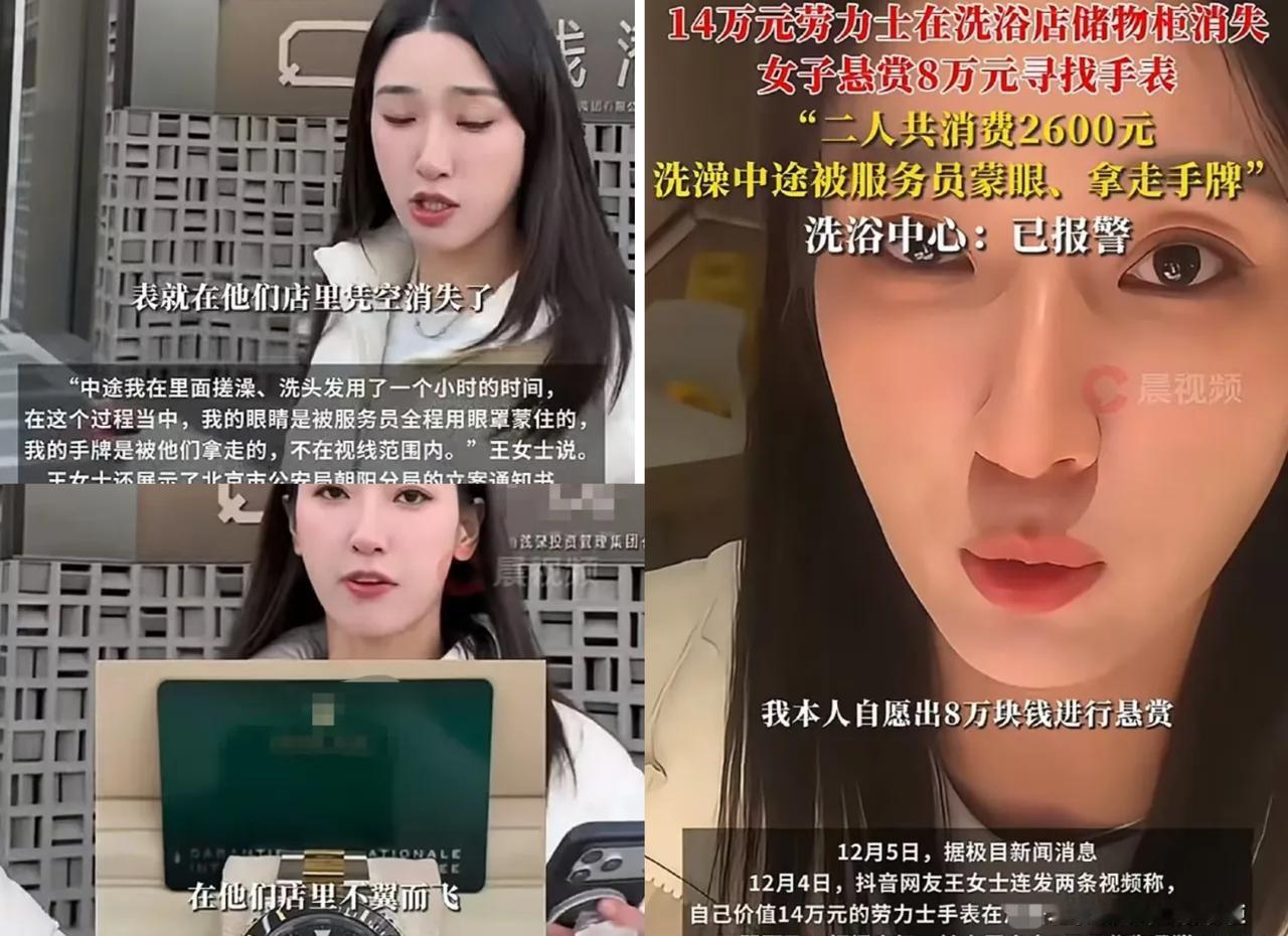 北京,女子去北京游玩期间, 花2640元去洗浴中心放松, 洗澡期间店员将她的眼睛盖住 拿走了她的手牌,结束后女子发现储物柜里价值140000元的劳力士不见了,奇怪的是柜门完好无损,根本没有撬动的痕迹。因手表意义非凡,女子悬赏8万寻找线索。 据红星新闻、潇湘晨报.晨视频等报道,王女士几天前去北京玩耍。 12月1日下午,王女士约了小姐妹一起去东四环某洗浴中心放松。 王女士去北京游玩,花2640元约闺蜜去东四环某洗浴中心享受全套服务,本是想好好放松,没想到把家人送的本命年礼物,一块价值14万的劳力士手表给弄丢了。 这块表的价值对她来说不算顶尖,但承载的心意千金不换,可等她做完项目、吃完自助餐,准备穿衣服时,却发现储物柜里的手表没了踪影。 更蹊跷的是,储物柜柜门完好无损,连一点撬动的痕迹都没有,这让她瞬间想起了服务过程中的一个细节。 当时做搓澡和精油SPA时,店员给她戴了眼罩,还以方便服务为由,取下了她胳膊上的储物柜手牌,而且拿了很久都没还回来。 那会儿她闭着眼睛享受,根本没多想,可手表凭空消失,柜门又没被撬,这手牌脱离自己控制的几十分钟,成了最关键的疑点。 监控明明拍到她进店时戴着手表,现在手表不翼而飞,涉案金额巨大,警方已经立案调查,王女士急得连发两条视频,愿意悬赏8万寻找线索。 这事最核心的争议点在于:手表找不回来,洗浴中心该赔吗?答案其实很明确该赔,而且必须赔。 从法律上来说,王女士花钱消费,就和洗浴中心形成了服务合同关系,《民法典》早就规定了,商家有义务保障顾客消费期间的人身和财产安全。 她把手表放进店里提供的储物柜,相当于和店方形成了保管合同,店方就得尽到保管责任。 可店员在她被蒙眼、失去判断力的情况下,长时间拿走手牌,这本身就违反了正常服务规范,明显是店里的管理和安保出了大漏洞。 就算现在还没查清手表是不是店员偷的,但这种违规操作给了不法分子可乘之机,店里没尽到监管义务,就该承担违约责任。 要是最后证实手表是店员偷走的,那性质就更严重了。14万的金额已经达到盗窃罪“数额巨大”的标准,按照《刑法》规定,盗窃者要面临3到10年的有期徒刑,还得返还手表。 而且类似的案例早有定论,之前就有浴室服务员利用保管公用钥匙的便利,配合偷配的顾客钥匙盗窃财物,最终被认定为盗窃罪,而浴室因为没尽到管理义务,也得给顾客赔偿。 洗浴中心不能觉得“顾客自己没看好东西”就想甩锅,消费者花钱买服务,买的不仅是搓澡、SPA,还有安心和安全。 店员随便拿走顾客手牌,还在顾客视线被遮挡的时候这么做,这根本不是正常服务,而是把顾客的财产安全当成了儿戏。 这事也给大家敲响了警钟:去这类需要寄存财物的场所,一定要多留个心眼。贵重物品能随身带就随身带,实在不能带的,一定要确认储物柜是双重保险,而且手牌绝对不能离身。 遇到店员以“方便服务”为由要拿走手牌的情况,一定要问清楚原因,最好全程盯着,别像王女士这样被蒙着眼还没一点防备。 现在店方说会和王女士、民警三方共同解决,但解决的核心不能只是“找手表”,更要追究管理责任。 消费者的信任不是理所当然的,商家只有把安保做到位、把员工管到位,才能让人放心消费。 要是连顾客的财物安全都保障不了,再高端的服务、再优惠的价格也没人敢买单。 你觉得王女士的手表能找回来吗?去洗浴中心或健身房时,你会怎么保管贵重物品?