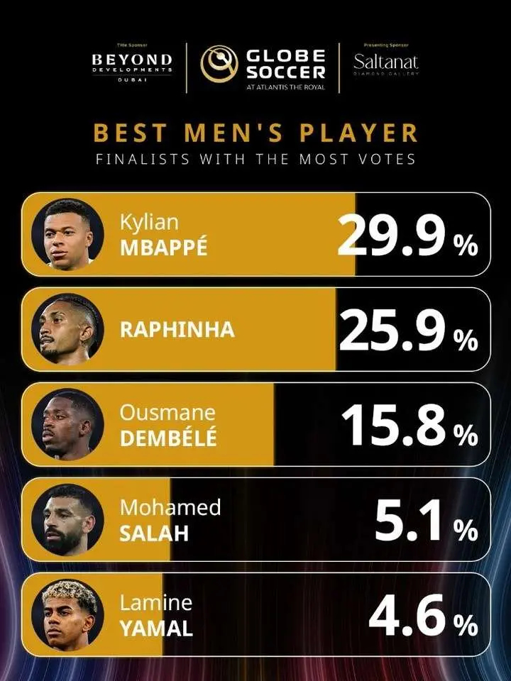 环球足球奖官方晒出了2025年最佳球员的投票情况前五名,他们是皇马、巴萨、利物浦、巴黎的球员,谁能获得最佳呢?姆巴佩--29.9%拉菲尼亚- -25.9%登贝莱--15.8%萨拉赫--5.1%亚马尔--4.6%