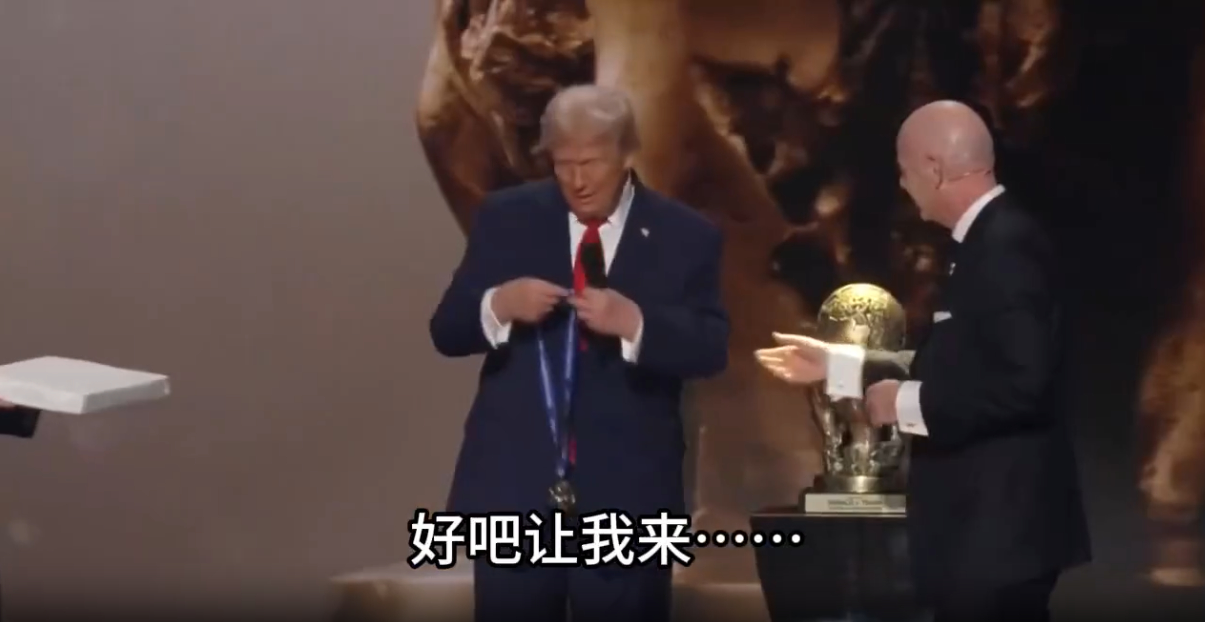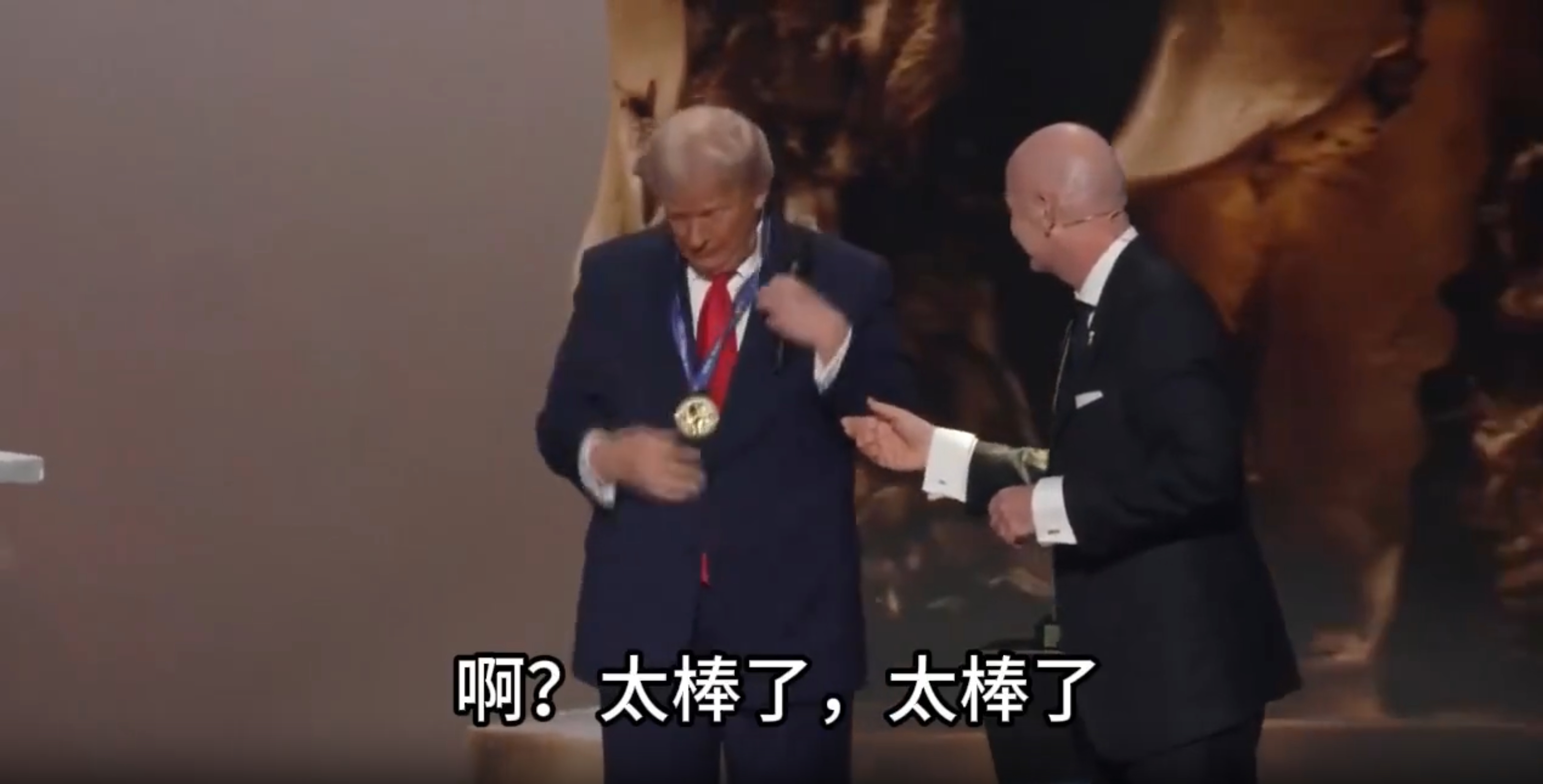国际足联颁发和平奖,特朗普自己给自己挂上了!在今年的世界杯抽签仪式上,国际足联专门为特朗普设立了“FIFA和平奖”。当足联主席凡蒂诺准备给他授奖时,特朗普突然拎起奖牌自己给自己挂上了。没人说他爱好和平,他喜爱的是“和平奖”,“奖”这个字不能省略。名也要利也要,主打一个不能少。为了这碟醋包了饺子,谁说外国没有人情世故。