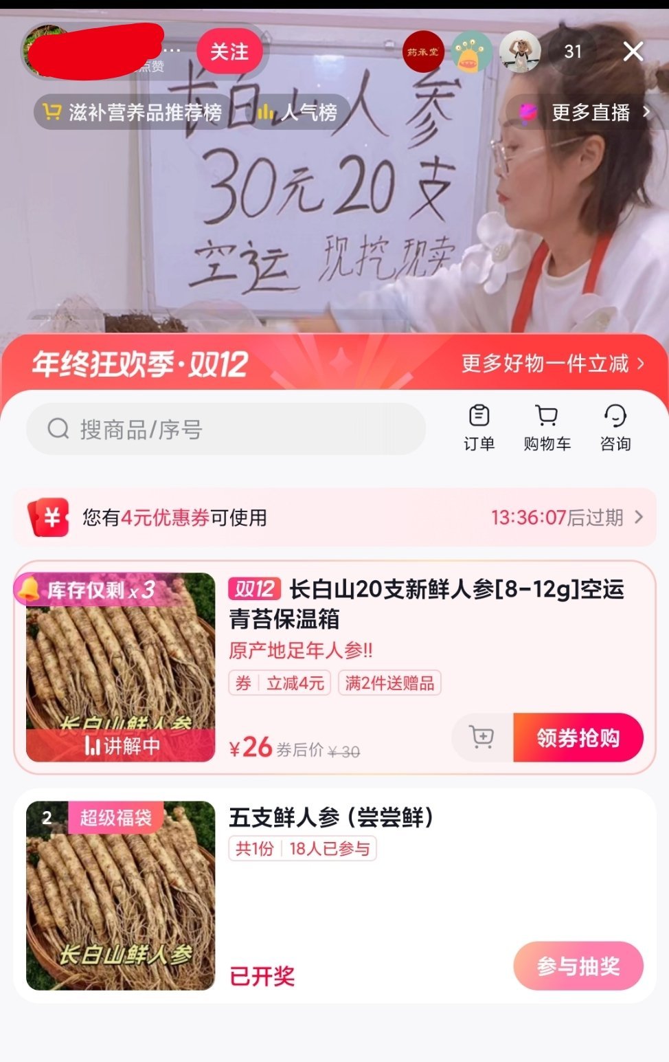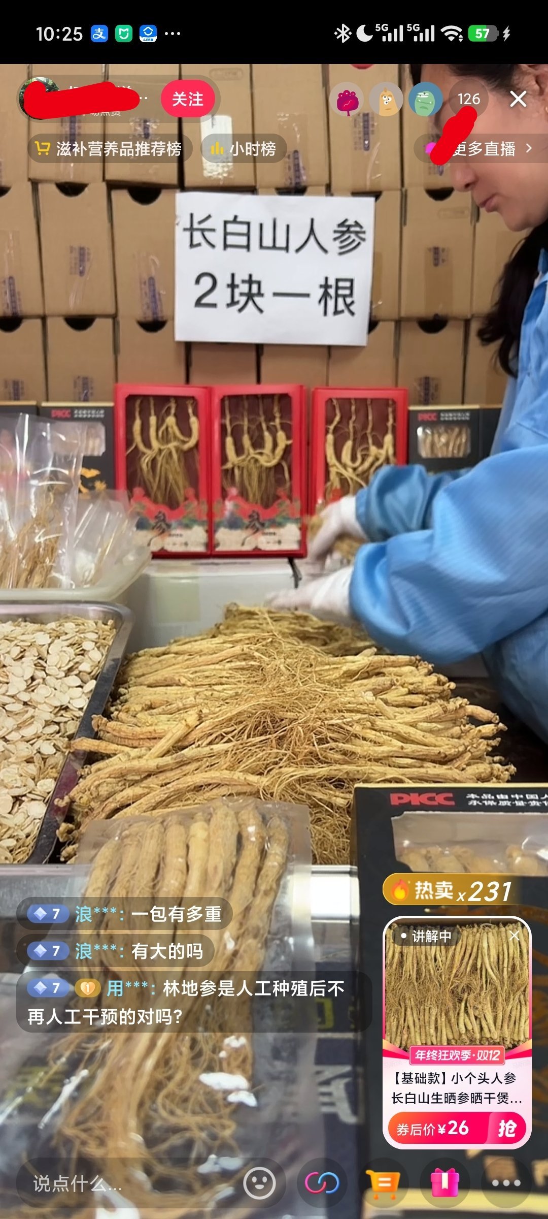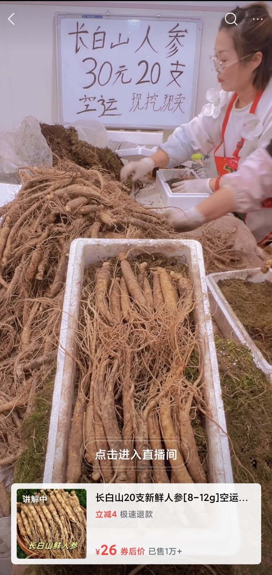 现在直播带货都这么发达啊!刚刚偶尔点开了两三个做长白山人参的直播间,里面的人参居然是2块钱一根,26块钱可以买20根。人参都这么便宜吗?这比萝卜也没贵多少呀!人参价格要这样的话,以后我就少吃萝卜,多吃两根人参了。