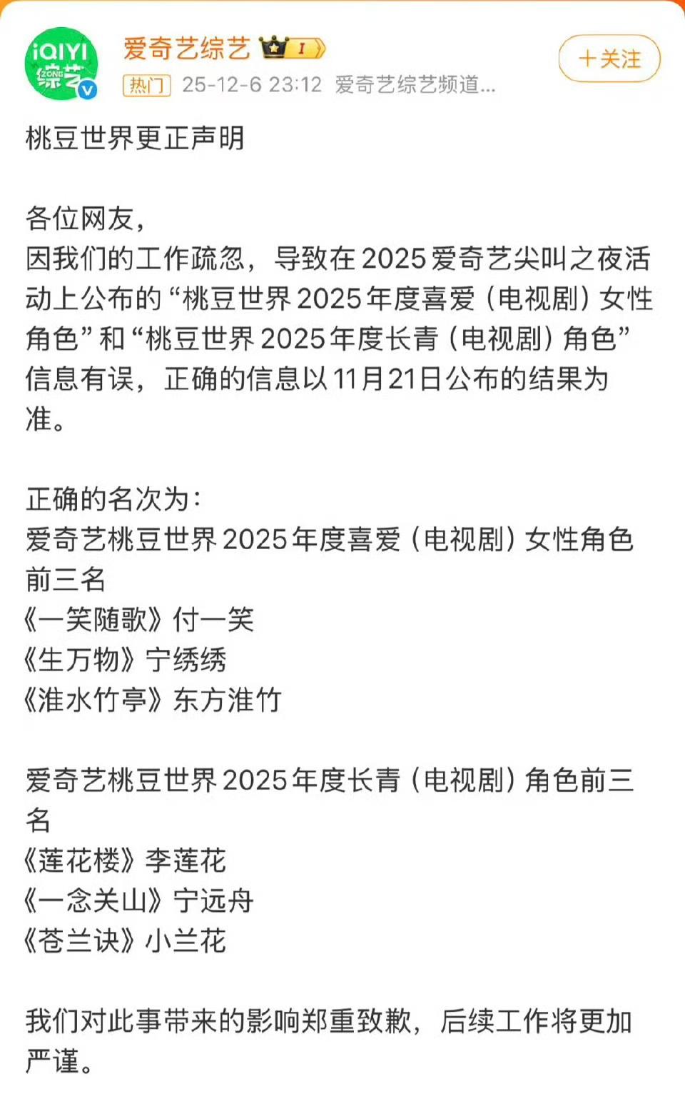 爱奇艺颁奖乌龙笑不活了!白鹿躺枪刘诗诗维权,2.4亿热度竟干不过1266万? 内娱颁奖礼能离谱到啥程度?爱奇艺尖叫之夜直接给大伙整了出“狸猫换太子”大戏,看完血压都上来了!😂 12月6号颁奖现场直接炸锅,之前公示好的“年度喜爱女性角色”榜单说改就改,刘诗诗《淮水竹亭》的东方淮竹,明明以2.41亿热度断层领先,居然被莫名除名,名额还硬生生换成了白鹿《临江仙》的李青月,后者热度才1266万,连零头都不够!这操作是数学老师退休太早,还是把观众当瞎子啊? 最冤的就是两位演员!白鹿纯纯躺枪背锅,啥也没干就被卷进争议;刘诗诗粉丝真金白银氪金投票,熬了无数夜冲热度,结果承诺的权益全泡汤,换谁能忍?必须要个说法!🙌 爱奇艺事后一句“工作疏忽”就想甩锅,连个正经道歉和补偿方案都没有,规则在这跟闹着玩似的! 你们觉得这是真疏忽还是暗箱操作?支持刘诗诗维权的扣1,心疼白鹿躺枪的扣2,来评论区聊聊你的看法!🔥 爱奇艺颁奖失误 刘诗诗东方淮竹 白鹿李青月 内娱颁奖抓马现场