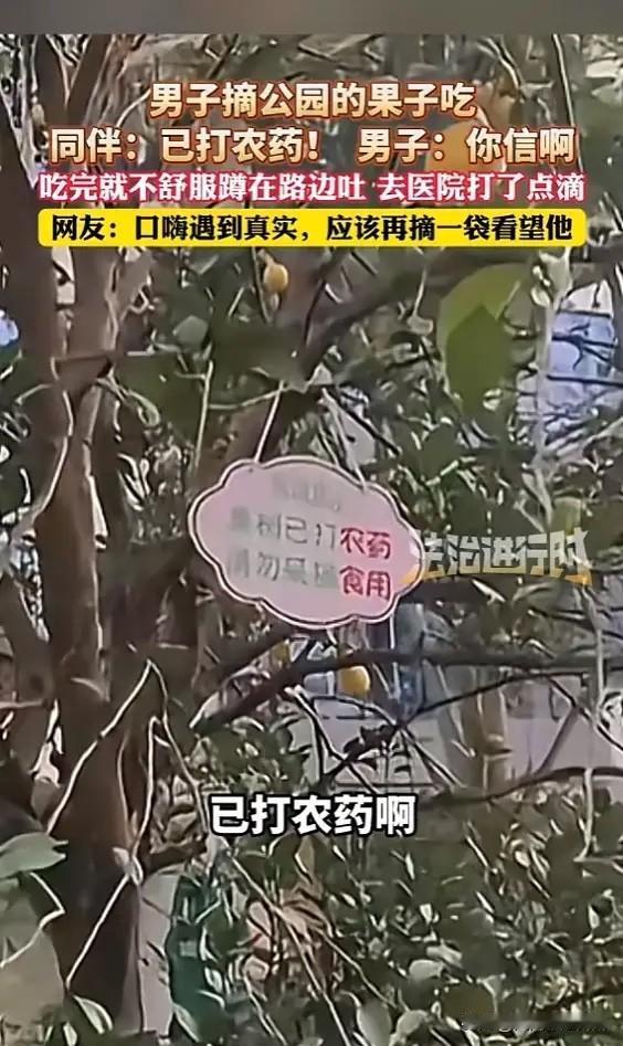 “这下后悔了吧!”近日,四川,一男子逛公园时,看见树上有果子,于是就想上前摘下来吃掉,同伴立马阻止,并指着警示牌说这个打了农药,可男子根本不信,依然将果子吃了下去,吃完后立马感觉身体不舒服,最后送往医院。网友:这下肯定信了。 那天下午天气不错,男子和朋友在成都的一个公园散步。路边果树结满了又大又圆的果子,男子伸手就要摘。朋友赶紧拉住他,指了指树干上醒目的警示牌:“果树已打农药,请勿食用!” 男子却笑朋友太小心,觉得牌子是吓唬人的,随手擦擦就咬了一口。 果子下肚没多久,男子突然捂着肚子蹲下,脸色发白,呕吐不止。朋友慌忙叫救护车送他去医院。路上男子还嘴硬,可胃里翻江倒海的滋味让他冷汗直冒。 公园里的果树为了防虫害,定期会喷洒农药。这些果子本质是景观作物,压根不是种给人吃的。有些树上打的杀虫剂毒性不小,误食可能引发恶心、抽搐,严重时甚至损伤神经系统。 绿化部门工作人员解释,路边银杏果、公园香橼这些常见果子,生长过程中会吸收土壤里的重金属,加上农药残留,安全性根本没保障。市场上卖的食用果有严格检测,而景观果树的培育土壤从不做食用标准检查。 男子洗胃后缓过劲来,嘟囔着“早知道听劝了”。网友调侃这是“一堂价值千元的体验课”,但更多人看到警示牌时都心存侥幸,觉得倒霉事不会轮到自己。 公园里挂警示牌不是摆设,每块牌子背后可能是真实教训。规则用最直白的方式划出安全线,忽略它往往要付出代价。 各位读者你们怎么看?欢迎在评论区讨论。
