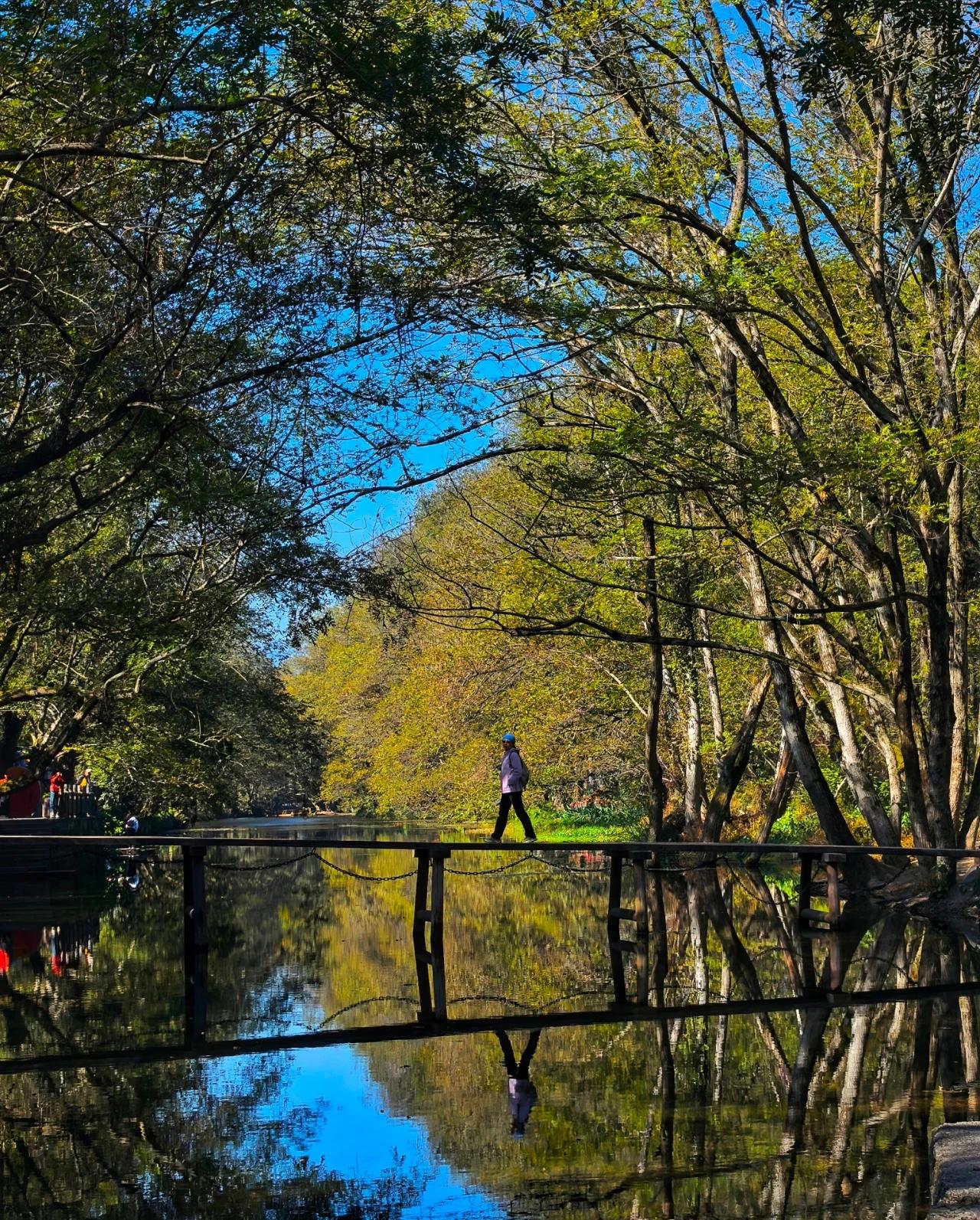 皖南深秋行纪 - 一村一境 “西溪南古村”隶属于黄山市徽州区,离“黄山北”站只有五公里。这个村子始建于后唐,经五代、两宋,鼎盛于明清,是徽商文化的重要发源地。 “丰乐河”一边是村子,一边是绵延数公里的枫杨林湿地。渡河中段时,顺着河道就可以看到高大的枫杨树,把河道掩映起来,和倒影一起构成一个绿色的隧道。 徽州自由行