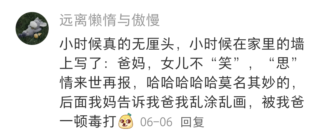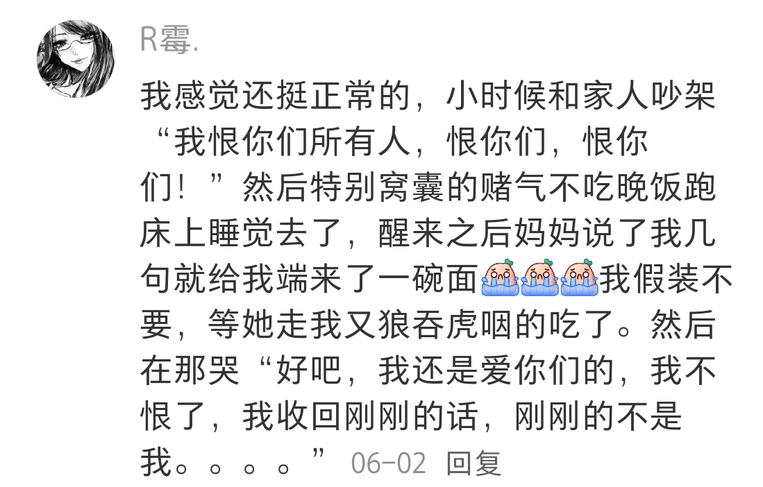 想到我小时候被我妈妈骂了,那时候午饭是吃面条趁我妈不注意往她碗里那份偷偷加了点盐