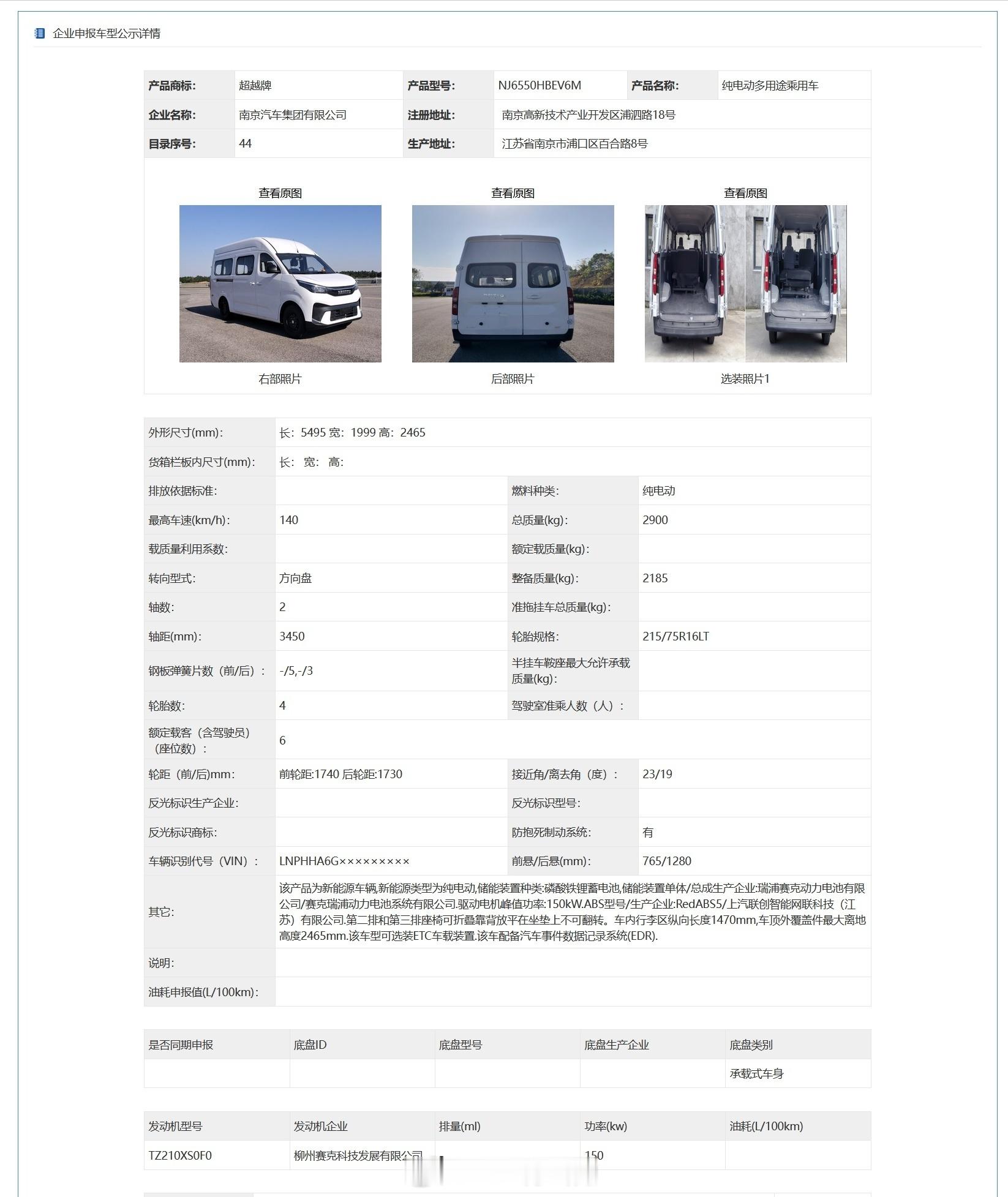 工信部车展 之第402批——南汽超越牌两款新车NJ6540FBEV85和NJ6550HBEV6M,都是纯电车。第一个不多说了,明显是用公模攒的,一样长相的车已经好几款了。第二个(图6-9)有点眼生,看不太出跟哪个车有共同点。不过这家伙的个头更大,车长已经顶到5.5米新规上限了,而且是两排座布局,感觉更偏向干重活。俩车的电机都是150kW,但完全两码事,第一个是珠海英搏尔的,最高车速120km/h;第二个是柳州赛克的,最高车速140km/h。新能源汽车 南京依维柯