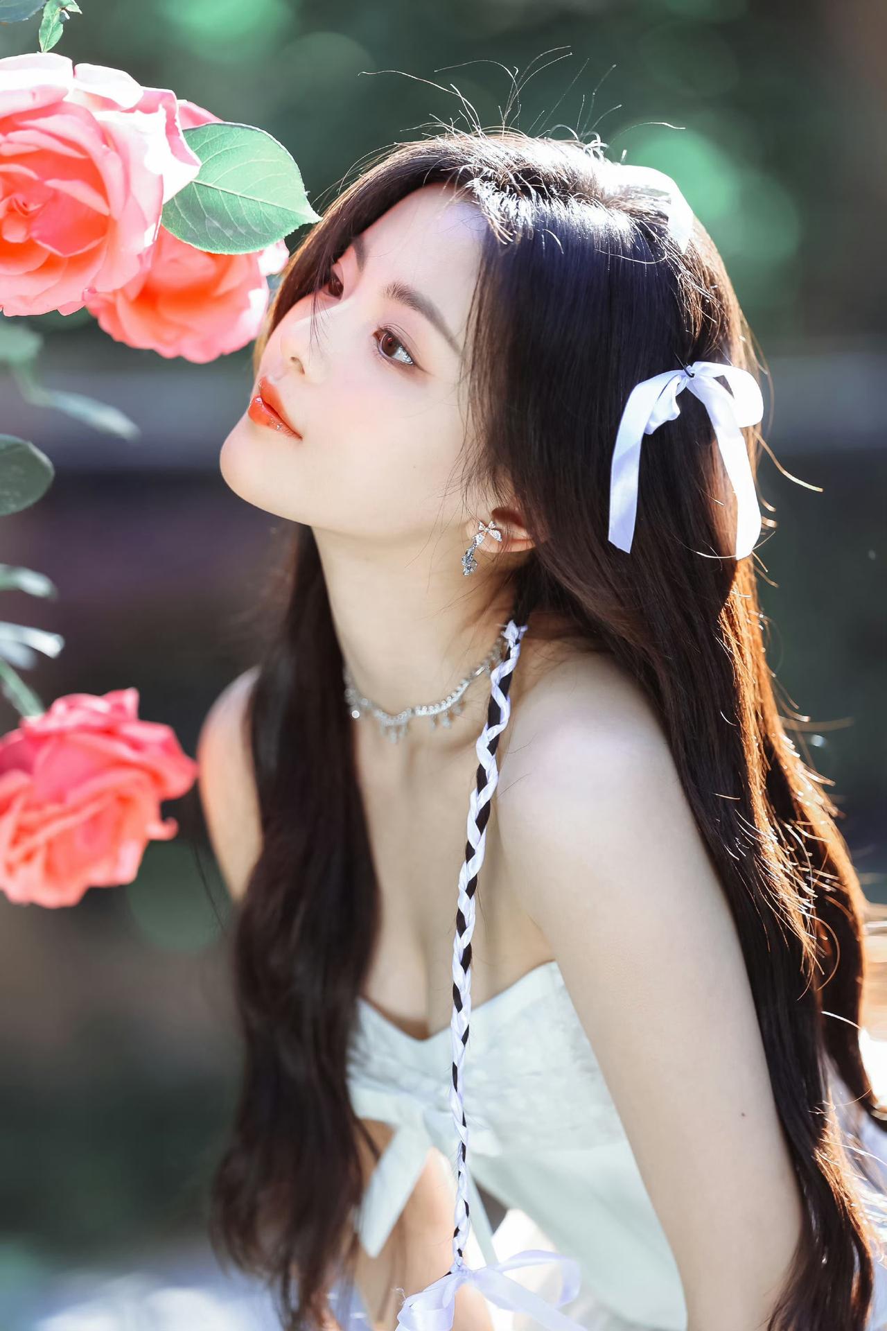 温柔少女,黑发蝴蝶结,白色蕾丝裙,清新自然。