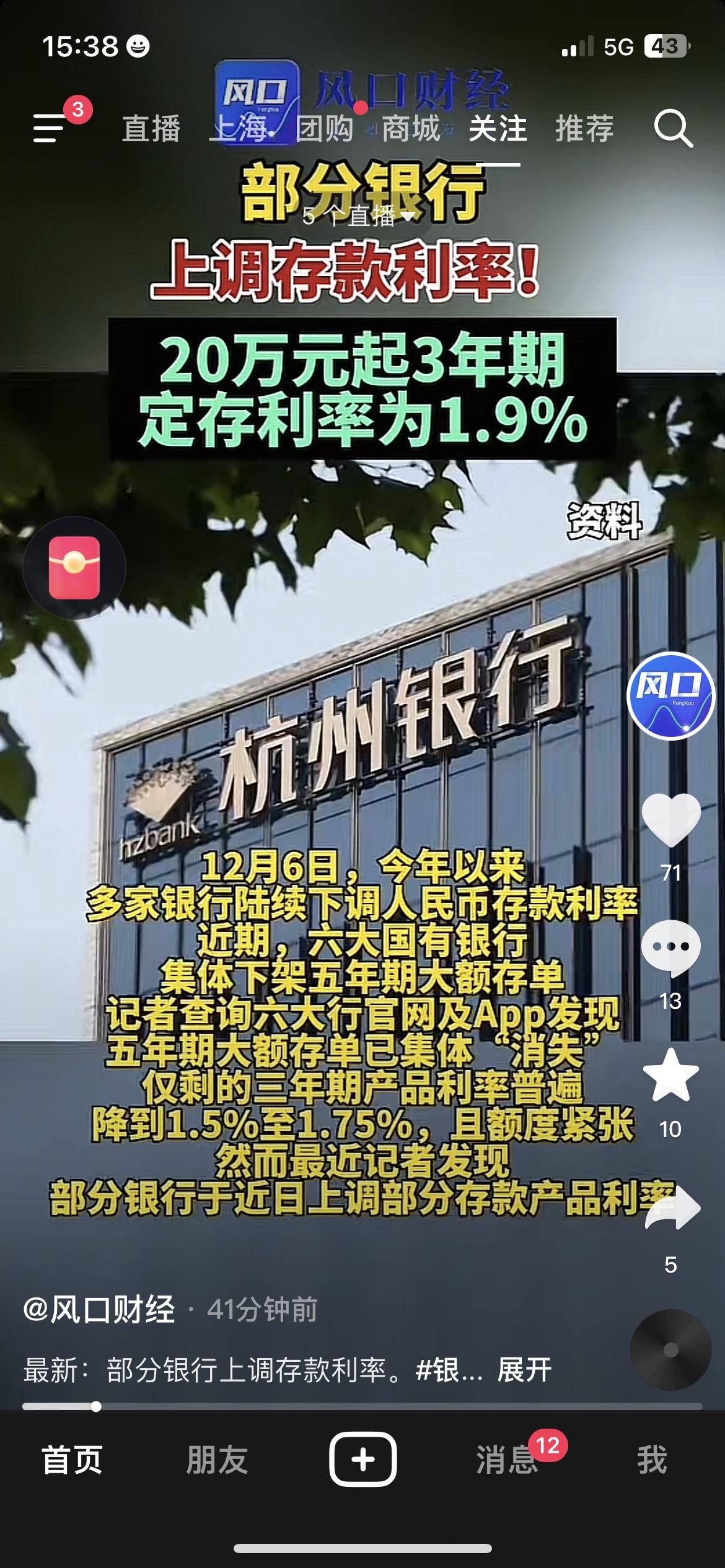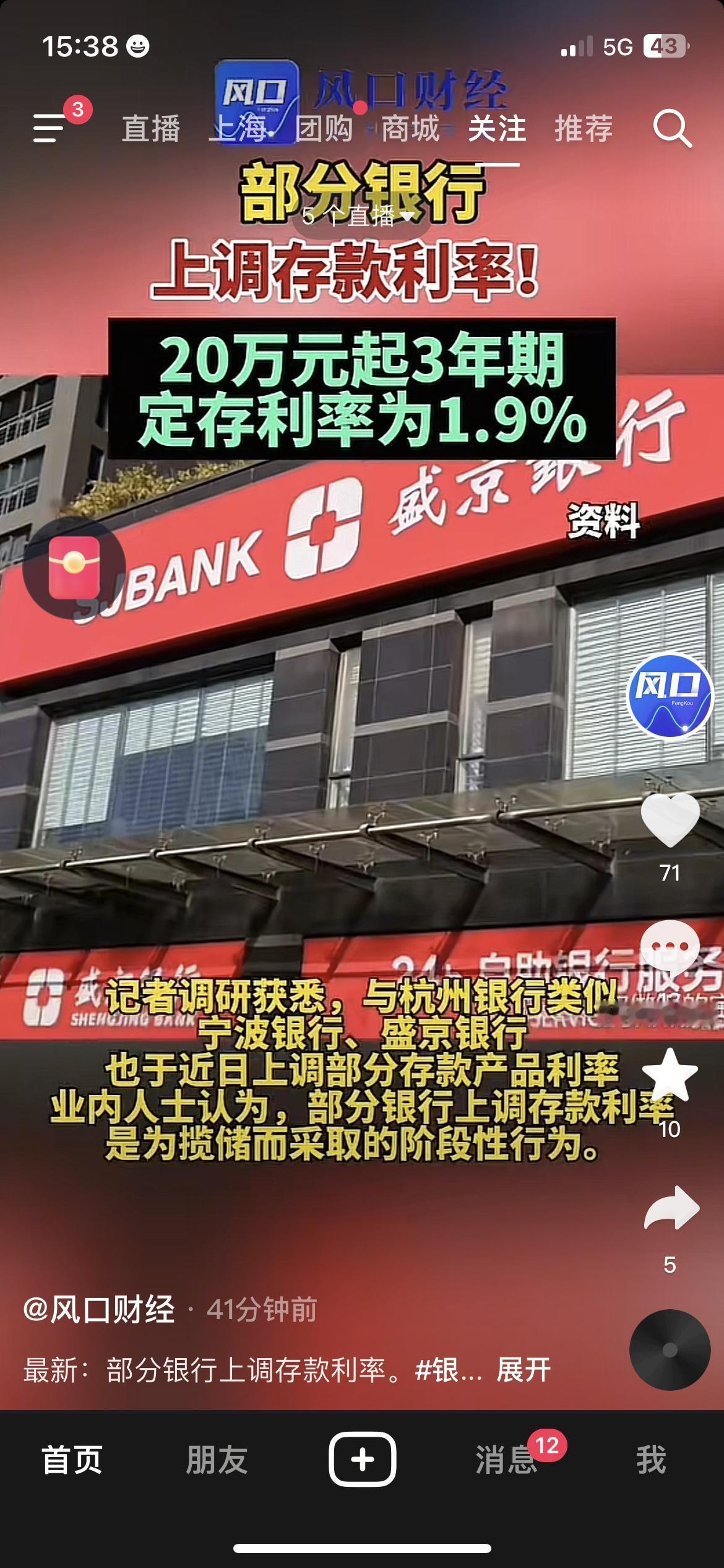 📈降息潮里的小惊喜!部分银行涨定存利息,20万起3年期利率1.9% 银行存款利率 个人理财攻略 最近发现不少银行悄悄调整了存款利率,杭州银行北京某支行最新消息,新转入资金20万起存3年期定存,利率能到1.9%,比之前上调了10个基点;5万起存的3年期定存,利率是1.75%,虽不算高,但在整体降息的行情里,也算难得的反向调整。 现在理财收益波动大,定存虽收益有限但稳妥,你手里的闲钱会选定期存款,还是选其他理财方式?