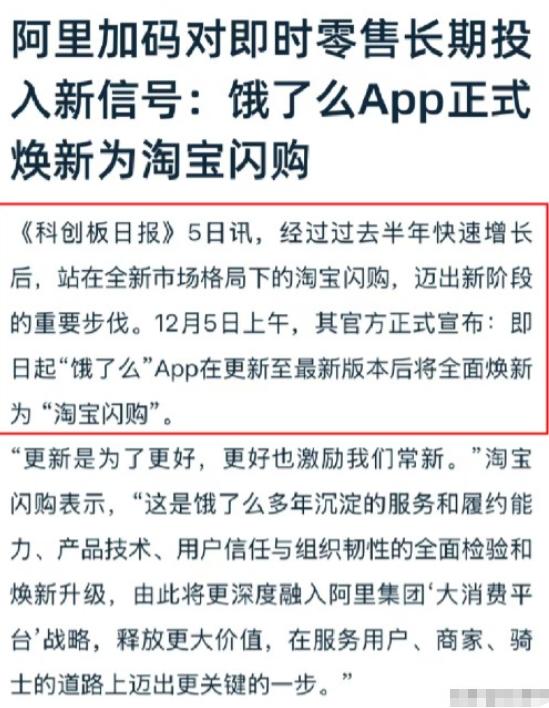 手机弹出的一则消息,很不简单,有几个关键点很多人可能没注意到! 说白了这就是阿里下的一盘大棋!不是简单换个APP图标、改个名字那么敷衍,而是要把咱们习惯的“点外卖”,直接升级成“万物30分钟到家”的消费革命,这波操作里藏的门道,90%的人恐怕只看了个热闹。 今天手机弹窗跳出来“饿了么正式全面焕新为淘宝闪购”,我一点都不意外,甚至觉得这一天来得还算晚了点。 这根本不是临时起意的决定,而是阿里憋了大半年的大招,从今年4月淘宝“小时达”升级成淘宝闪购,5月挤到手淘首页一级入口,再到7月砸500亿补贴,每一步都在为今天的“换血”铺路。 可能有人会说:“不就是换个名字吗?我点外卖还不是照样点?”这就错得离谱了!核心问题就出在“饿了么”这三个字上——在咱们的固有认知里,它就是“饿了才用”的工具,心智被死死绑在餐饮上。 你想啊,谁会第一时间想到用饿了么买手机、买衣服?这就是阿里最头疼的地方,哪怕早就布局了商超、医药等业务,也撬不动用户的刻板印象。 而这次焕新,就是要打破这个僵局。一边是饿了么沉淀18年的“硬实力”——覆盖全国的即时配送网络、上百万商户资源;另一边是淘宝的“流量王牌”——10亿年活跃买家。 这俩一结合,简直是如虎添翼,数据就是最好的证明:公开信息显示,过去半年里,淘宝闪购日订单峰值曾达到1.2亿单,8月周日均订单约8000万单,月度交易用户已突破3亿,还带动手淘日活同比增长约20%。 更关键的是,这波操作直接改写了行业玩法。 以前外卖平台拼的是补贴、拼佣金,说白了就是“价格战”;现在阿里玩的是“生态战”,把餐饮这种高频需求,当成带动数码、服饰、生鲜等低频即时零售的“敲门砖”。 就像过往天猫双11期间,曾有近600个品牌即时零售成交破亿,天猫品牌即时零售日均订单较9月增长198%,这就是协同效应的威力。 咱们普通消费者能感受到的变化,其实更实在。以前买根数据线、一袋大米,要么等快递好几天,要么专门跑一趟超市;现在打开淘宝闪购,30-60分钟就能送到家。 对商家和骑手来说,变化也不小:餐饮商家能顺带卖网红零食,不用自己备货;便利店能蹭上淘宝的亿级流量;骑手配送场景多了,订单高峰和餐饮错峰,收入也可能跟着涨。 当然,转型期肯定有适应问题,比如有些老商家不懂淘宝的流量规则,骑手对新管理模式有顾虑,但这些都是整合中的小插曲。 行业专家也说了,未来1-2年,即时零售的竞争焦点会集中在三点:谁能更低成本实现“30分钟达”,谁能留住优质商家,谁能平衡补贴和利润。阿里这步棋,就是提前抢占这些关键点。 据公开报道,蒋凡曾预计,未来3年内,闪购和即时零售可能给平台带来1万亿元的交易增量。不过大家也别觉得阿里会一直猛砸钱,管理层曾提及,下个季度投入可能会显著收缩,会根据市场竞争动态调整策略。 最后说句实在的,这篇内容只是我的个人看法。饿了么变淘宝闪购,到底是能改写行业格局,还是会遇到新的挑战,还得看后续落地效果。 你手机里的饿了么更新了吗?你觉得这种“万物即时达”的模式,会成为未来的消费主流吗?欢迎在评论区聊聊你的看法。