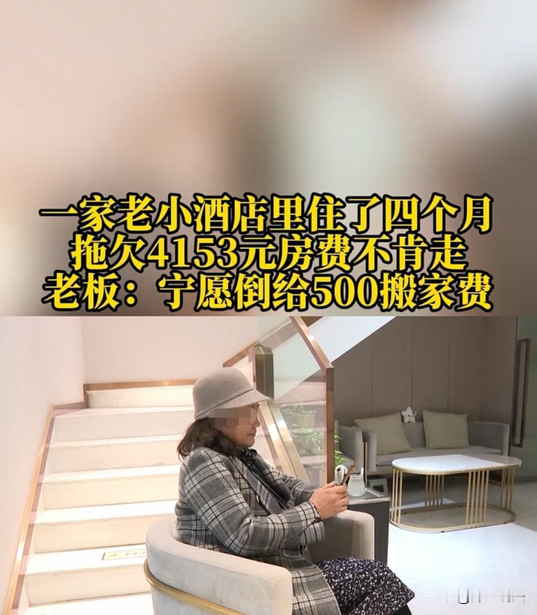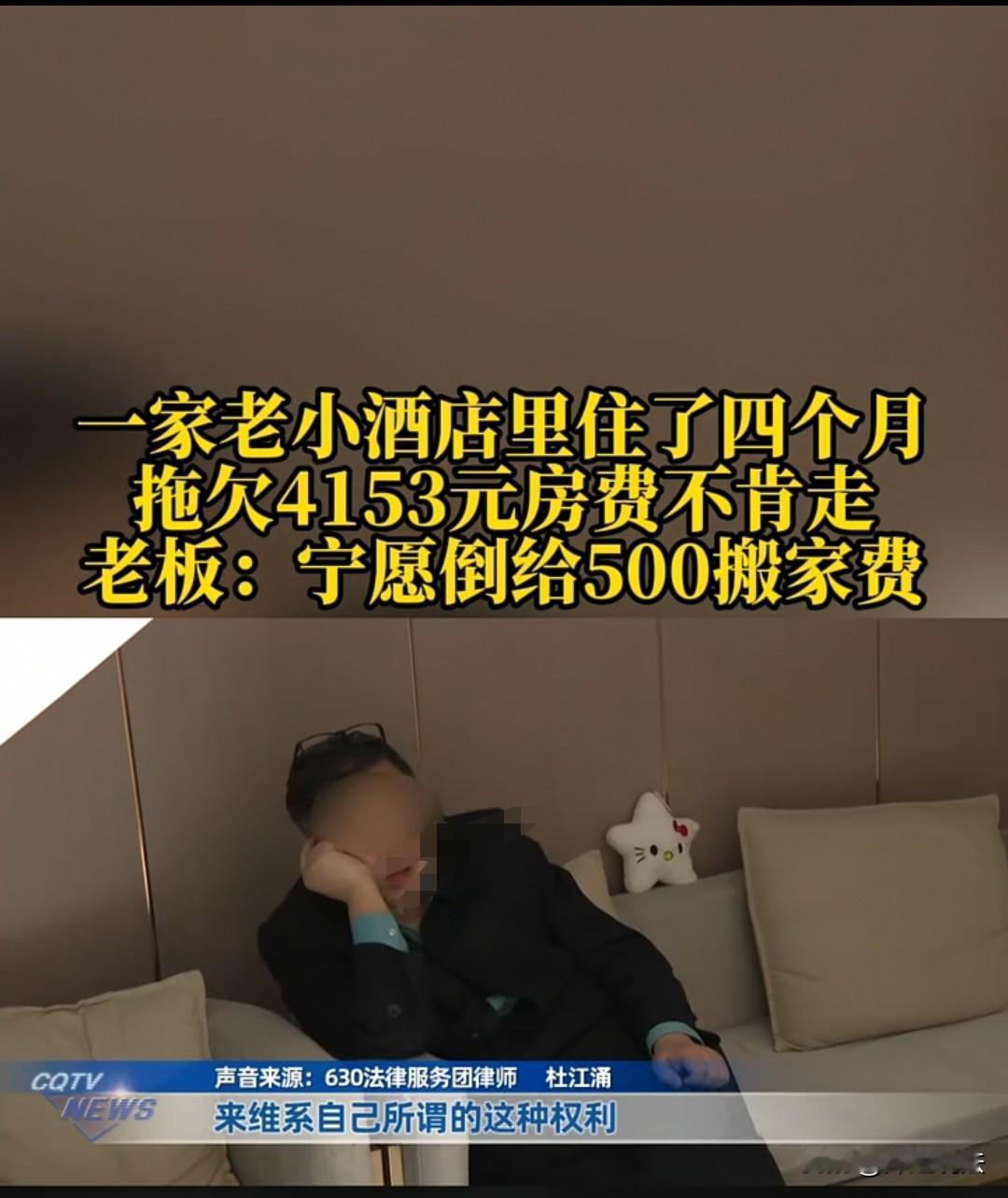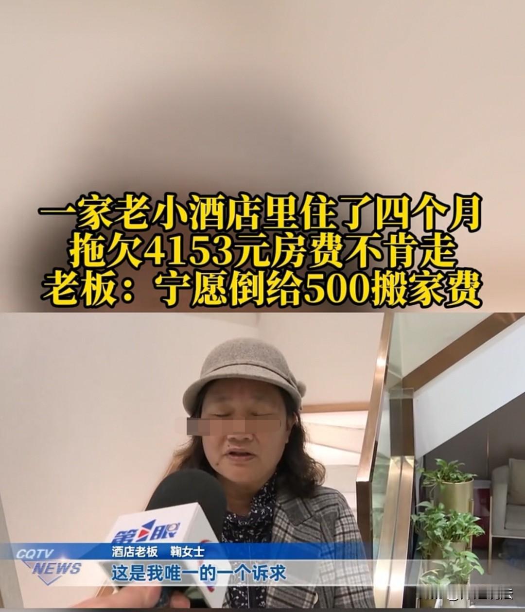 重庆,男子带着80岁的老母以及十岁的儿子住在酒店,已经欠下4153元费用。店家却愿意倒给他们500元,不要求他们支付房费,还帮他们搬家,让他们离开,但对方都不同意。男子每天还会留一个人值守,不让他人侵入。最后,店家只能把水电都停了,但对方还是不搬走。店家生怕他们住在里面出事情,可面对80岁的老人和十岁的孩子,又不忍心强制撵他们,只想通过记者来帮忙协商调解。可男子说自己没有房子,也没有钱,现在正在处理一起官司,住在这里有利于他办理事情,还说等拿到钱后,肯定会立即支付房费。但店家不想再拖了,想让他们马上搬离,还和男子理论了起来。男子直接来了一句:“你算哪把夜壶?”随后便摆摆手离开了,完全不搭理店家。 鞠女士最近遇到一件烦心的事情。本来在7月31日,吴先生住进酒店的时候,她还非常高兴,因为对方是常住客人。 直到10月7日,吴先生都一直按时支付房费,而且每天房费是140元。这对于鞠女士来说,也省心不少,不用再费心招揽顾客。毕竟客人有钱、讲信用,长期居住在这里,对店家来说是件好事。 可是到了10月8日,吴先生突然交不起房费了。鞠女士虽然上门催收,但吴先生说暂时给不出钱,让鞠女士再等等。 鞠女士觉得,之前几个月吴先生都按时缴费,也不差这一天两天,就允许他继续入住,约定事后再补缴房费。 可事情越来越离谱,两个月过去了,吴先生还是一分钱都没交,算下来,已经欠下4153元房费了。 鞠女士觉得再这样下去不行,吴先生可能是真的没钱,要是以后欠款越积越多,他就更付不起了,于是决定跟吴先生摊牌,让他离开,另寻住处。 可吴先生却不愿出面沟通,鞠女士也进不了他们的房间——因为他们每天都会留一个人值守,服务员一扫卡开门,脚还没踏进去,对方就直接把门锁上,或者当场反锁。 鞠女士没有办法,只能打电话跟吴先生协商:“你们还是离开吧,我们这个小店,你们一直不付钱,我们根本无法正常经营,拜托你们另谋住处。” 但是吴先生这边好像无动于衷,就连他80岁的老母也理直气壮地表示:“我们住在这里又不是不付房费,只是暂时没交而已。” 面对记者想要采访,他们也不乐意,还直接怼了一句:“你们有什么权利来管我们?有什么事去找我儿子,不要来骚扰我。”随后就把门反锁,关门时差点还闪到了服务员的腰。 最后,鞠女士无奈地说,面对这样的情况,他们想了各种办法,甚至把这间房的水电都停了,想逼迫他们自行离开。 可吴先生一家硬是赖在里面不走。这样一来,鞠女士也怕这三个人在房间里出什么问题,到时候店家要负连带责任。 可要说强行砸门撵他们走,鞠女士又做不到——看着80岁的老人和10岁的孩子要经历这样的场景,她生怕他们受不了,实在于心不忍。 但另一方面,自己的小店被人长期无偿占用,还欠着一笔房费,她确实承担不起,最后只能找来记者帮忙调解。 不过,吴先生也表示:“你们可以去起诉我,我就是一个普通消费者,我和店家之间只是经济纠纷,我又没犯多大错,你们要钱可以走正规法律流程。” 可鞠女士哪想那样折腾?她只想好好协商,能和平解决就和平解决,不想给自己找麻烦。 于是她一退再退,愿意倒给吴先生500元,还找了搬家公司帮他们搬东西,就连那4153元的房费也不再追究。她只有一个目的:让吴先生一家搬走,另行安置。 可即便开出了这么优惠的条件,吴先生还是不愿意,直接起身不愿再和鞠女士沟通,还撂下一句:“你算哪一把夜壶?”随后便摆手走人。 鞠女士对着记者委屈地说,自己从小到大从来没遇到过这样的人,凡事都要讲个理,对方却硬是赖着不走。现在她也准备走法律程序了,实在不想用强硬的方式撵他们,毕竟还有80岁的老人和10岁的孩子,她实在下不了狠心。 一、鞠女士未强行敲门驱赶,属善意之举,但对方却抓住这一点赖着不走,显然侵犯了鞠女士的合法权利 《民法典》第五百七十七条:当事人一方不履行合同义务或者履行合同义务不符合约定的,应当承担继续履行、采取补救措施或者赔偿损失等违约责任。 吴先生与酒店存在住宿服务合同,欠租4153元且拒不搬离,属不履行付款及腾退义务的违约行为,侵犯了鞠女士的经营与财产权益,需承担付欠款、腾房等责任。 二、吴先生明知自己理亏,却仍赖着不走,虽不构成寻衅滋事,但可报警协助处置 《关于办理寻衅滋事刑事案件适用法律若干问题的解释》第一条:行为人因婚恋、家庭、邻里、债务等纠纷,实施殴打、辱骂、恐吓他人或者损毁、占用他人财物等行为的,一般不认定为“寻衅滋事”,但经有关部门批评制止或者处理处罚后,继续实施前列行为,破坏社会秩序的除外。 本事件中,双方争议属经济纠纷,吴先生无严重扰乱公共秩序的行为,不构成寻衅滋事,但鞠女士可报警固定证据、协助调解,最终可通过诉讼要求其强制腾退。 对于此事,大家如何看待? 素材来源于重庆天天630,2025年12月6日报道